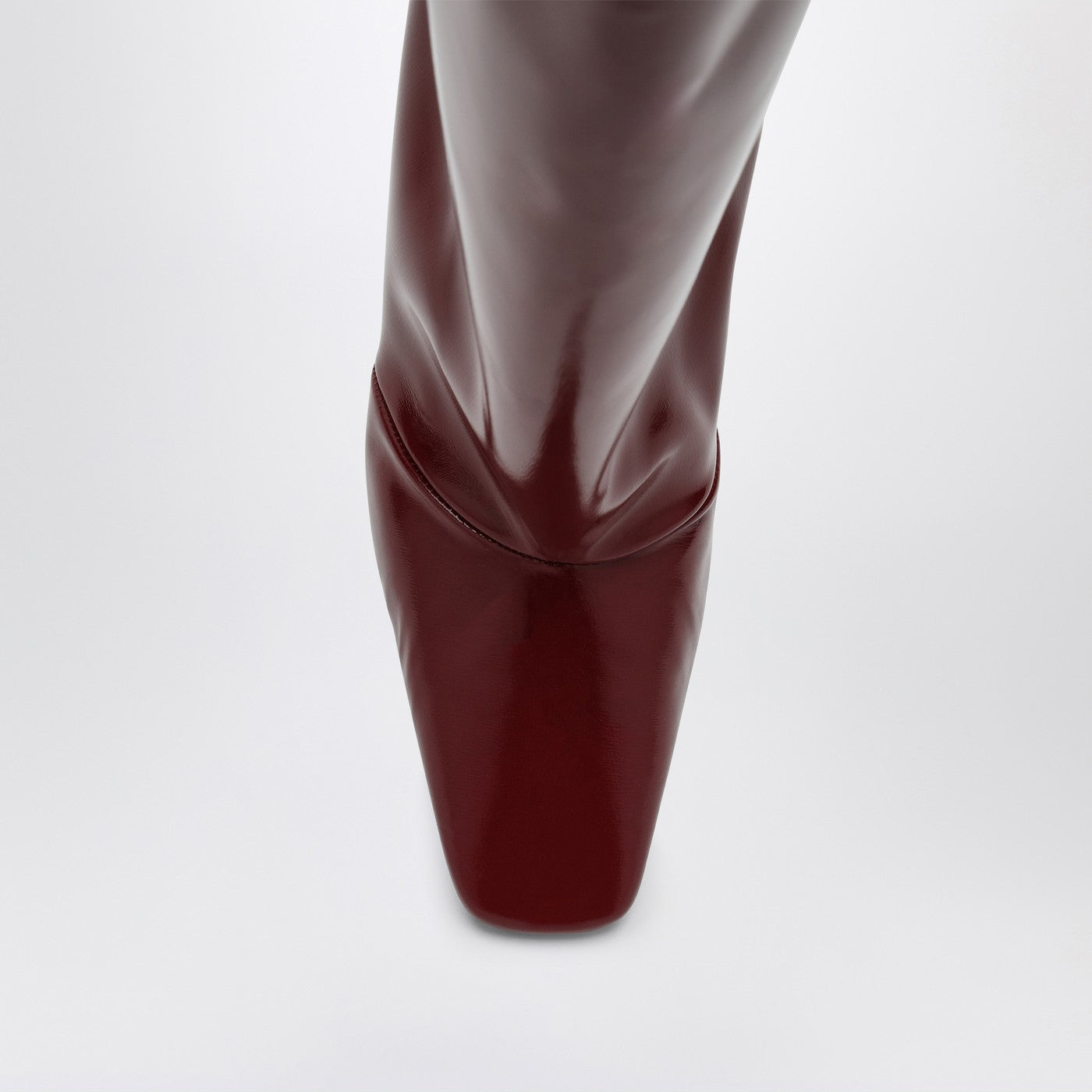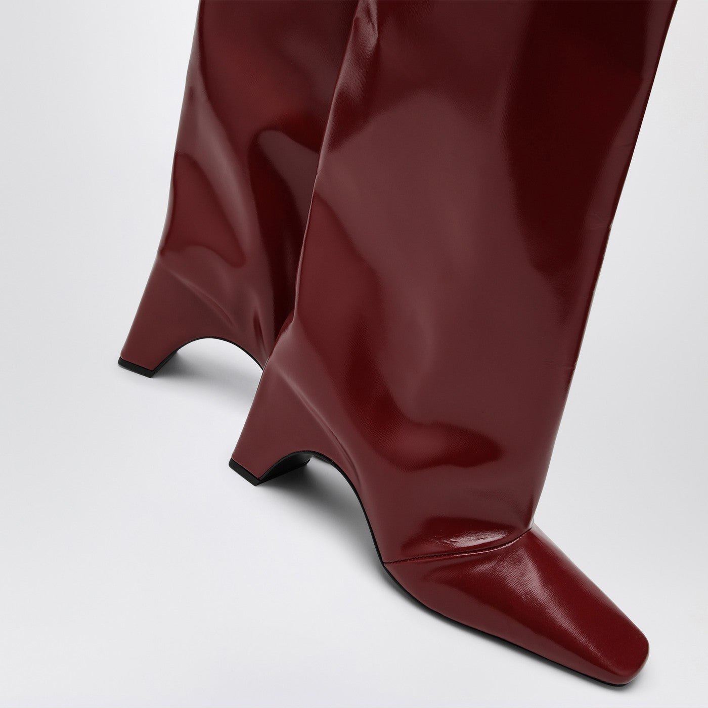 Hight Boots by Coperni in glans rood leer, met een kniehoge bootleg, puntig ontwerp, in reliëf side-logo en vierkante hiel.