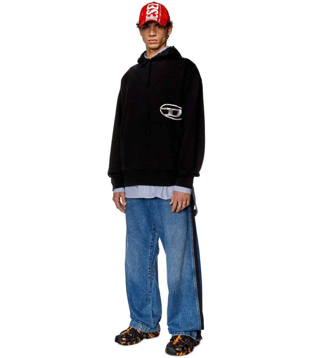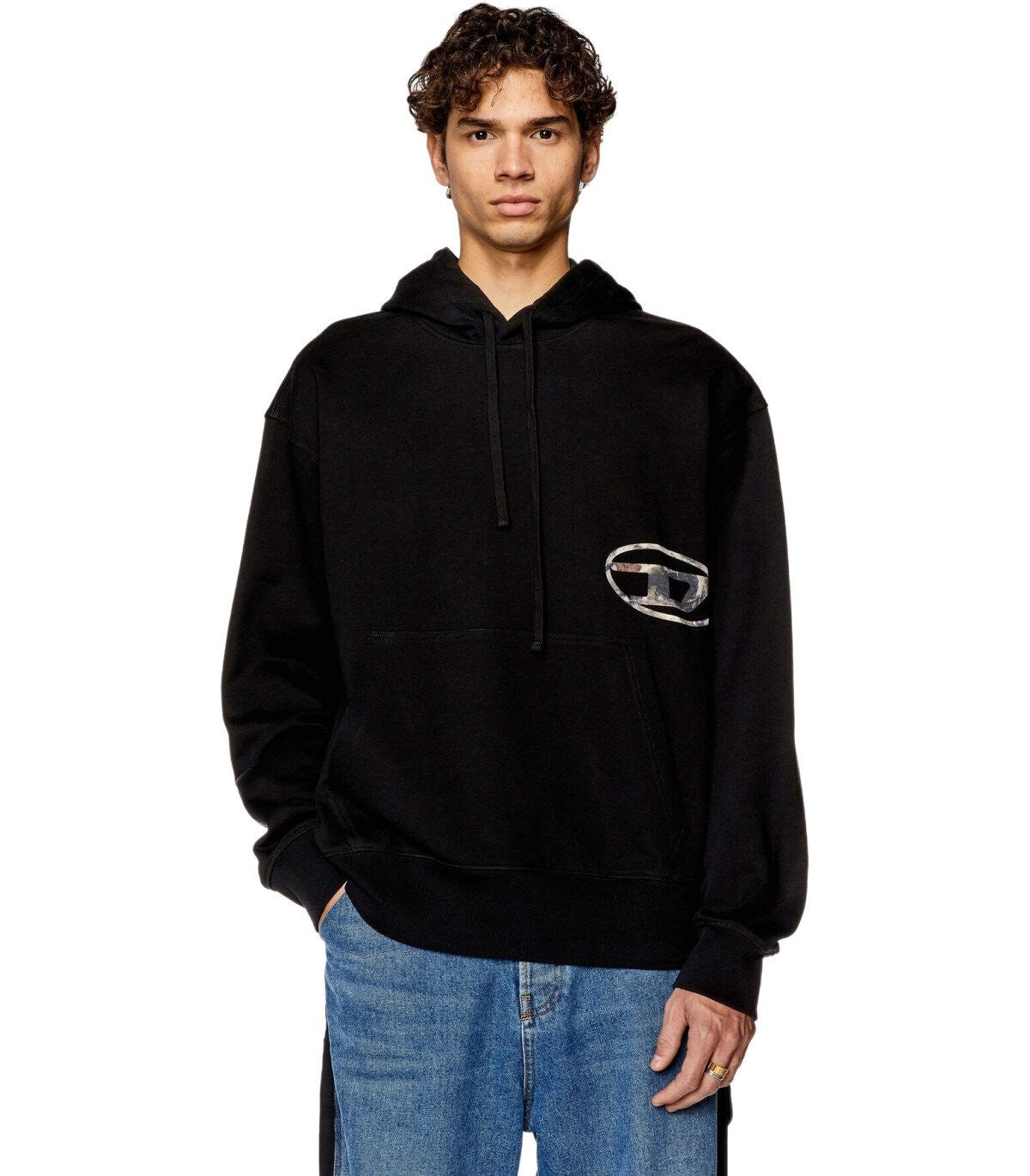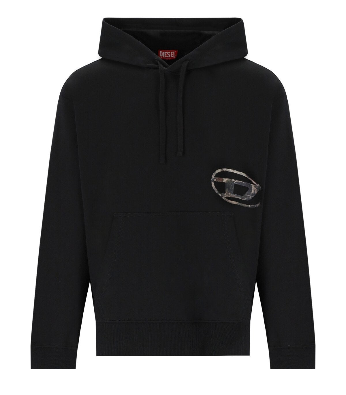 Diesel hoodie gemaakt van zwart katoen met planeetlogo -print op de voor- en achterkant. Kangoeroe -pocket, trekkoordkap, geribbelde manchetten en zoom. Losjes. Het model is 182 cm lang en draagt maat L. Dit item wordt groot, we raden aan om één maat kleiner te kopen dan uw gebruikelijke maat. Samenstelling: 100% katoen.