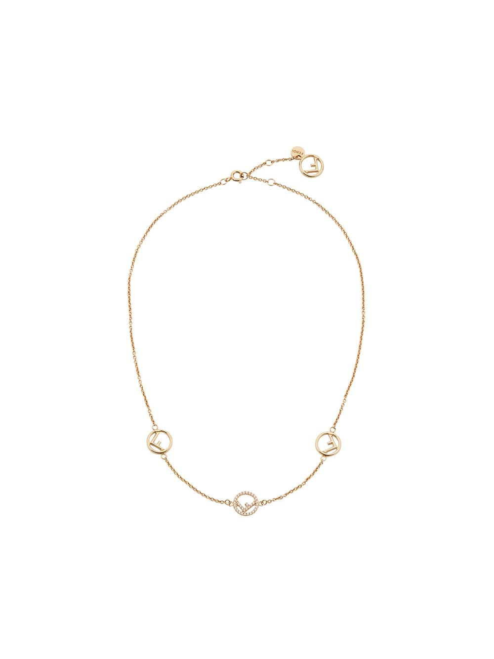 Fendi creates the ultimate baubles to adorn the directional ready-to-wear collections. The signature line of costume jewellery is defined by delicate linear monogramming, wrapped leather cuffs and geometric layered pastel stones. Gold-toned bronze and zirconium short logo charm necklace featuring a lobster clasp closure and an engraved logo charm.
