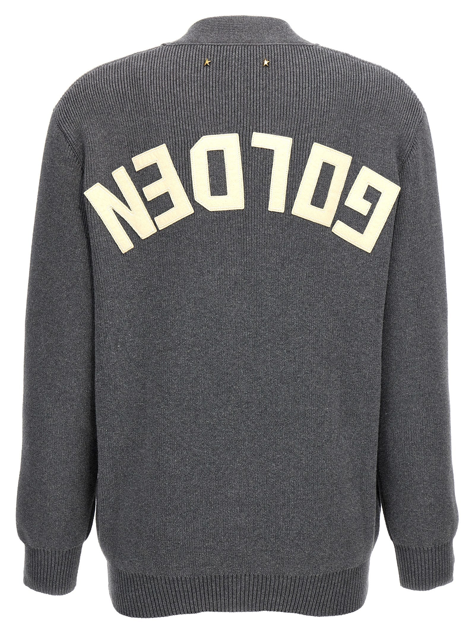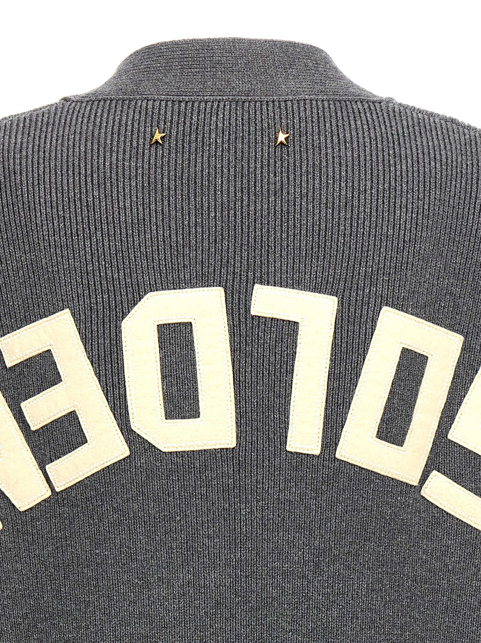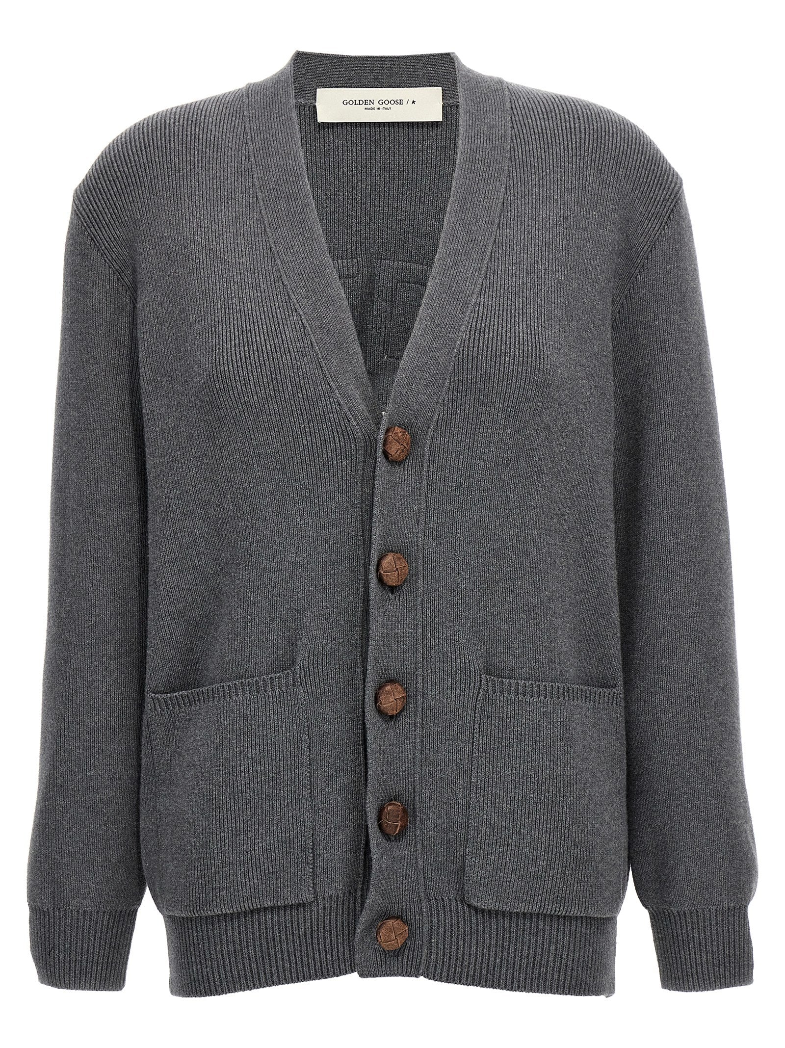 Katoenmix gebreide vest met lederen knoppen, voorzakken, v-hals, achterste logo-patchdetail, lange manchethonden.