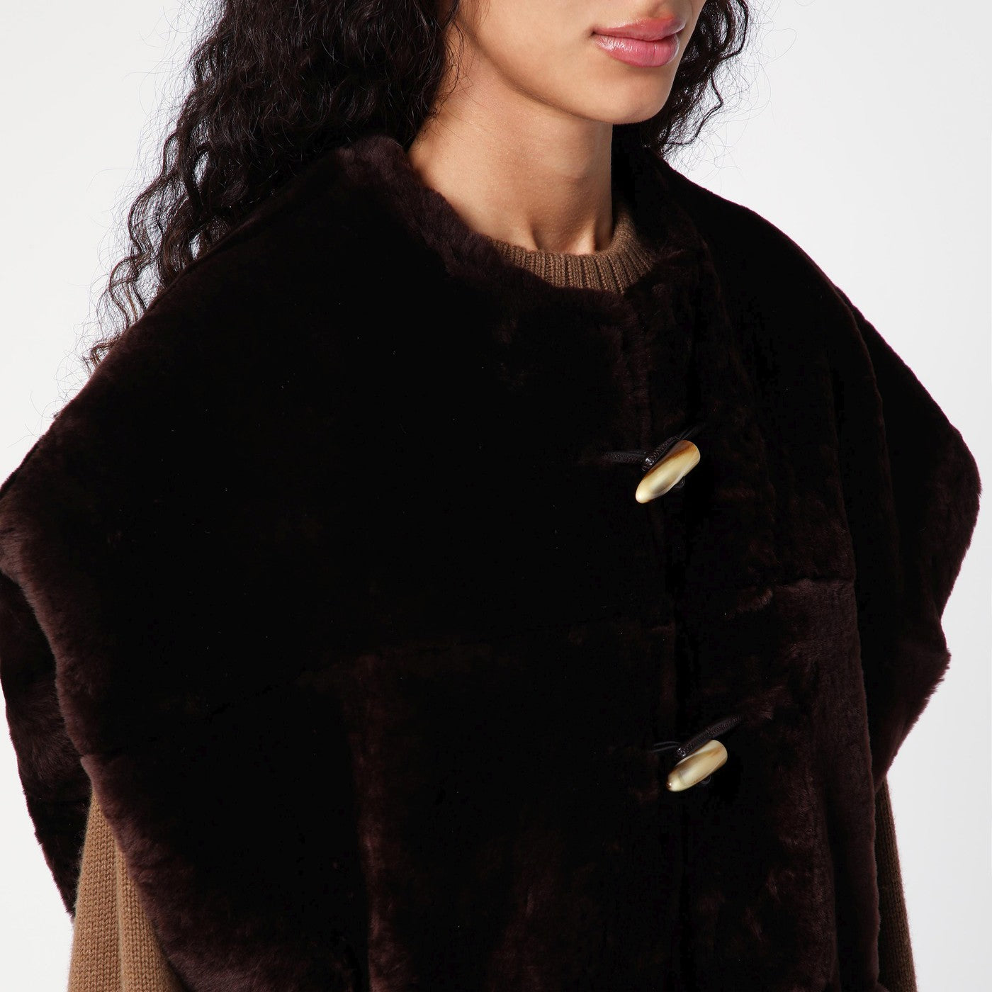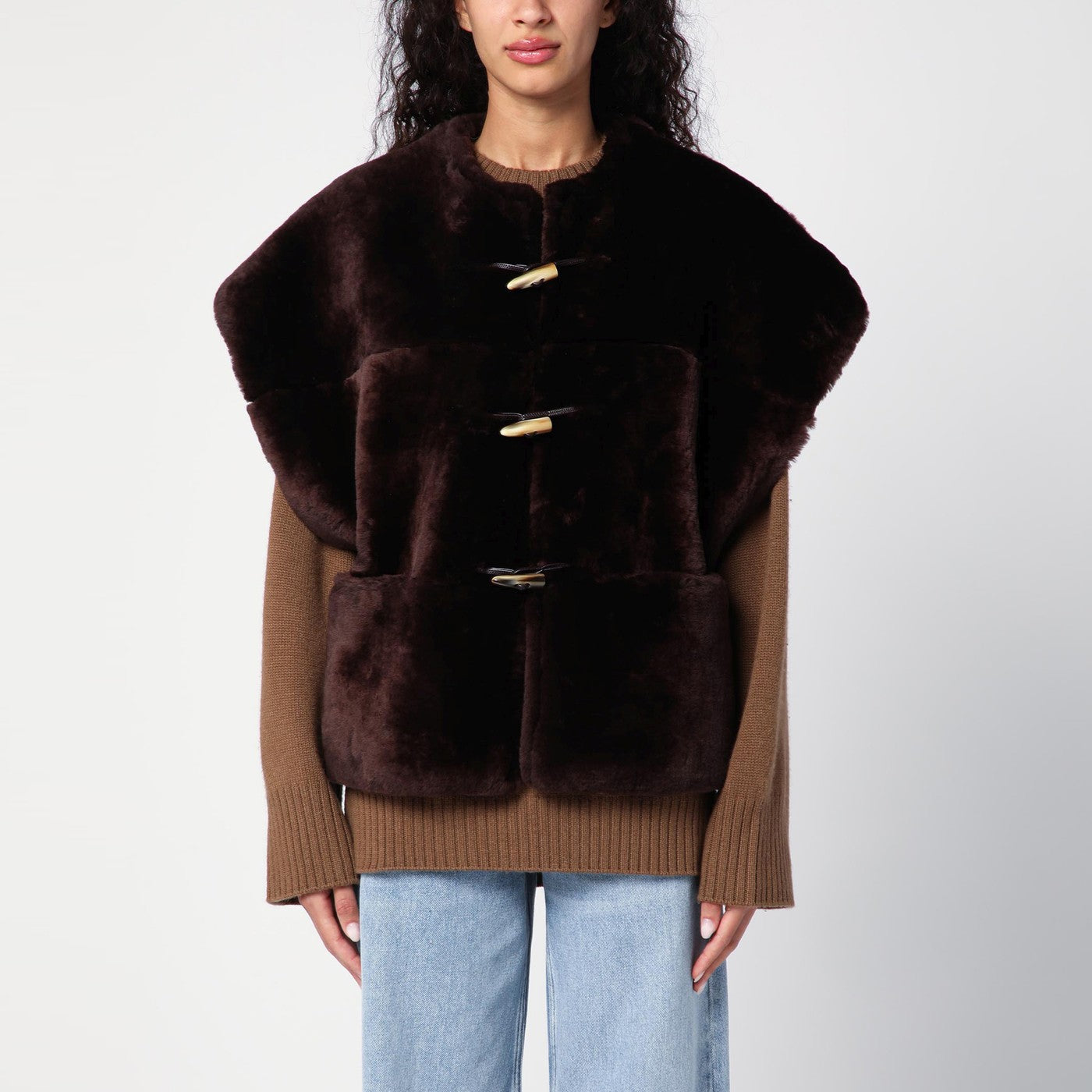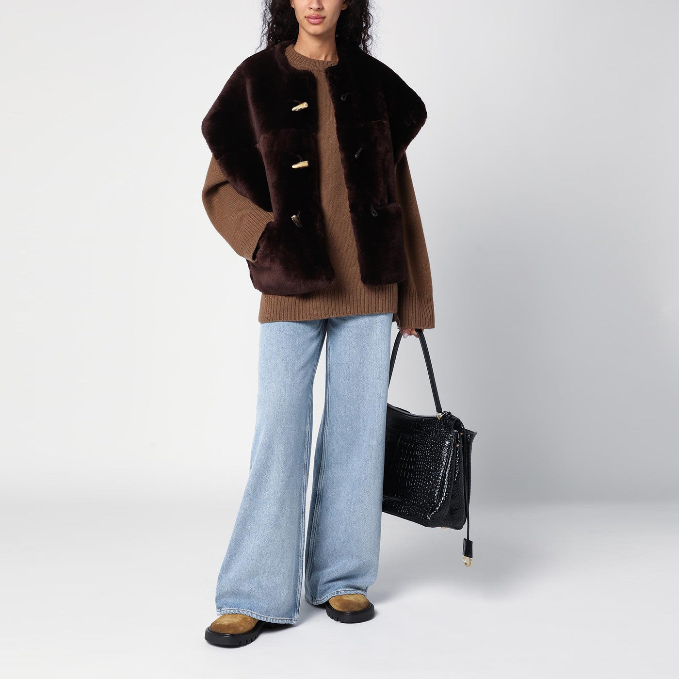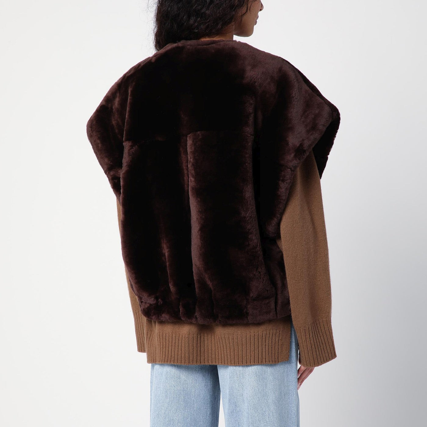 Bruine faux bont Crewneck -dop van Halfboy, heeft een voorste knoopplacket, twee zijkant -laszakken en korte brede mouwen.