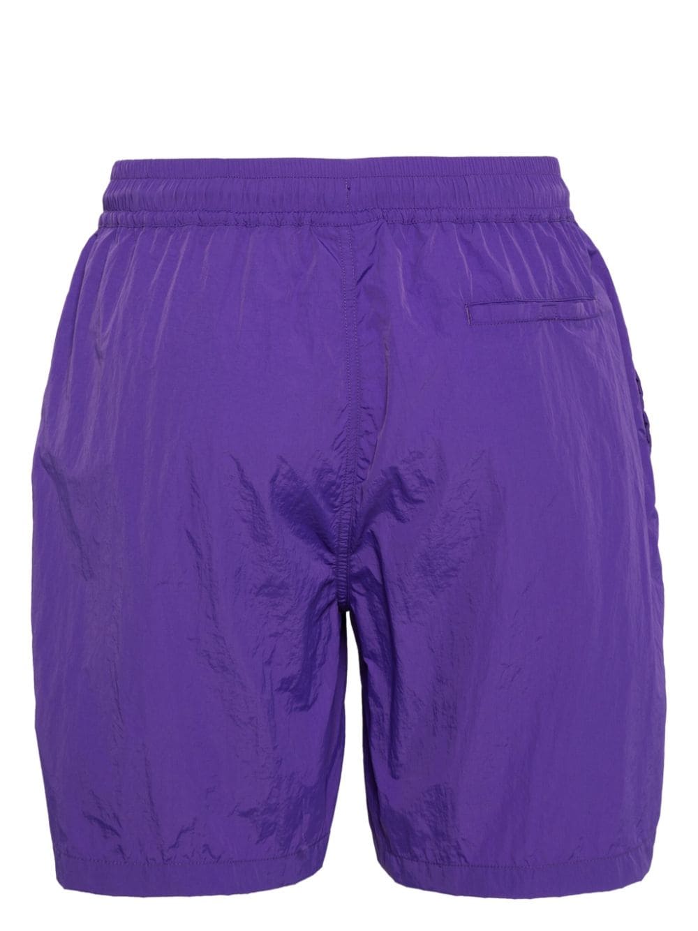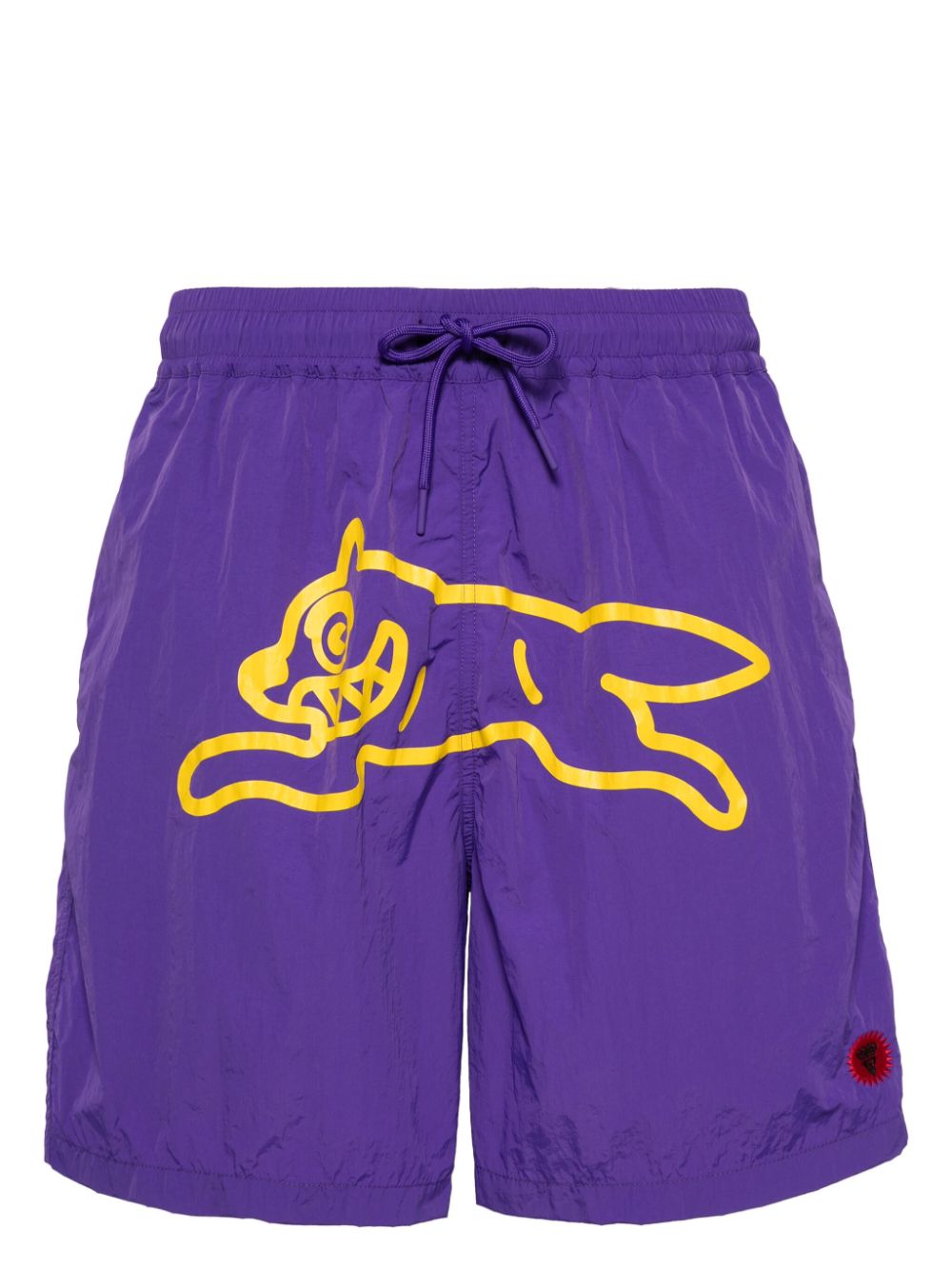 paarse/gele gestructureerde afwerking elastische tailleband Twee zijzakken Twee zakken lopen honden afdrukken naar het voorste geborduurde logo aan de zijkant achterste laszak gedeeltelijke voering dijlengte trekkoord taille wees er zeker van om zwemkleding over je eigen kleding te proberen.