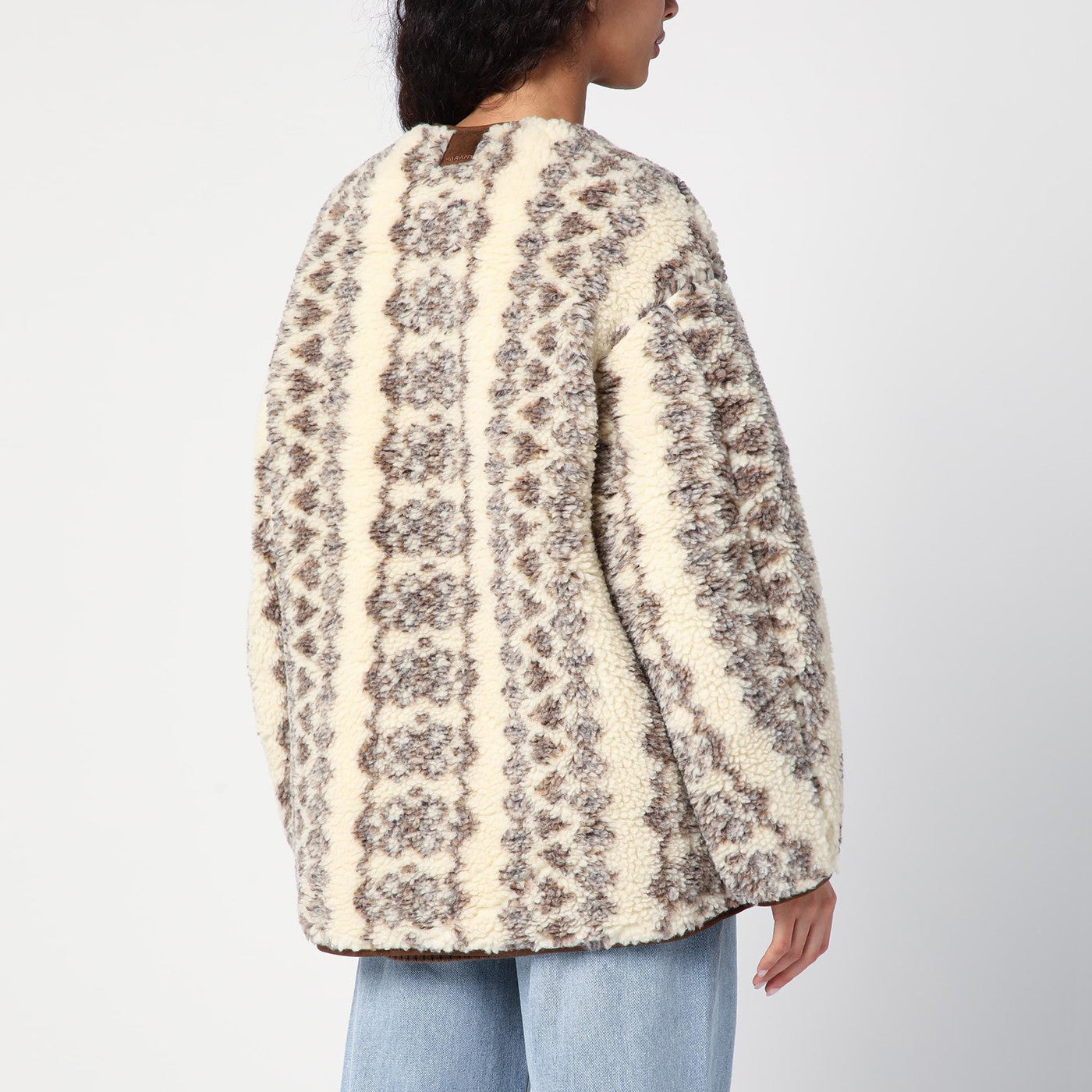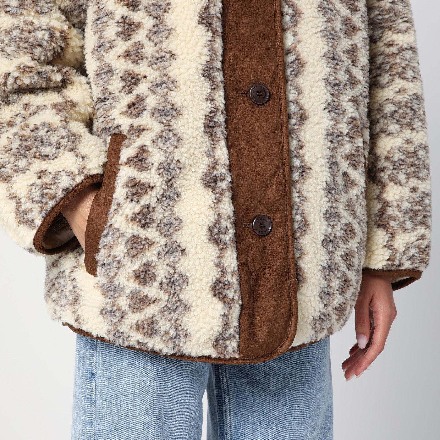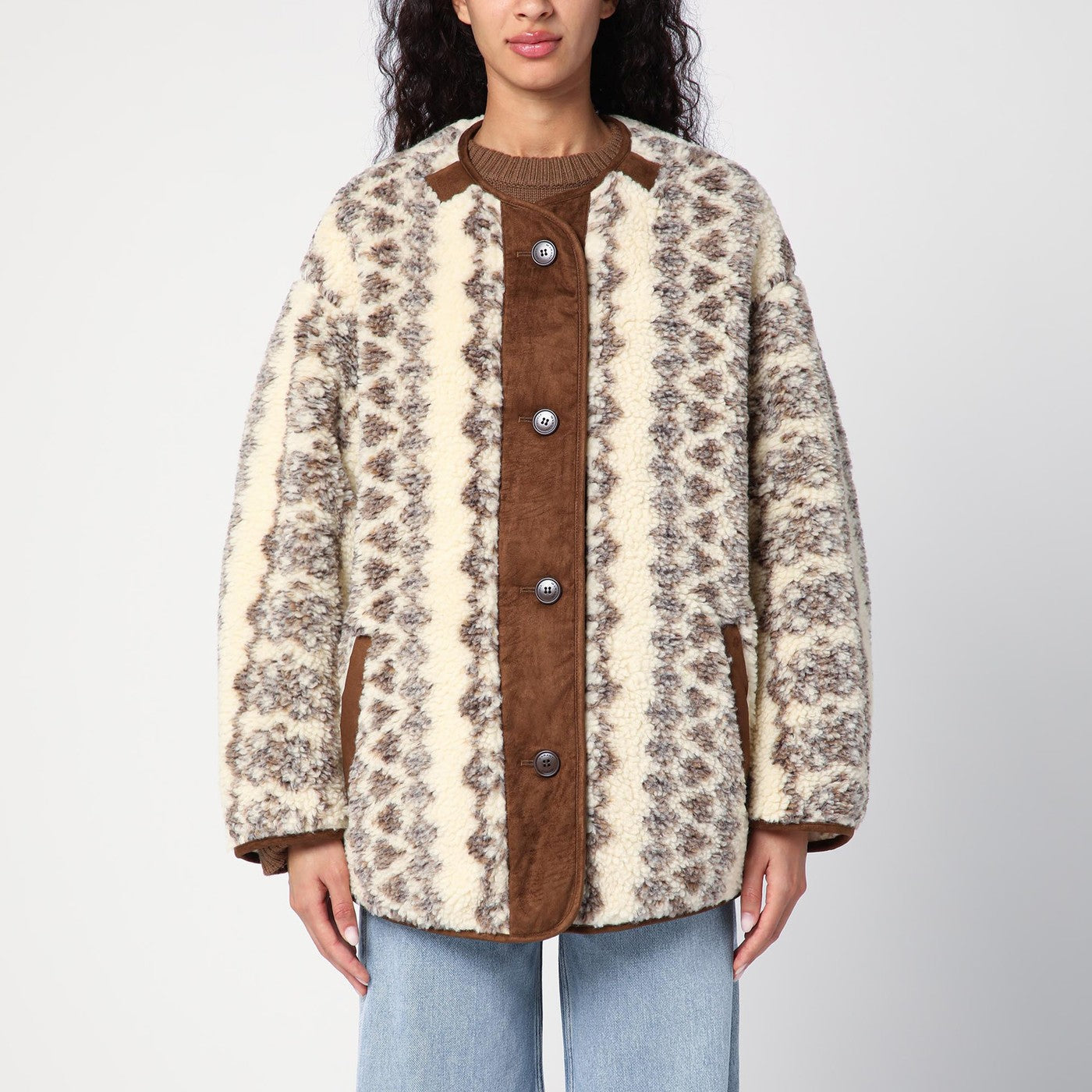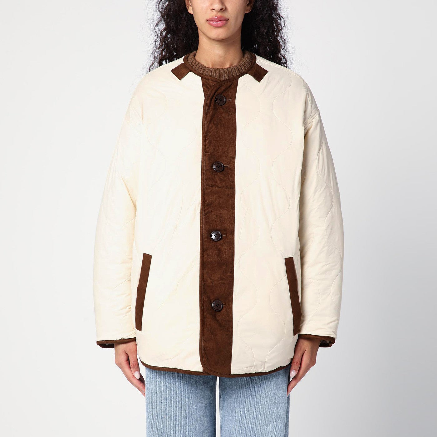 Crewneck Jacket Écru van Isabel Marant Étoile, beschikt over een omkeerbaar ontwerp, lange mouwen, contrasterende suede inzetstukken, een achterste logo -patch, een voorste knoopplacket, twee zijkant laszakken en een regelmatige pasvorm.