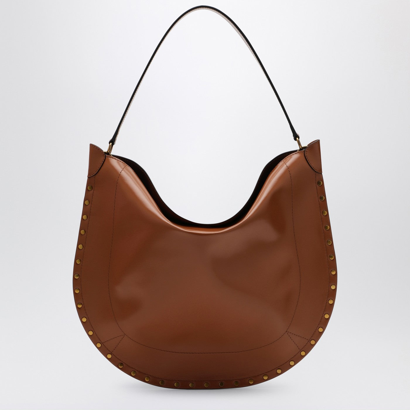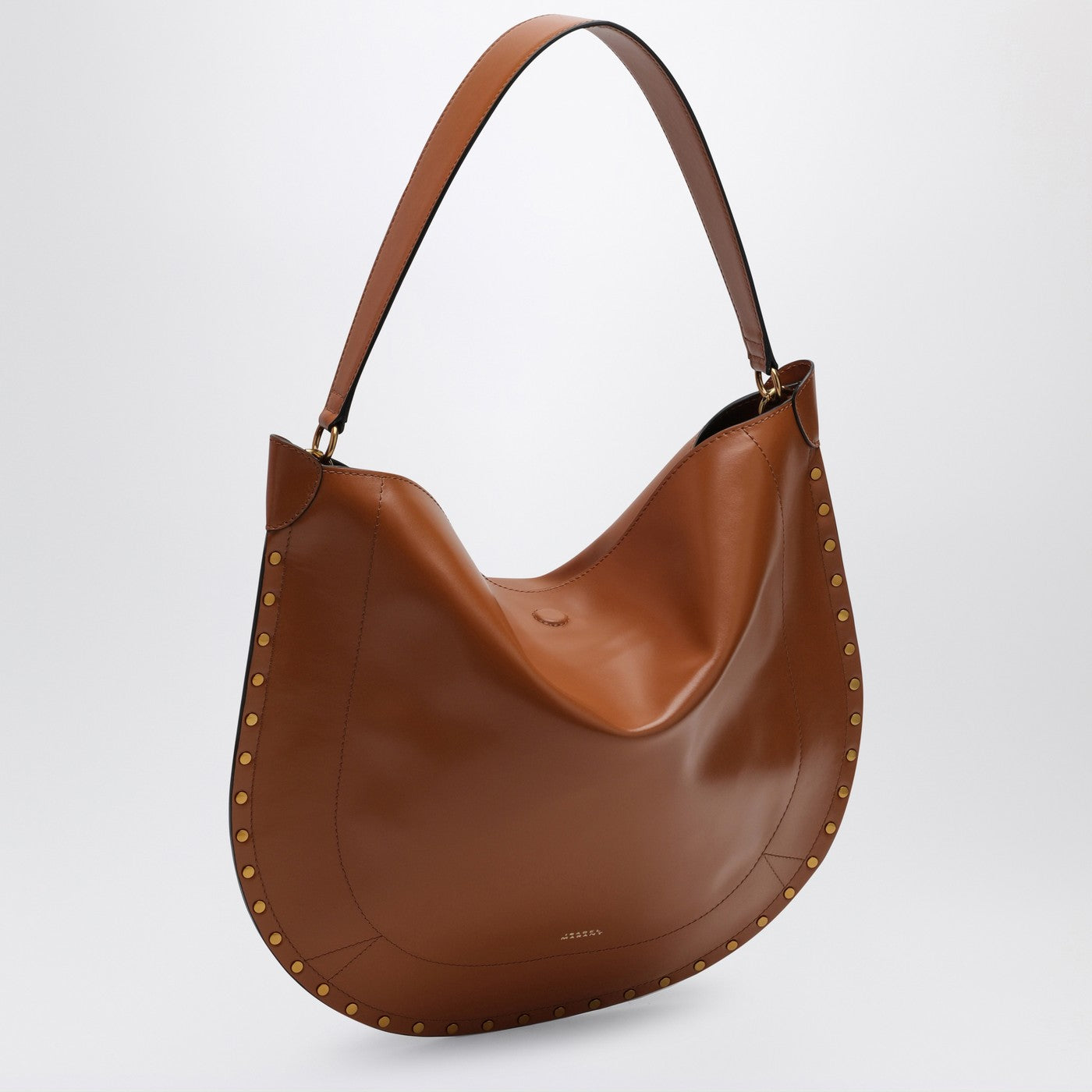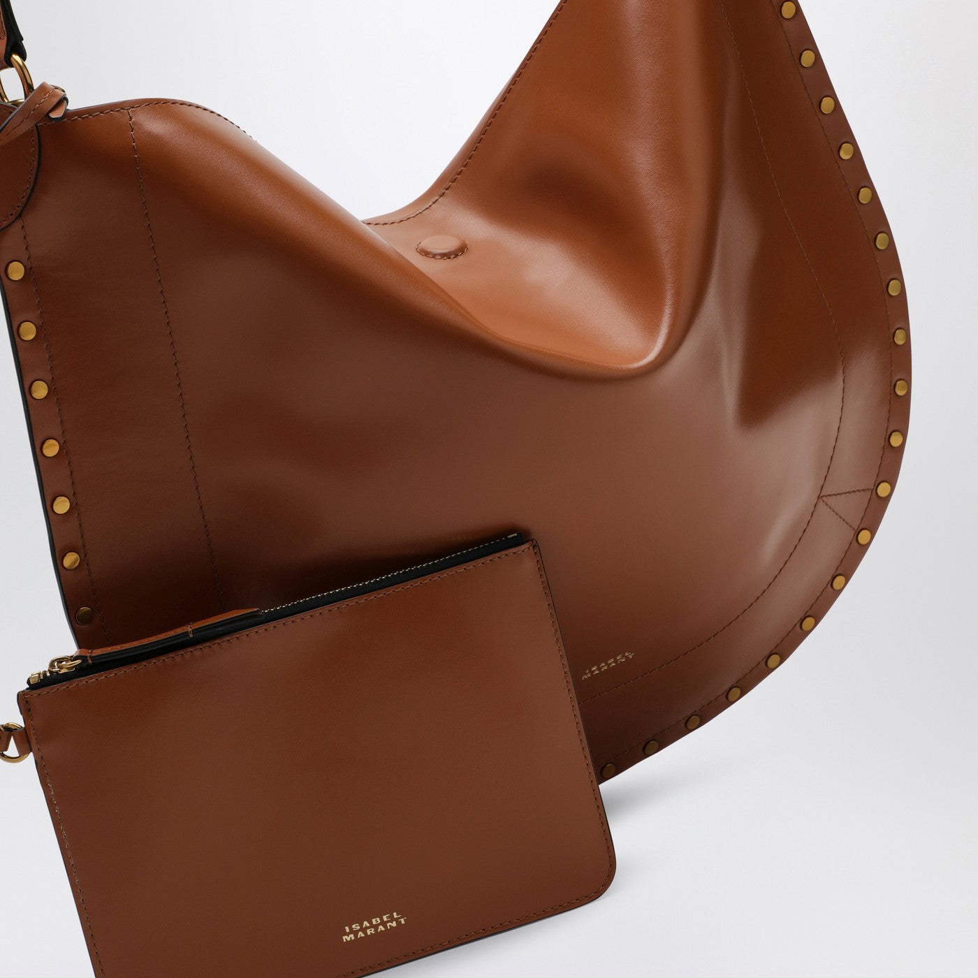 Cognac-gekleurde lederen zachte hobo-tas van Isabel Marant met een bovenste handgreep, een magnetische knoopbevestiging, een buitenrand versierd met gouden studs, een afneembaar logo-bedrukt binnenzak met zip en voorlettering.