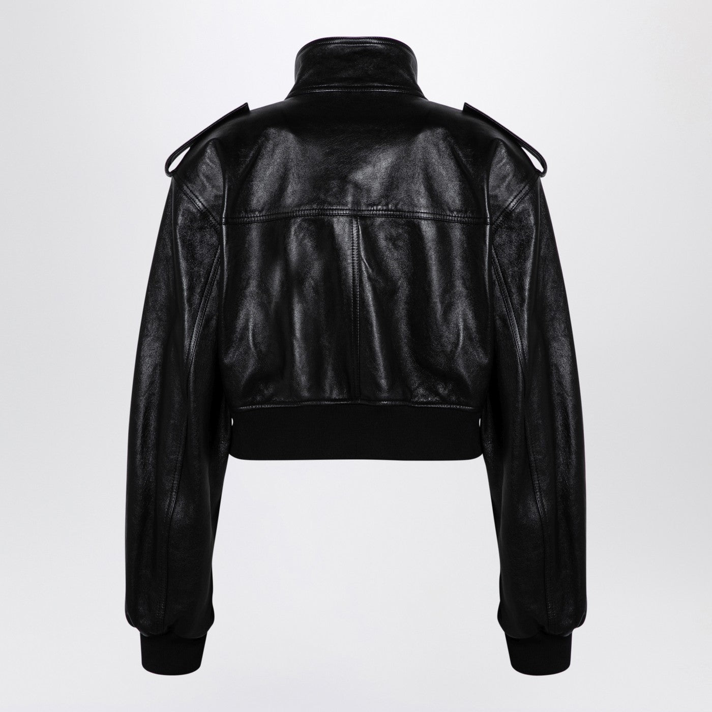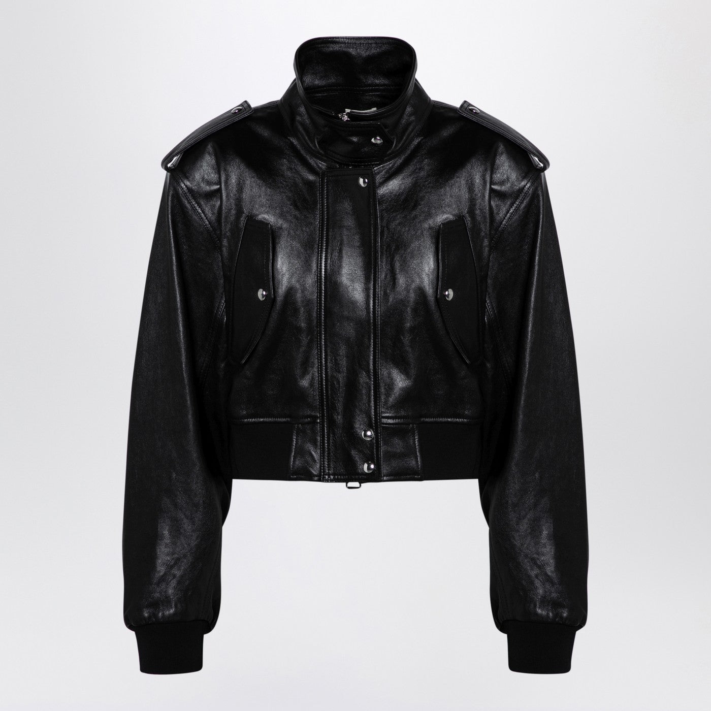 Korte jas door khaite in zwart glanzend leer, met een verborgen voor zip en knoopbevestiging, schuine voorzakken met flap en knoop, lange ballonmouwen, elastische geribbelde manchetten en zoom.