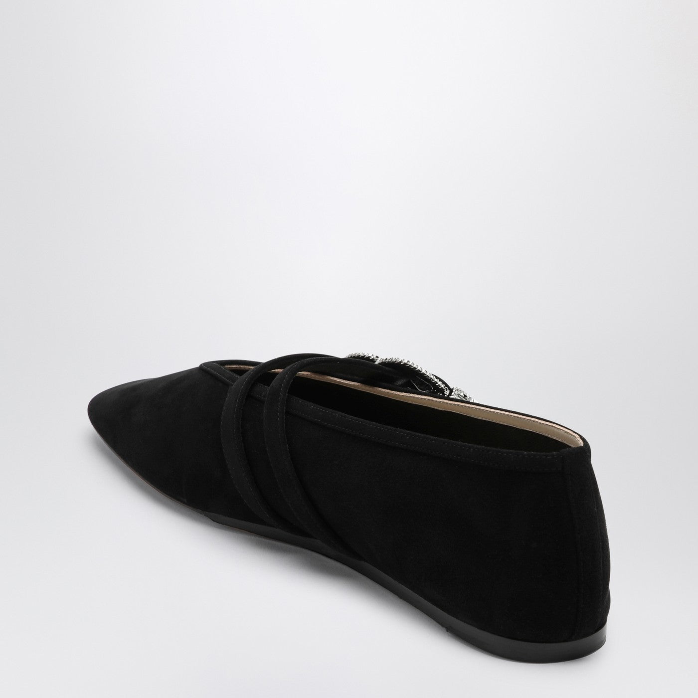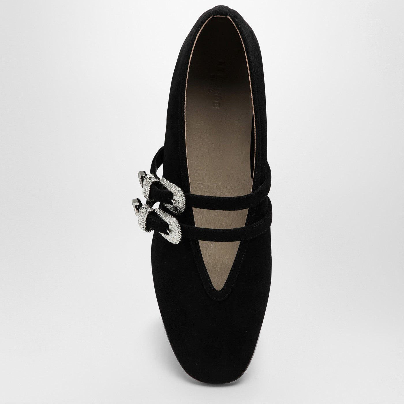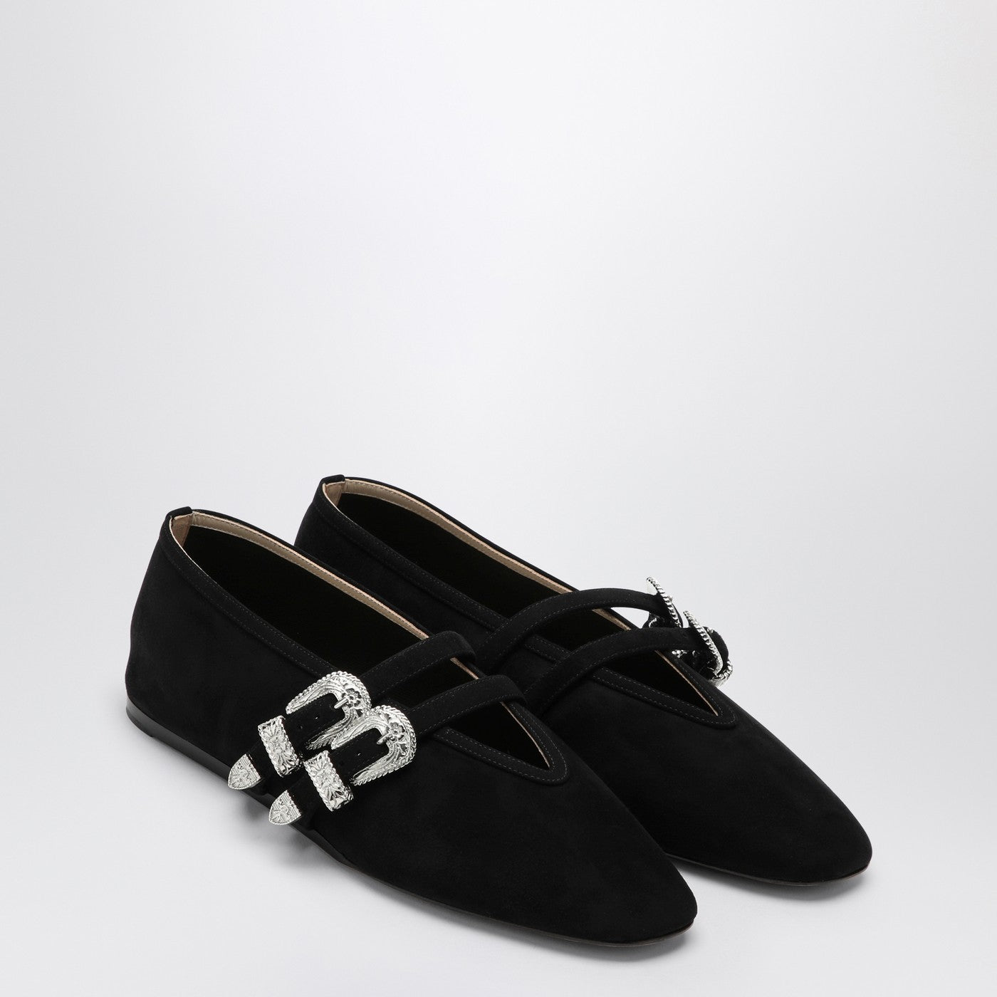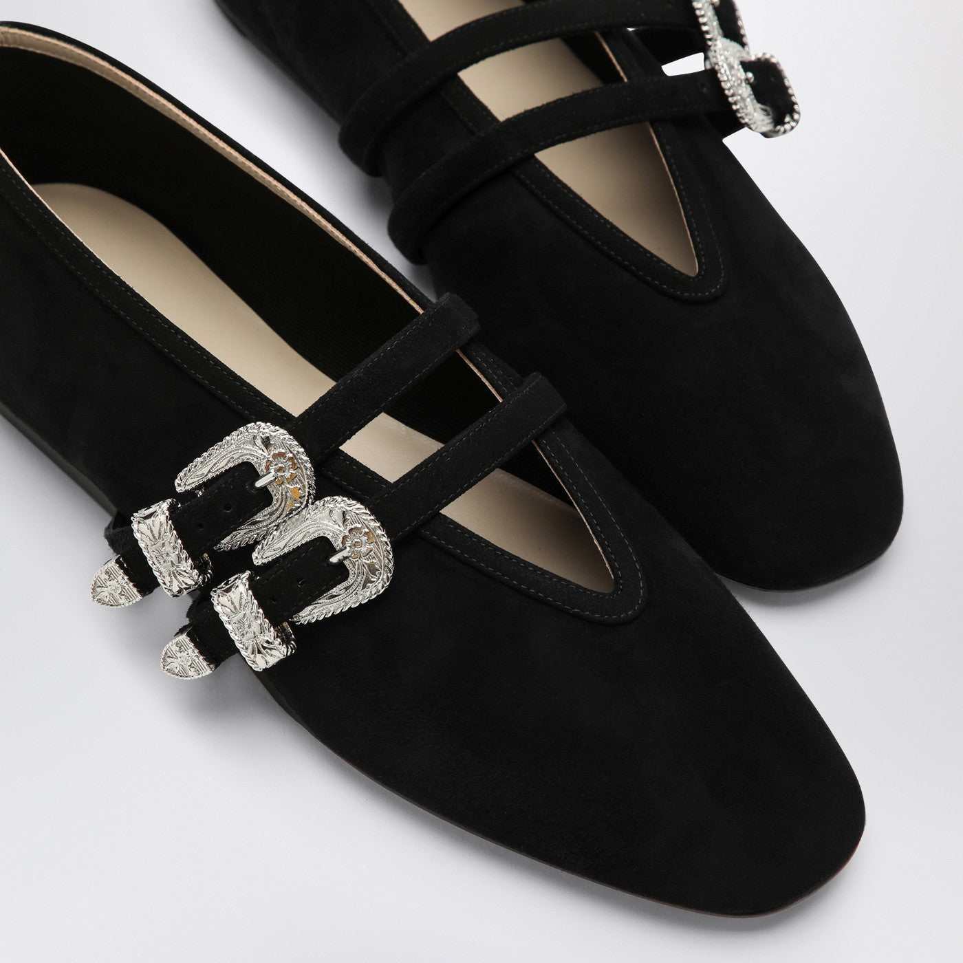 Zwarte suede ballerina van Le Monde Beryl, met een dubbele riem met verstelbare westerse gespen, een vierkante teen en een lederen zool.
