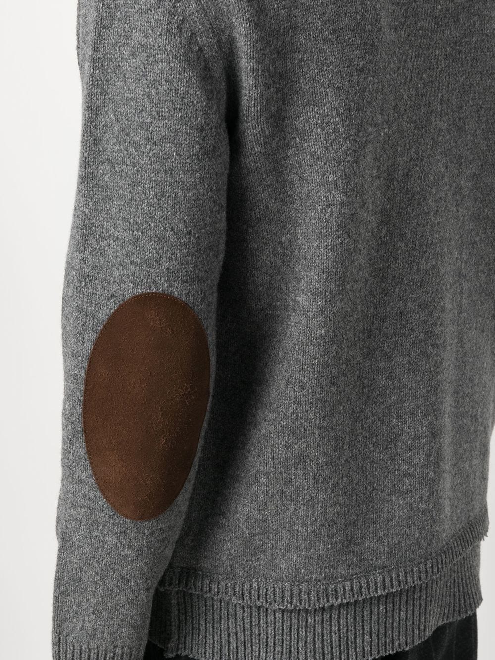 elleboog-patch crew-neck trui van Maison Margiela met grijze, gebreide constructie, bemanningslid, elleboogpleisters, lange mouwen en rechte zoom.