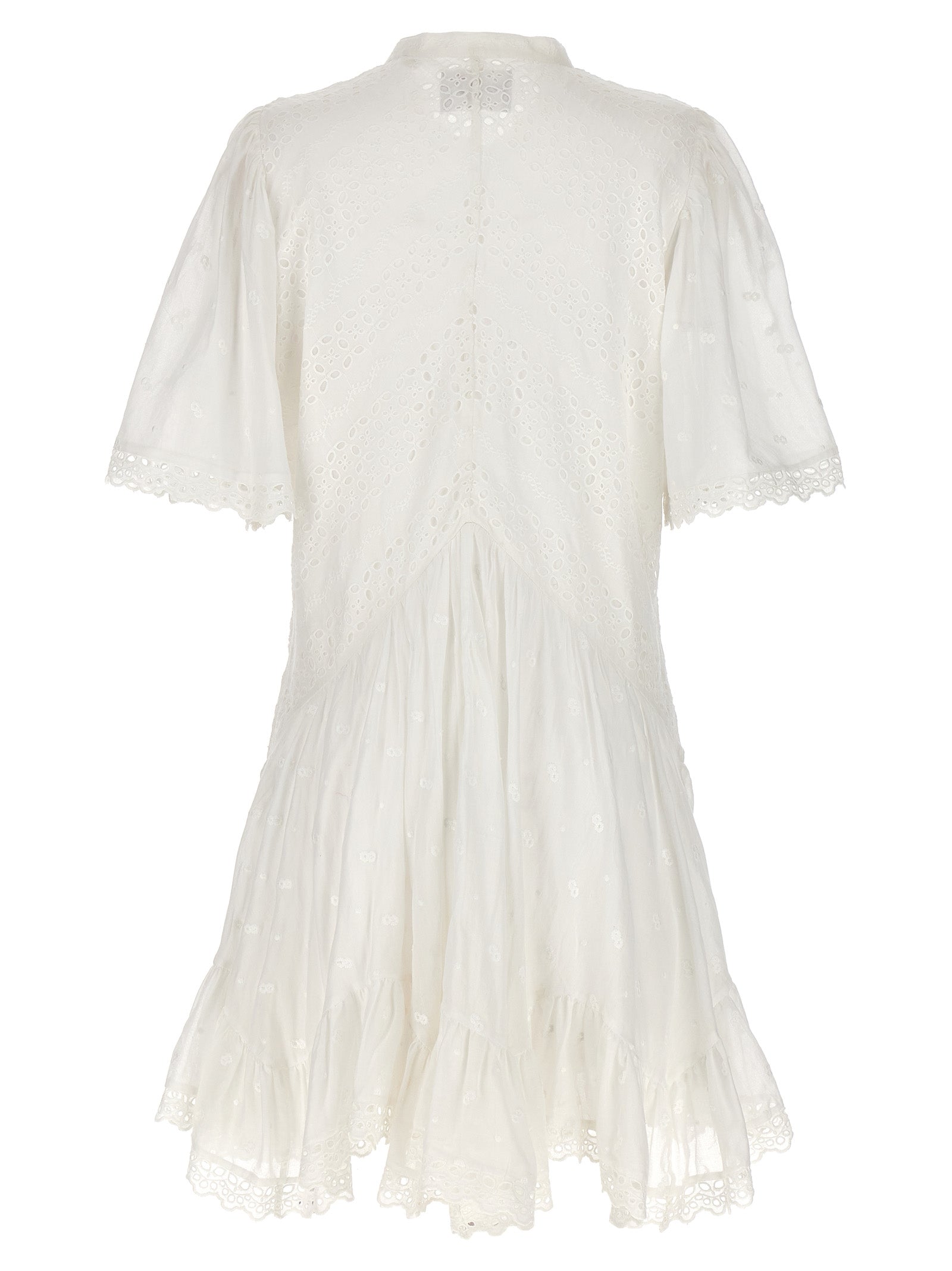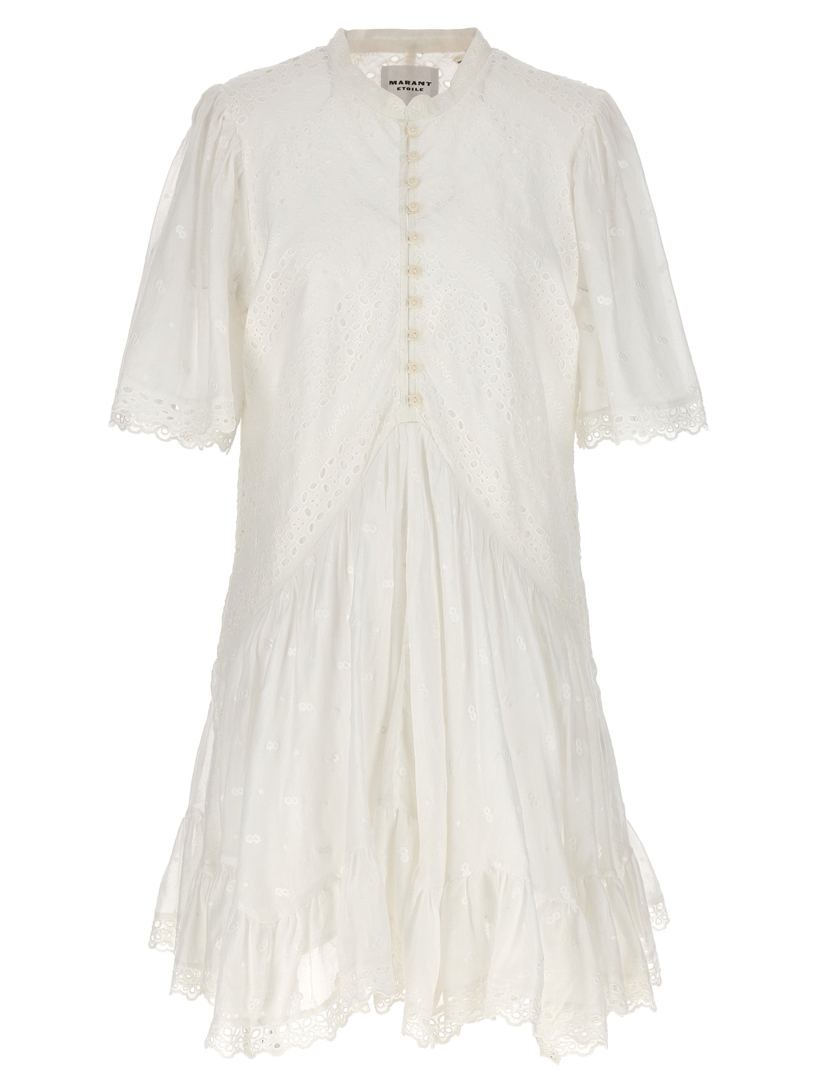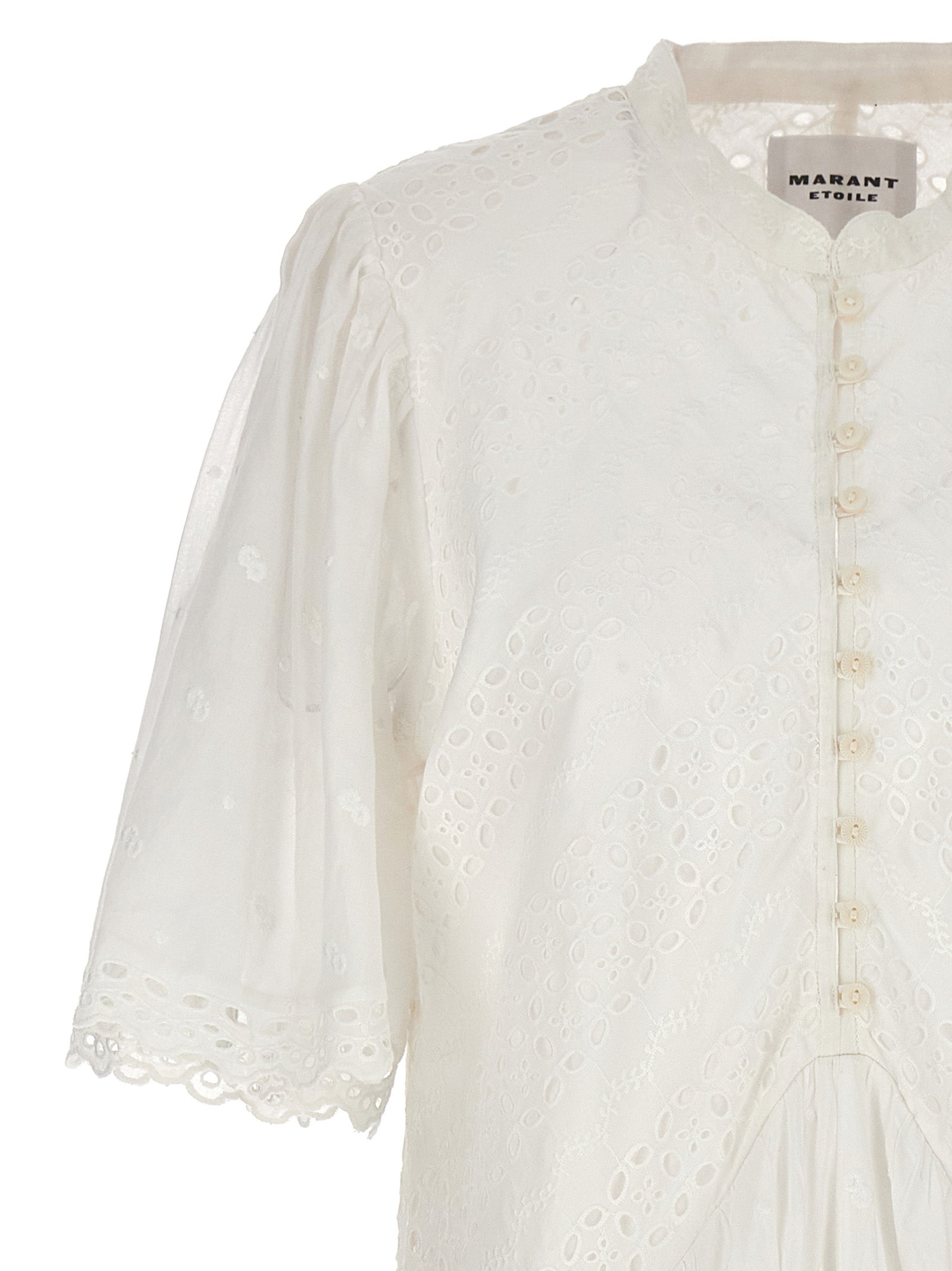 Slayae 'katoenen jurk met borduurwerk en open werkdetails, afsluiting van de voorste knop, mandarijnkraag, korte mouwen.
