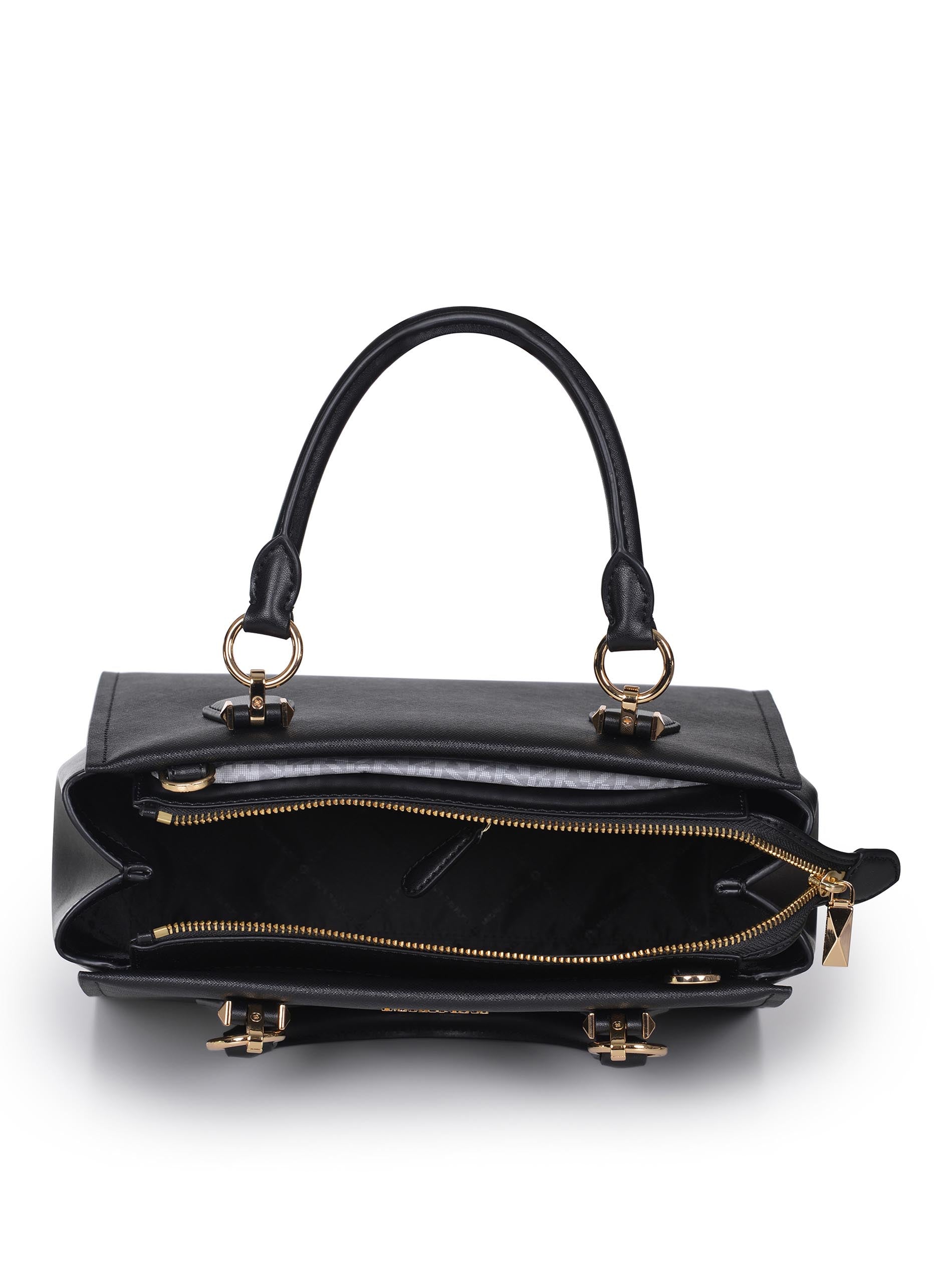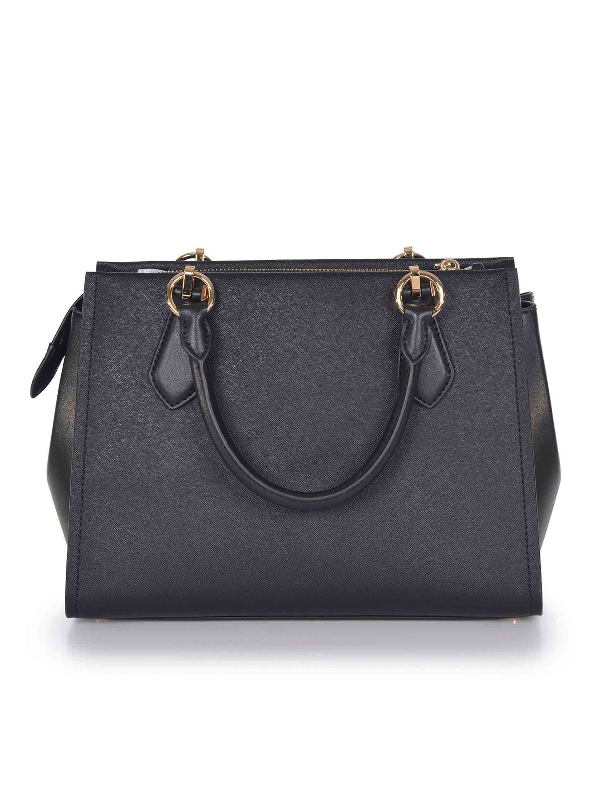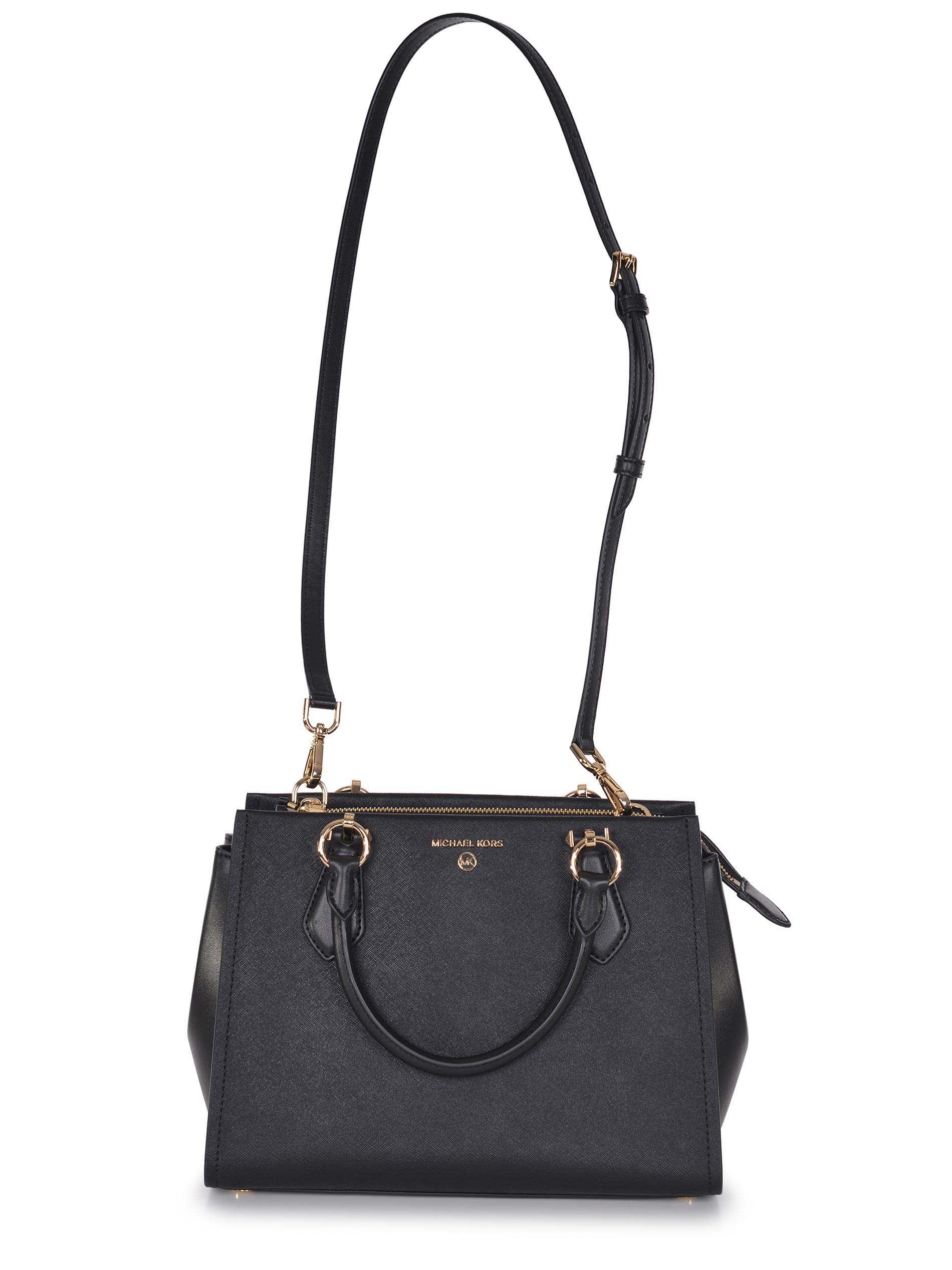 Michael Kors "Marilyn" tas gemaakt van zwart Saffiano -leer. Gouden metalen inzetstukken. Twee handgrepen. "Michael Kors" logo -letters in Golden Metal aan de voorkant. Zip sluiting bovenaan. Gevoerd interieur. Interne pocket met zip. Verstelbare en verwijderbare lederen schouderriem. Haal de hoogte van 11,4 cm af. Afmetingen: L 28,6 cm, H 21 cm, D 14 cm. Voering 100% polyester. 100% leer.