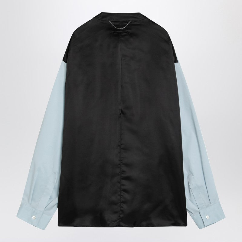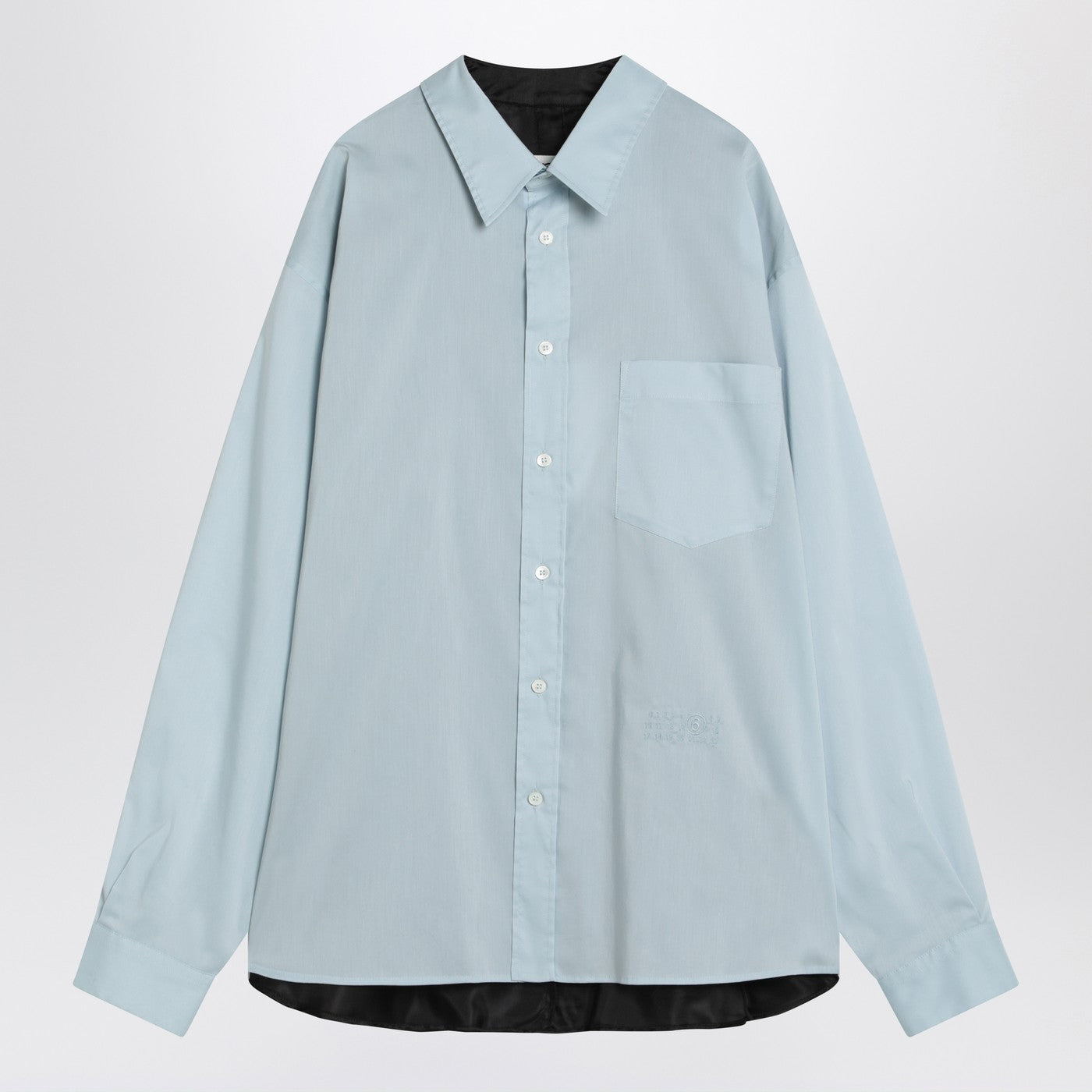 MM6 Maison Margiela-shirt in lichtblauwe katoenen blend, met lange mouwen met manchetten met knopen, klassieke kraag, een patchzak op de borst, tone-op-tone vooraan numeriek handtekening logo mm6, zwarte achterkant inzetstuk met kettingdetail, witte steeklijn en gebogen zoom.