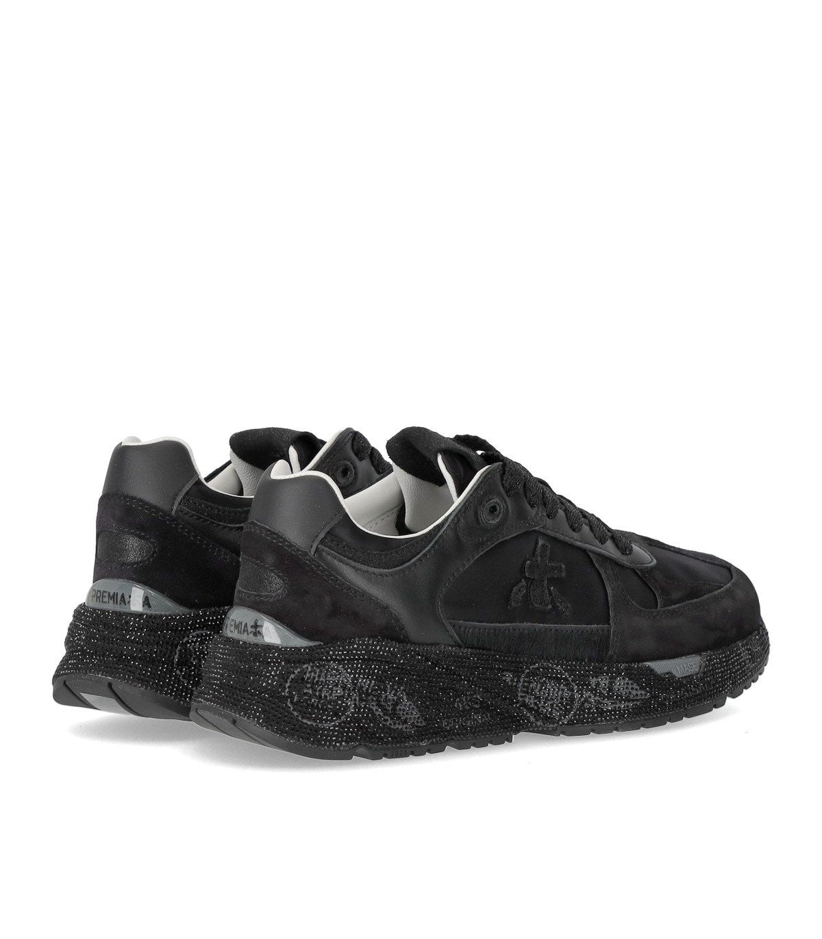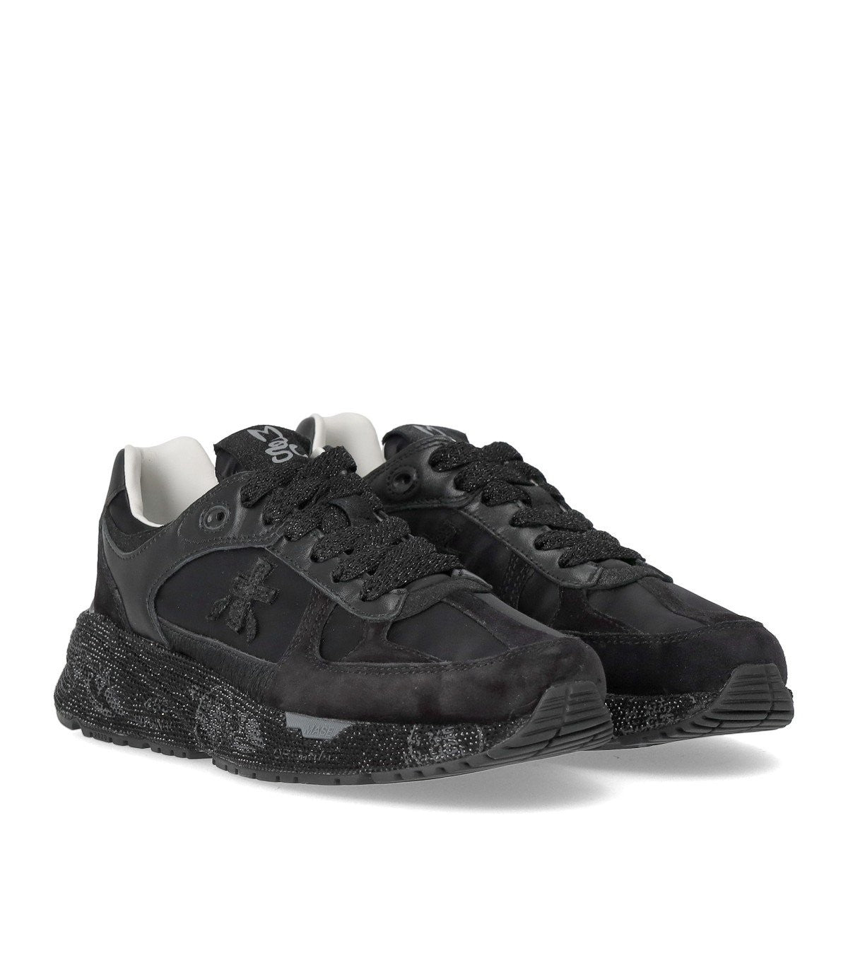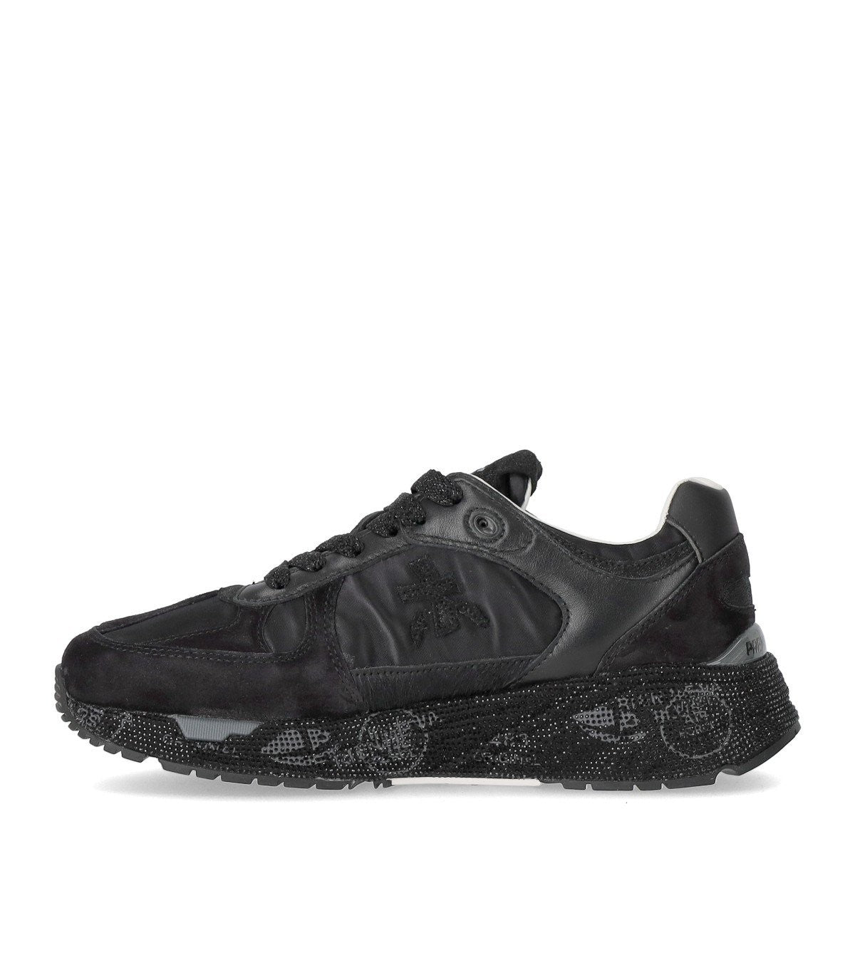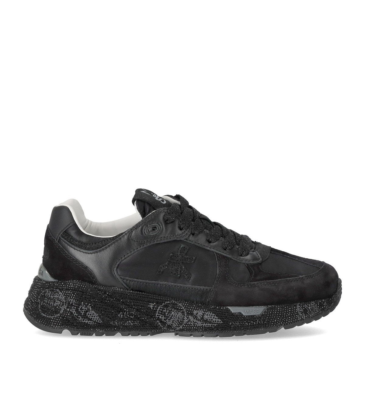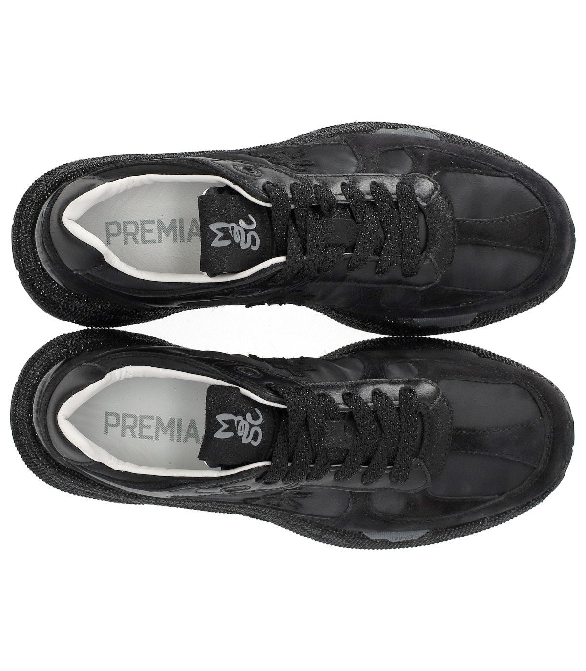 MASE 7094 Sneaker door premiata gemaakt van leer, suede en satijneffectstof in tinten zwart. Leer interieur, katoen en Lurex veters en rubberen zool bedekt met bijpassende strass. Hoogte 4,5 cm.