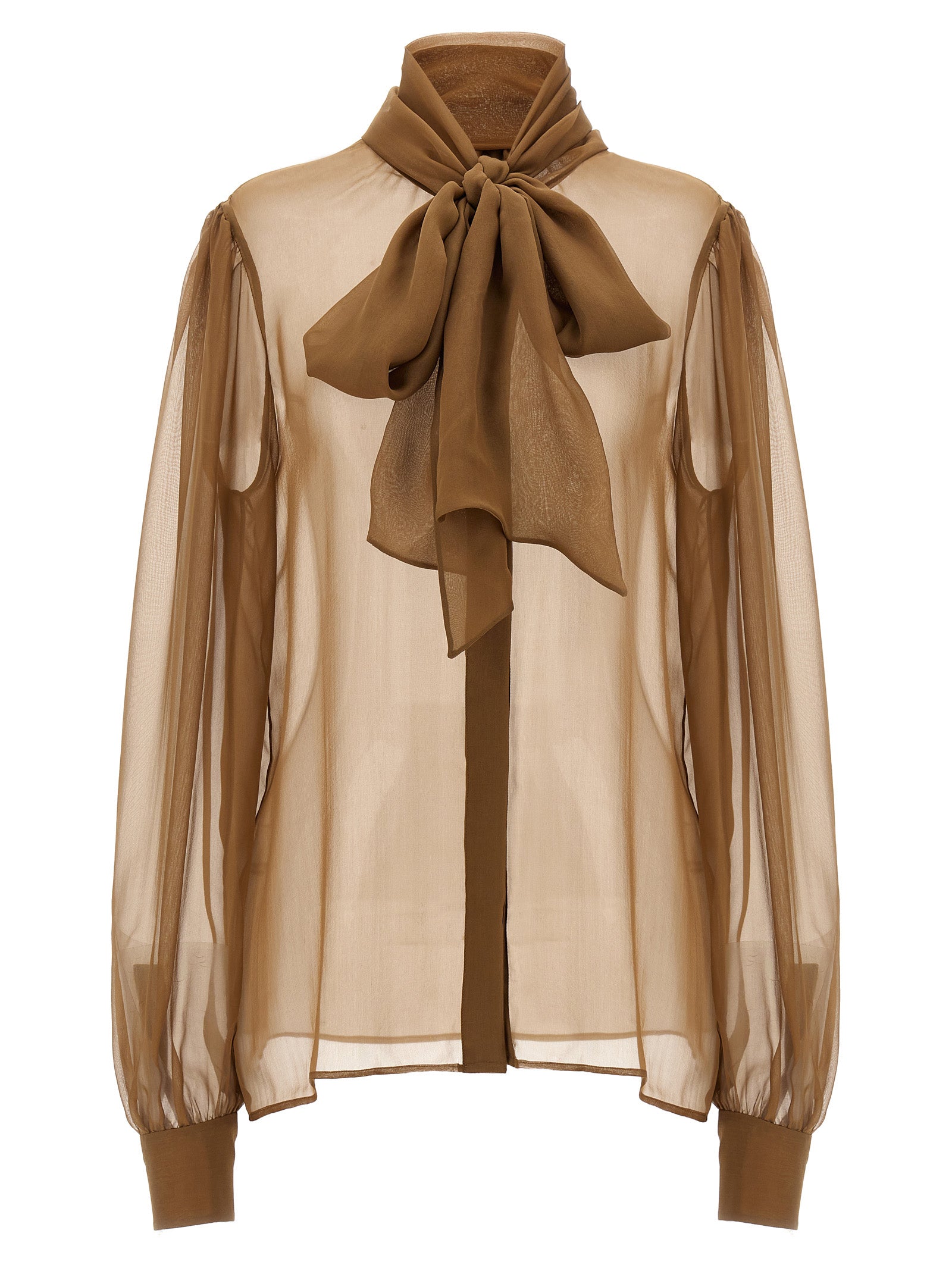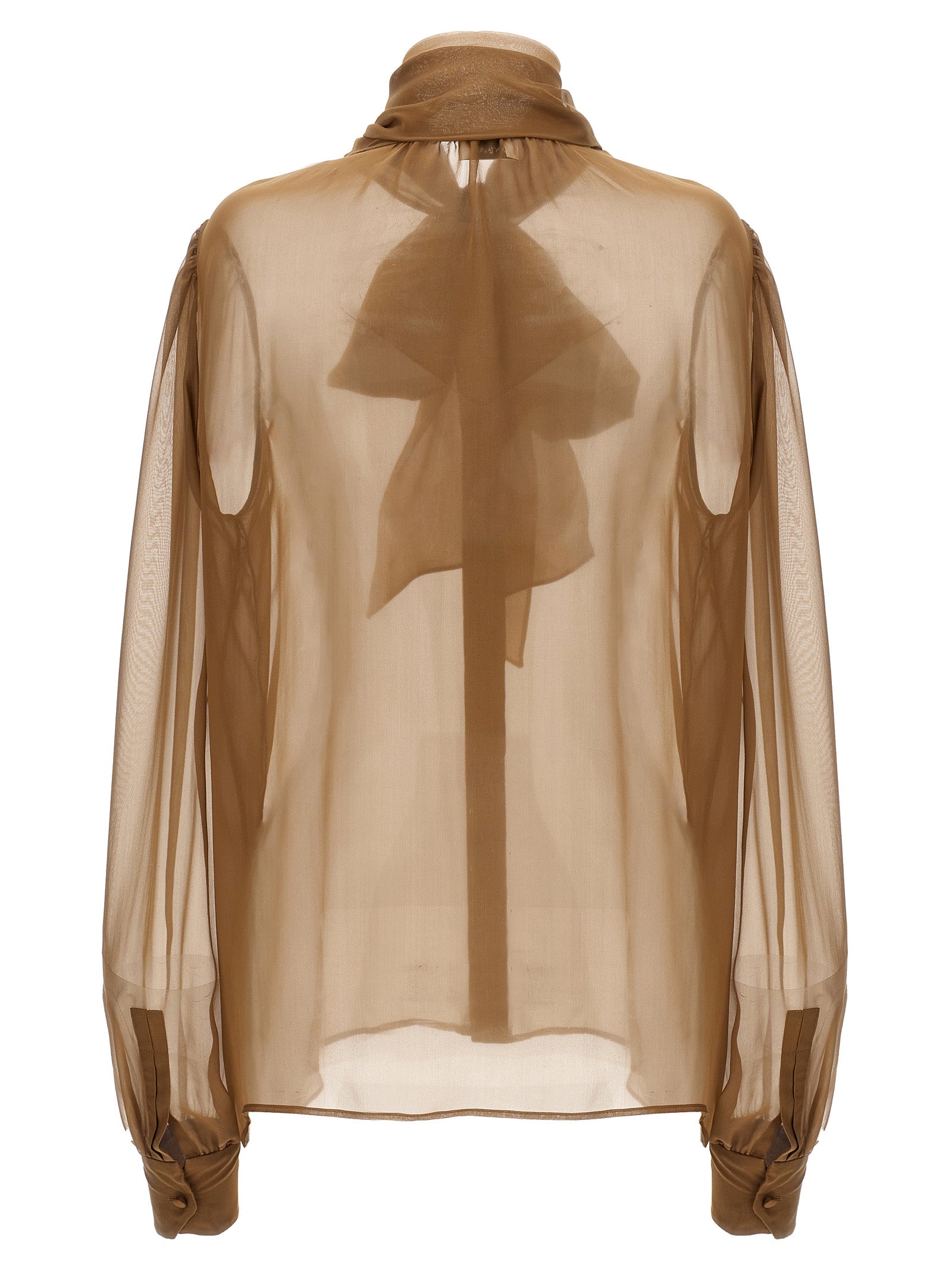 Shirt in semi-transparante zijden mousseline, lavallière kraag, lange manchetmouwen.
