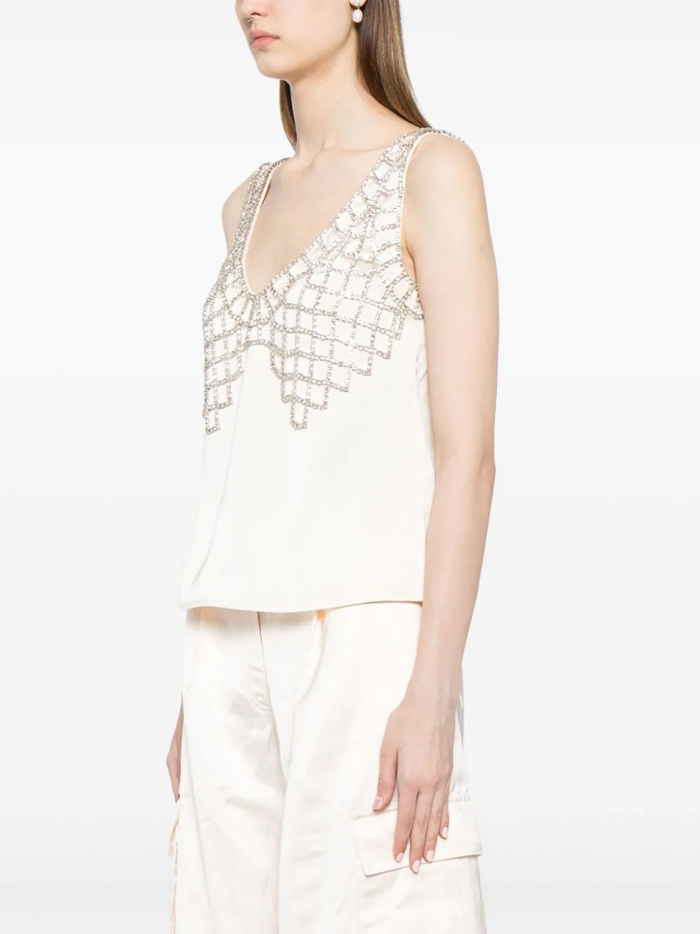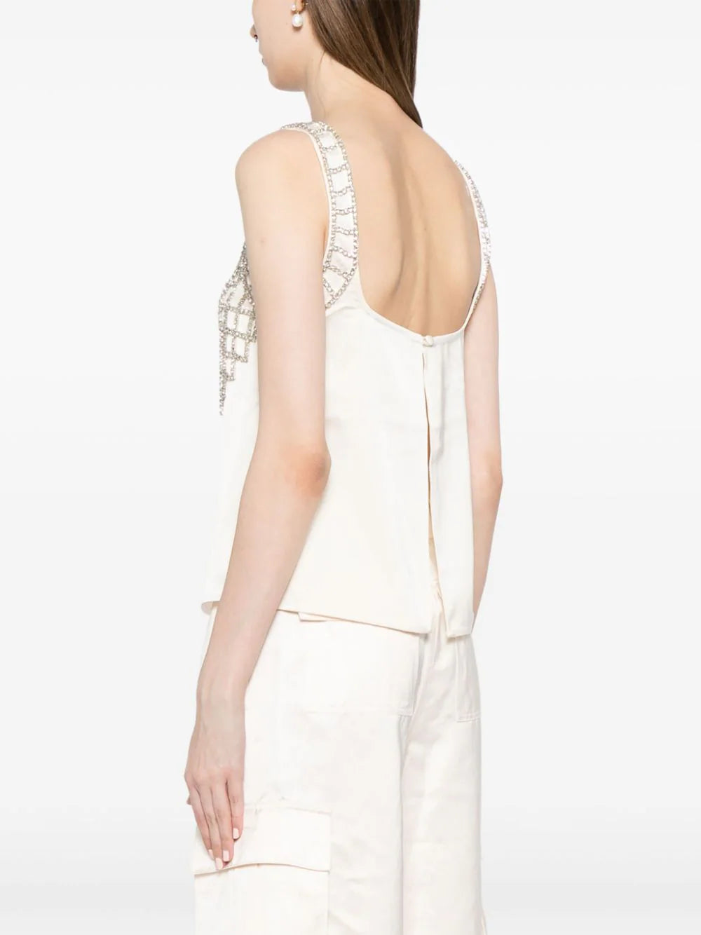 crème witte strass verfraaiing, ronde halslijn, mouwloze, sluiting van de achterste knop, rugspleet, rechte zoom