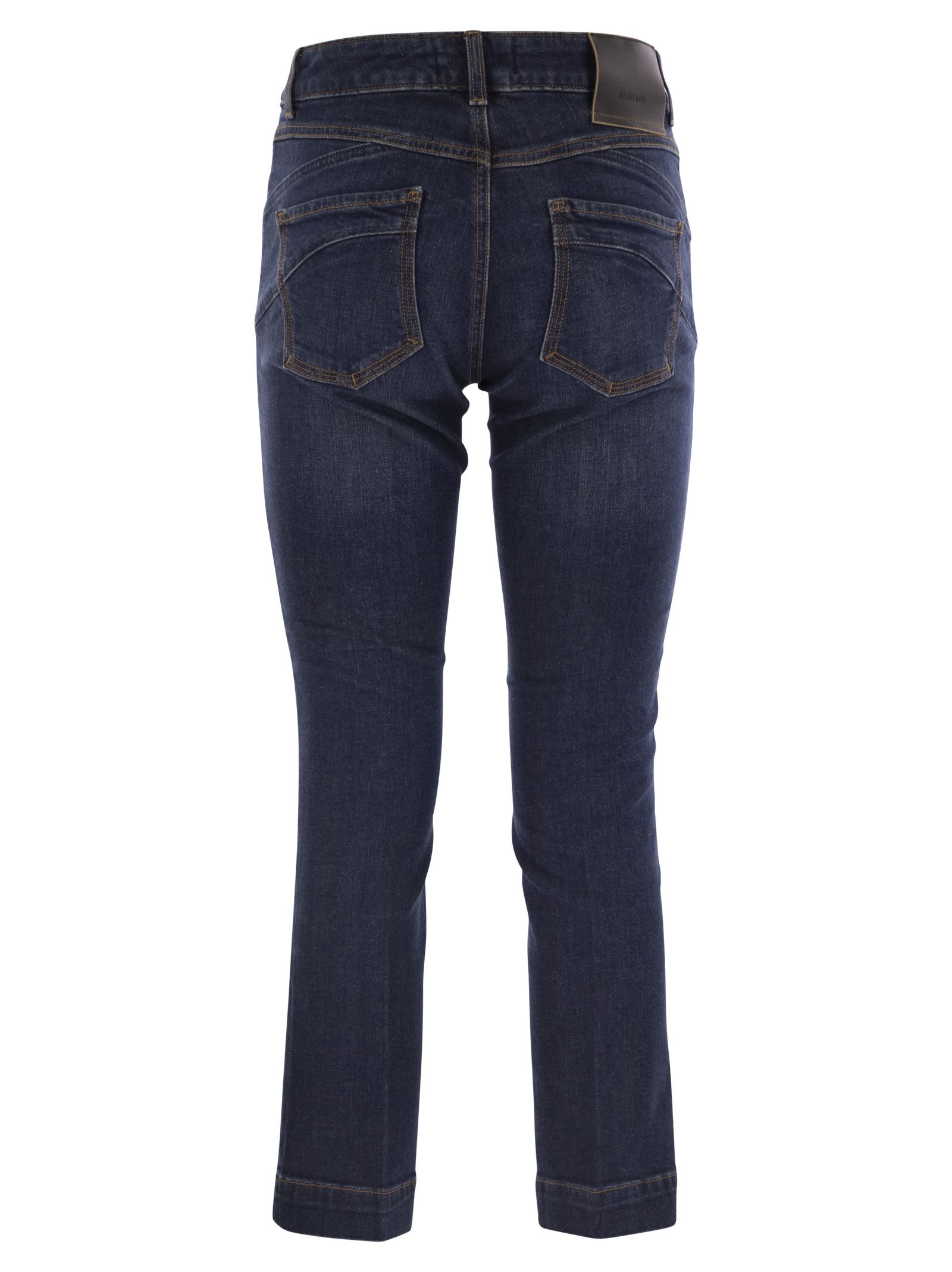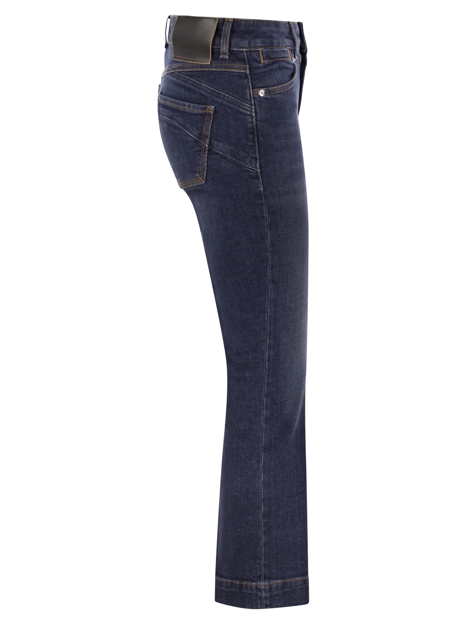 5-pocket broek met perfecte pasvorm, gemaakt van authentieke indigo stretch denim met medium vintage en donkere gebruikte behandeling. De lage taille en mini -flare lijn van het been worden aangevuld met een gewaslengte aan de onderkant en een vouw aan de voor- en achterkant. Originele details zoals contrasterende tabaksstiksels, klinknagels en een aangepaste metalen knop voltooien het ontwerp. - bijgesneden - dichtbij - 5 zakken Designer ID: 2422186215600 007