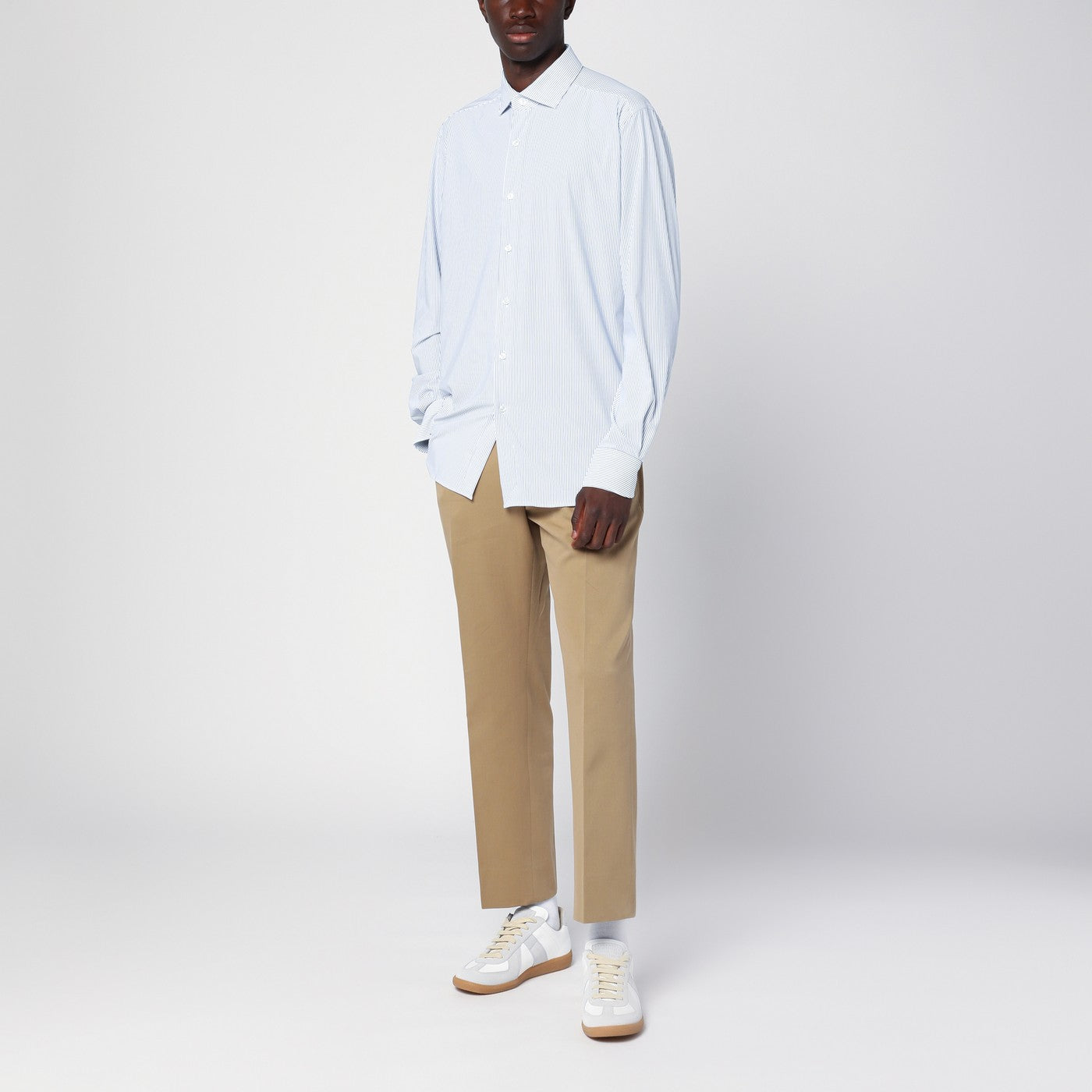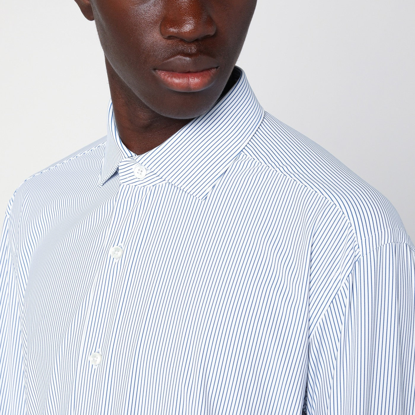 Shirt met lange mouwen van Xacus in blauw en wit gestreepte popeline, met kleine Franse kraag, voorste placket, lange mouwen, knoopmanchetten en gebogen zoom.