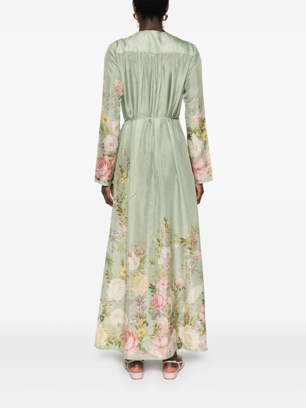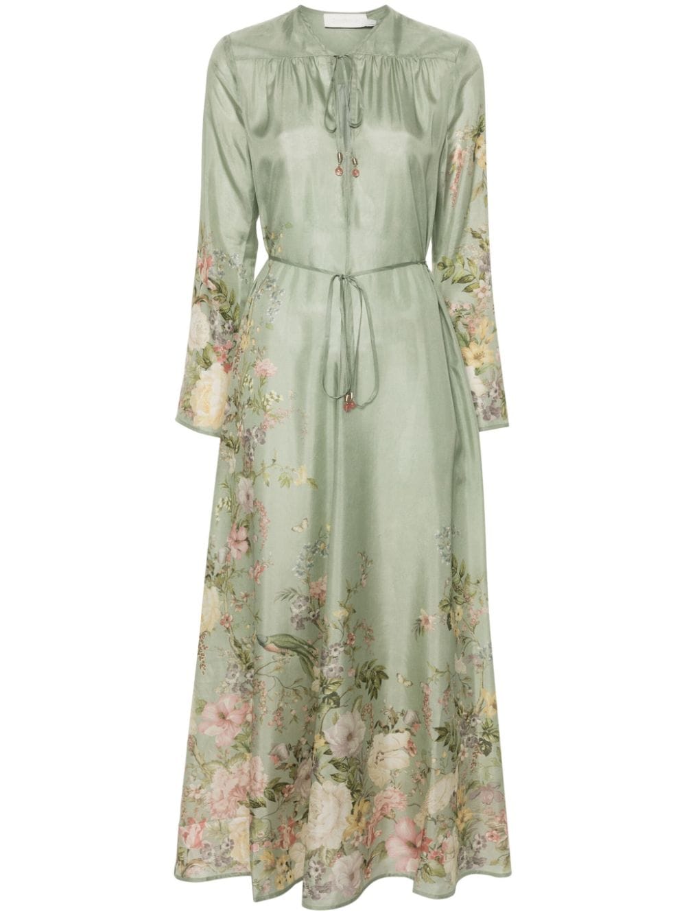 lichtgroene zijden bloemenprint v-neck lange mouwen vastgebonden taille wijd uitlopende zoom front stropdas bevestiging