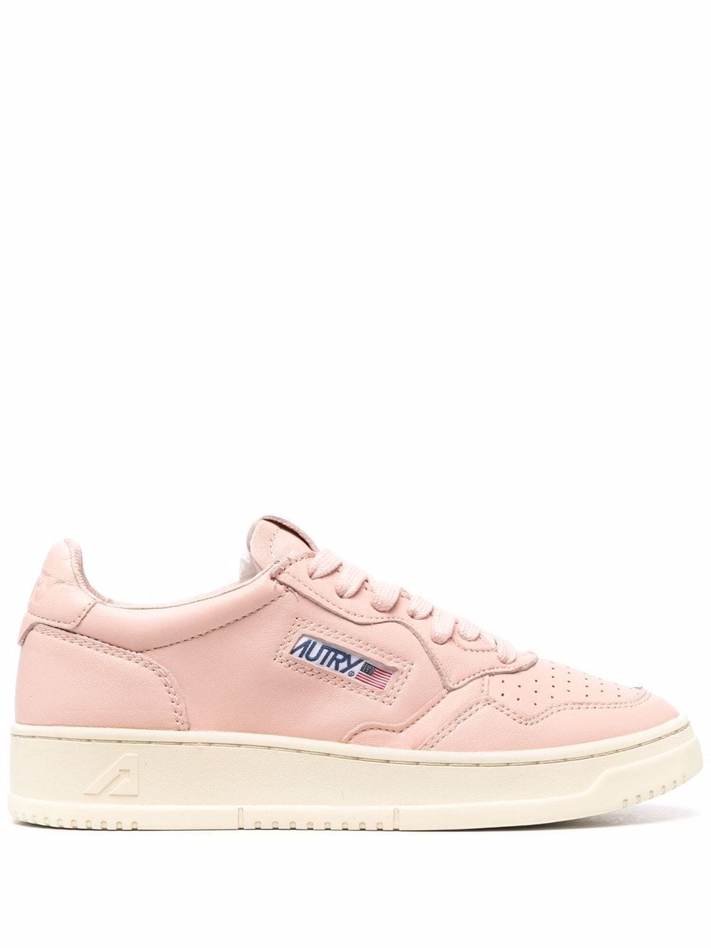 Rosa skinn blonder lave joggesko fra Autry med perforert toebox, logo-trykk til siden, logo-lapp på tungen, rund tå, frontfjæring foran, merkevaresåle og flat gummisåle. AULWGG28