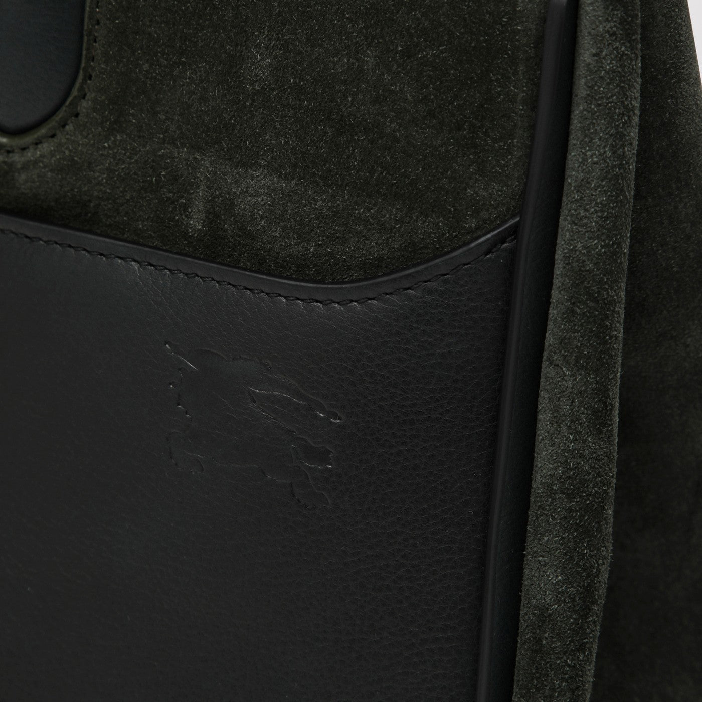 Totebag av Burberry i mørkegrønn semsket skinn med to håndtak, en justerbar og avtakbar skulderstropp, en gullfarget metall B-formet lås, et enkelt rom, en intern glidelås og en ridderdesignlogo på baksiden.