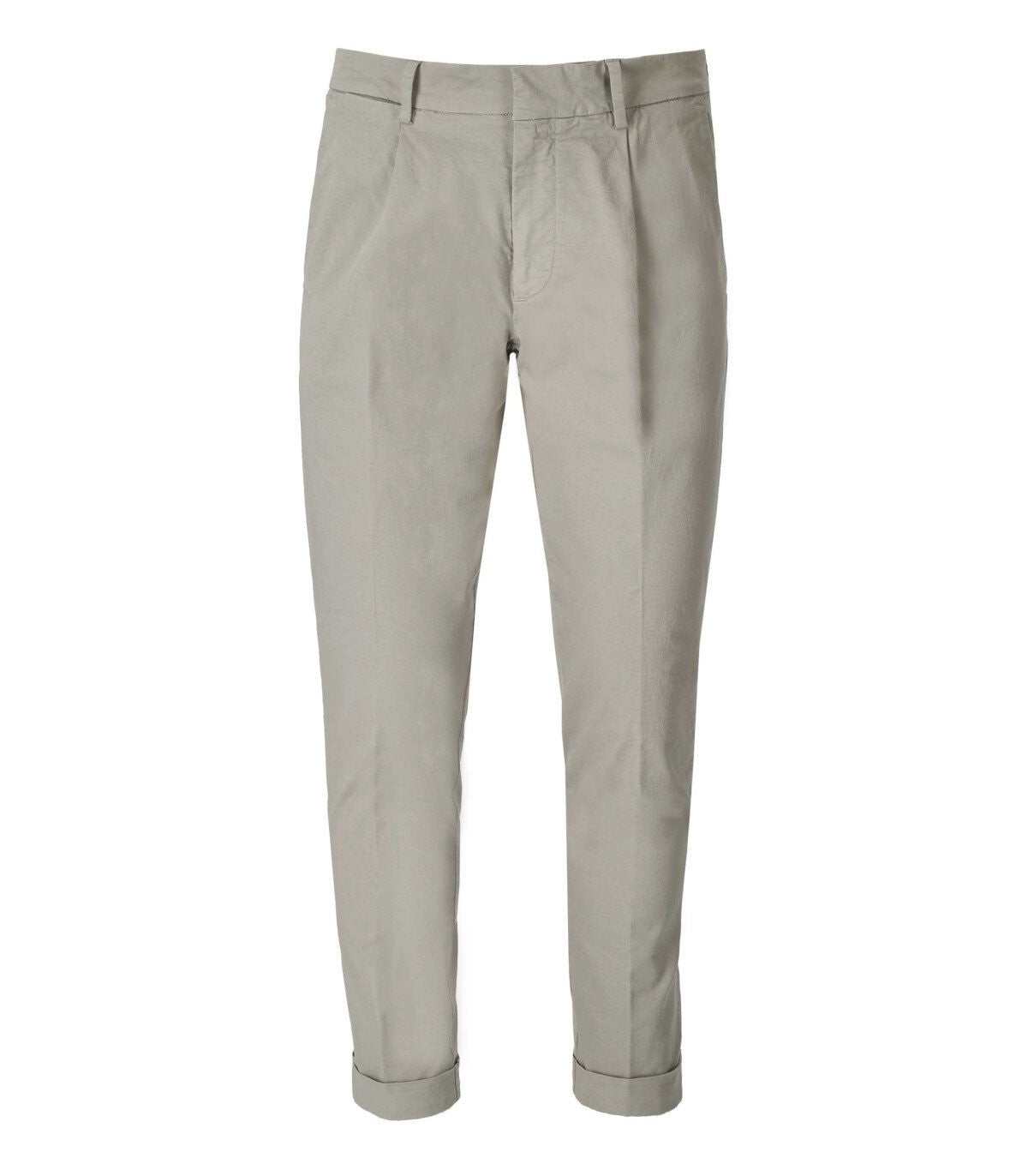 Cruna -bukser laget av lysegrå bomull. Frontpliss, skrå lommer på sidene og klafflommene på baksiden. Belteløkker og lukking av glidelås og metall. Turn-up hem, slank passform. Sammensetning: 97% bomull, 3% Elastane.