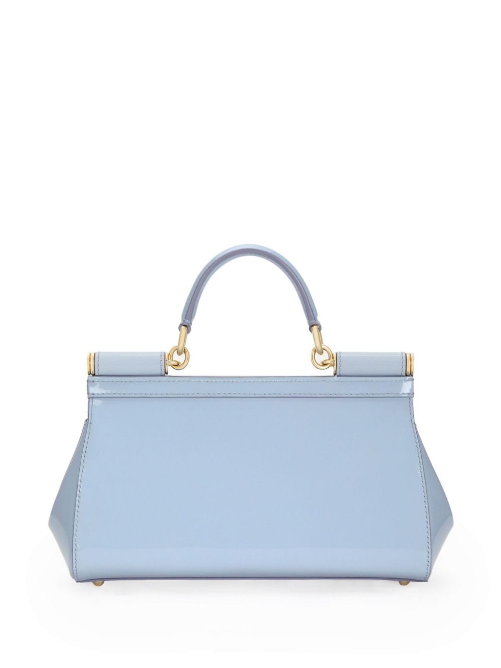 babyblå kalv skinn patent finish enkelt topp håndtak logo plakk justerbar avtakbar skulder stropp foldover top med magnetisk festing hovedrom innvendig glidelomme metall føtter gulltone maskinvare Dette stykket leveres komplett med en beskyttende støvpose.