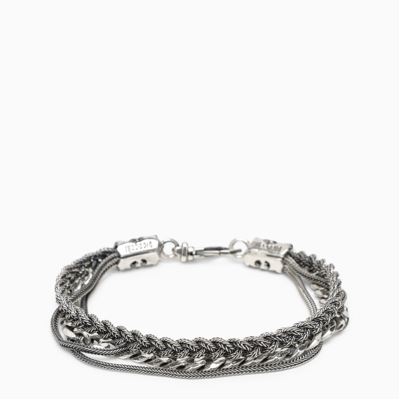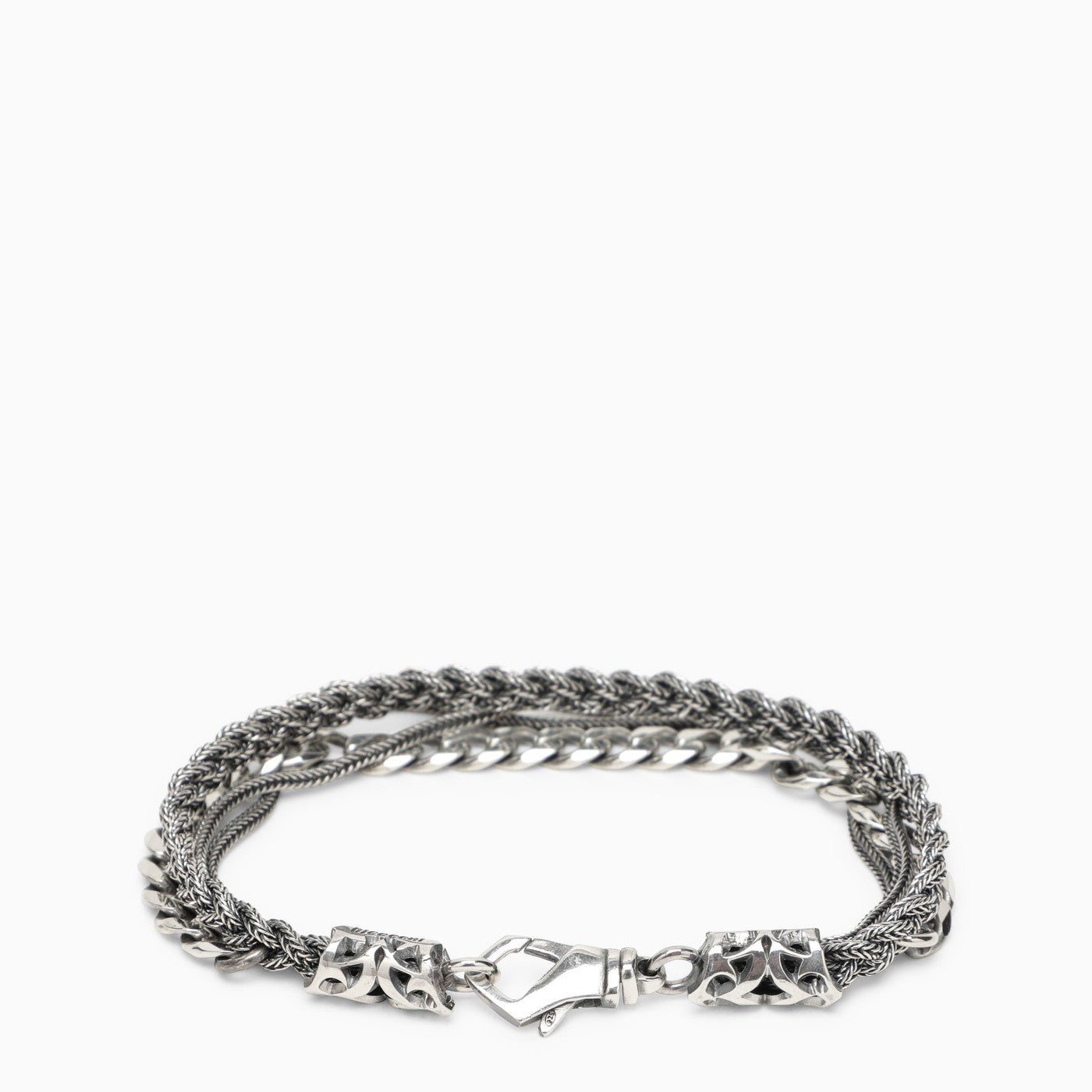 925 sølvflette og kjedearmbånd av Emanuele Bicocchi, med en krokfesting og gravert logo. Produktet er håndlaget og kan variere litt fra bildet. Emanuele Bicocchi -smykker er laget i 925 ubehandlet og brent sølv, noe som gir det et antikt utseende. Pletteringen kan falme over tid, derfor anbefales det å ikke utsette smykkene for etsende/aggressive agenter.
