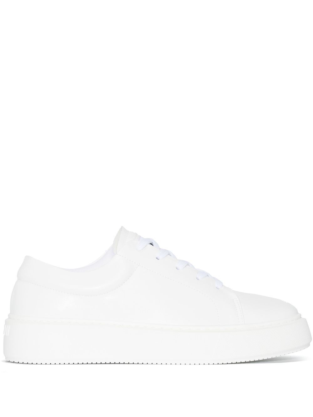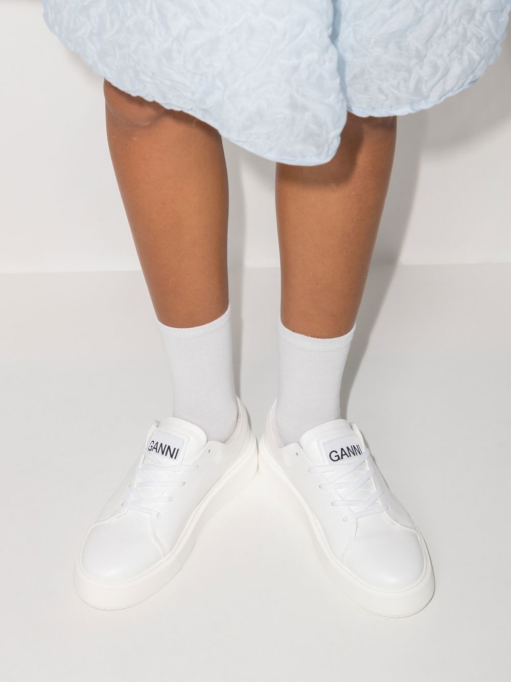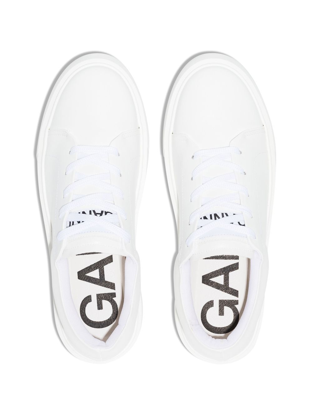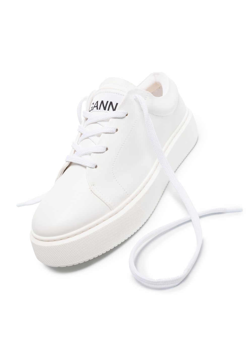 Logo-Patch low-top joggesko fra Ganni med hvit, logo-lapp på tungen, preget logo bak, logo-lappen til siden, rund tå, festing foran, merket innersåle og flat gummisåle.