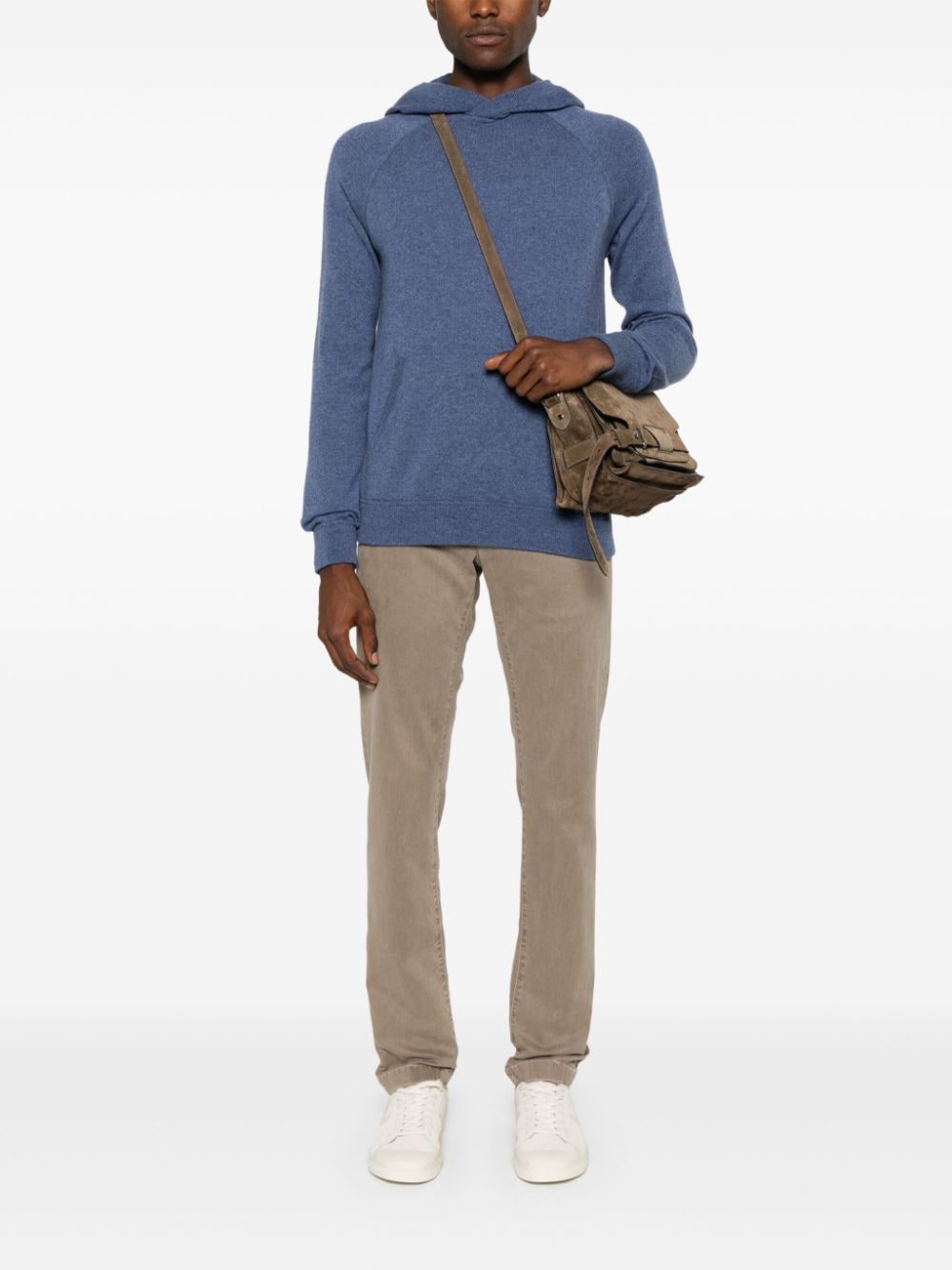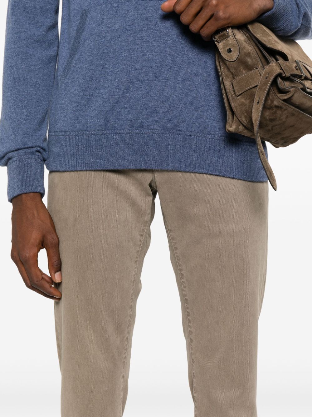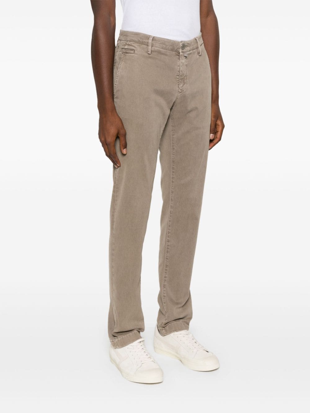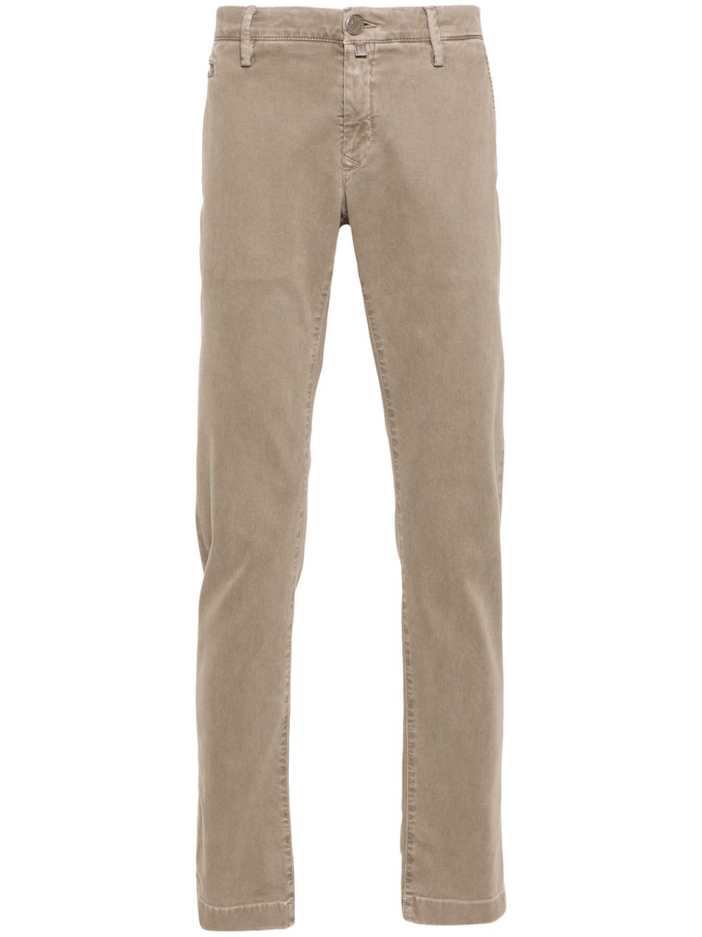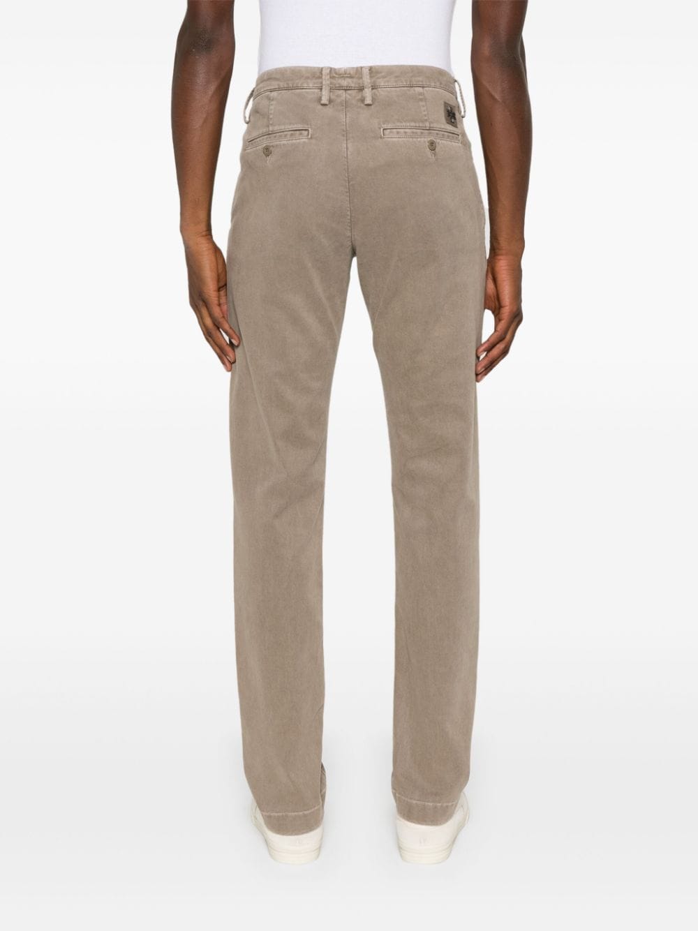 mørk beige twill veving logo lapp til bakre belteløkker mynt lomme to diagonale lommer til sidene to bakre knappfestepyntede lommer foran knapp og glidelåsfesteing