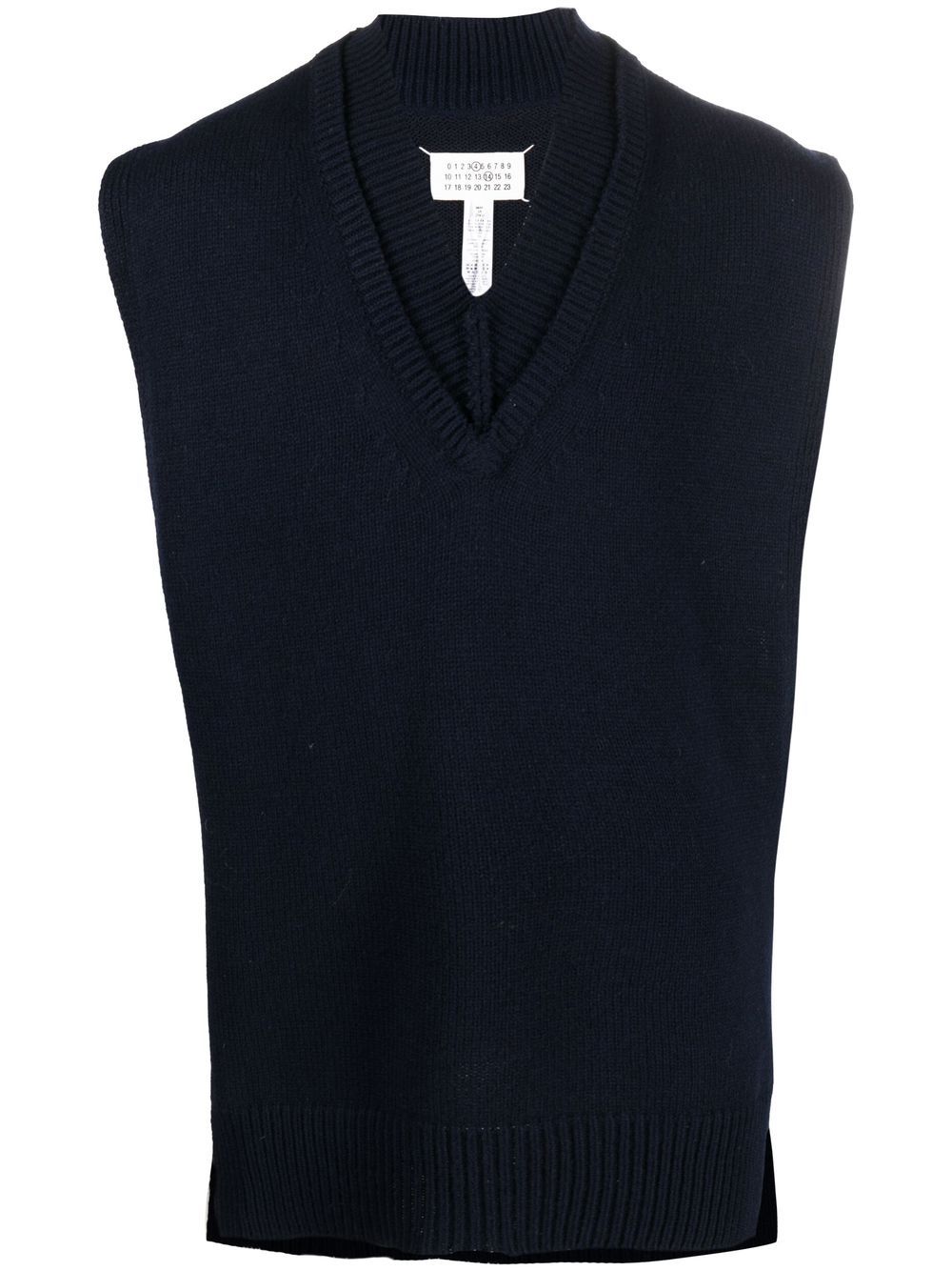 Blå, signatur firestinglogo, V-hals, ermeløs, ribbet hem og rett hem.