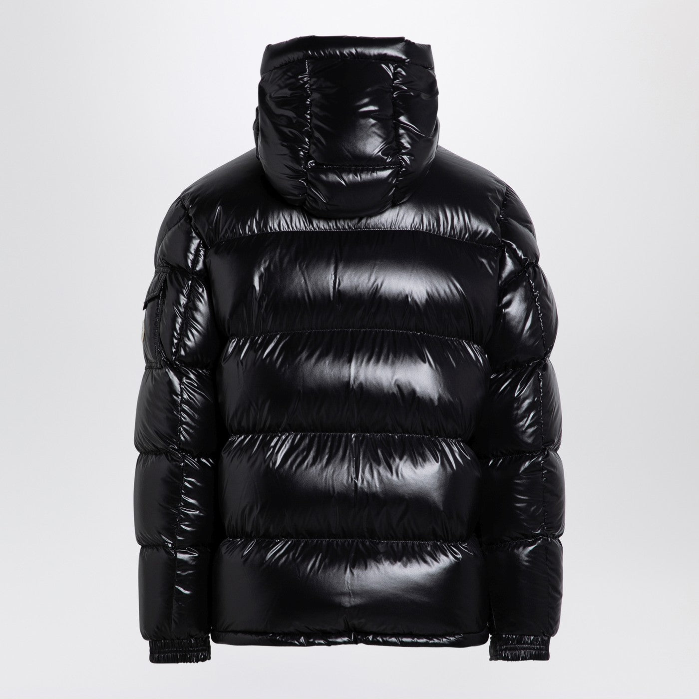 Svart skinnende polstret nylon kort nedjakke fra Moncler med lange ermer med en lapplomme med logo -lapp og trykkstudklaff, trakk hette, dobbel glidelås foran festing, justerbare elastiske mansjetter og to glidelåsede lommer.
