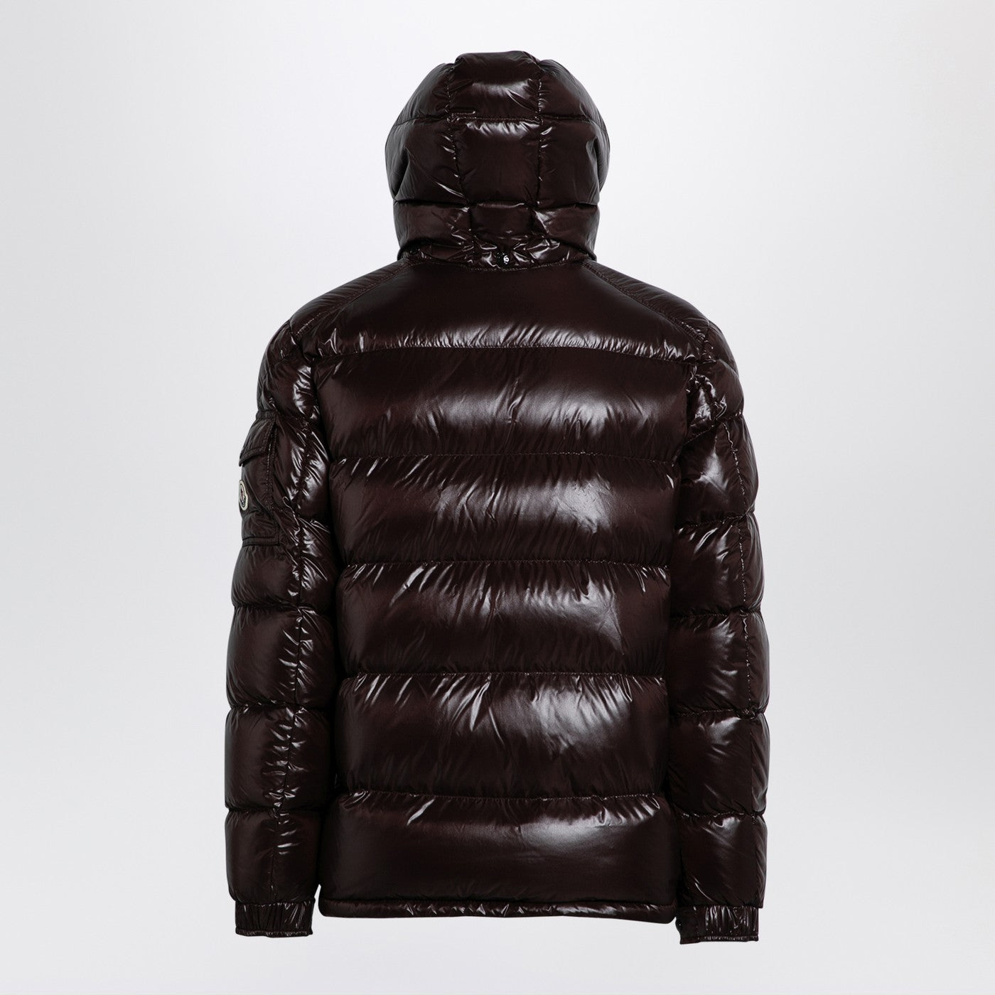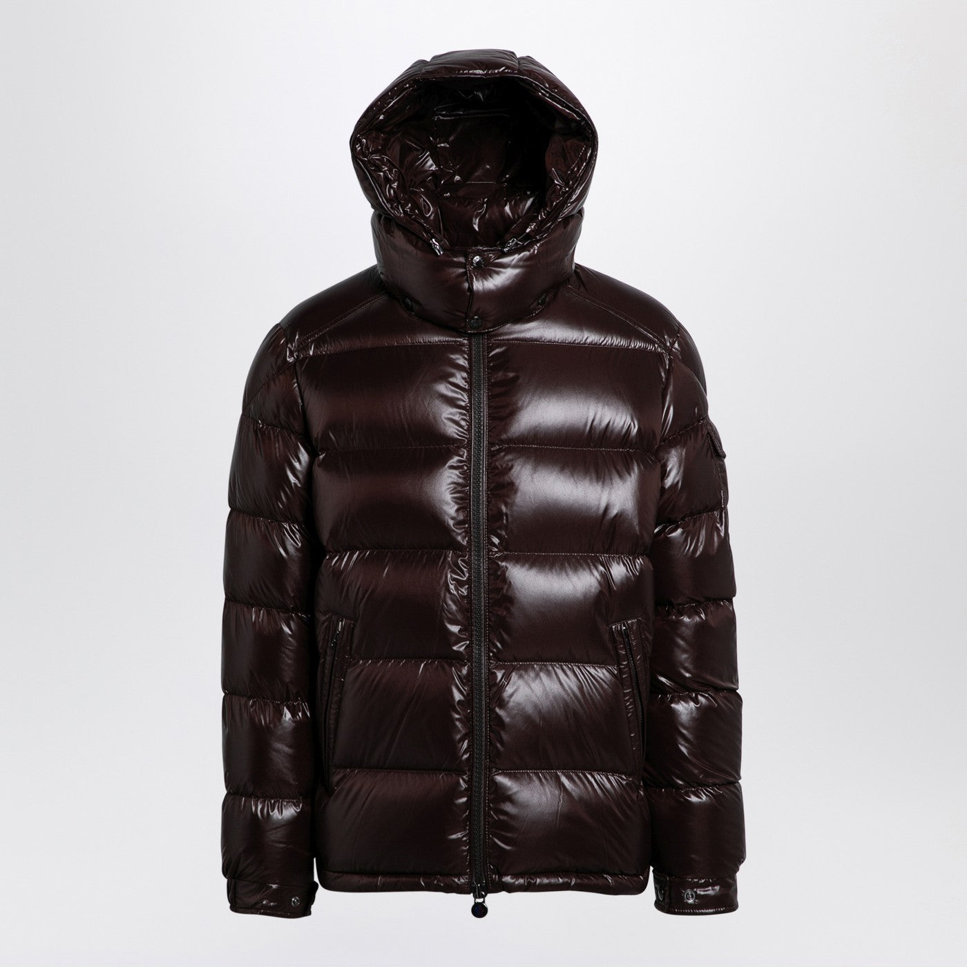 Brun skinnende nylon kort nedjakke fra Moncler med lange ermer med justerbare mansjetter og en lapplomme med logo -lapp, en dobbel glidelås foran festing, en høy krage, en avtagbar hette med snor og to smeltede lommer med sidelyper.