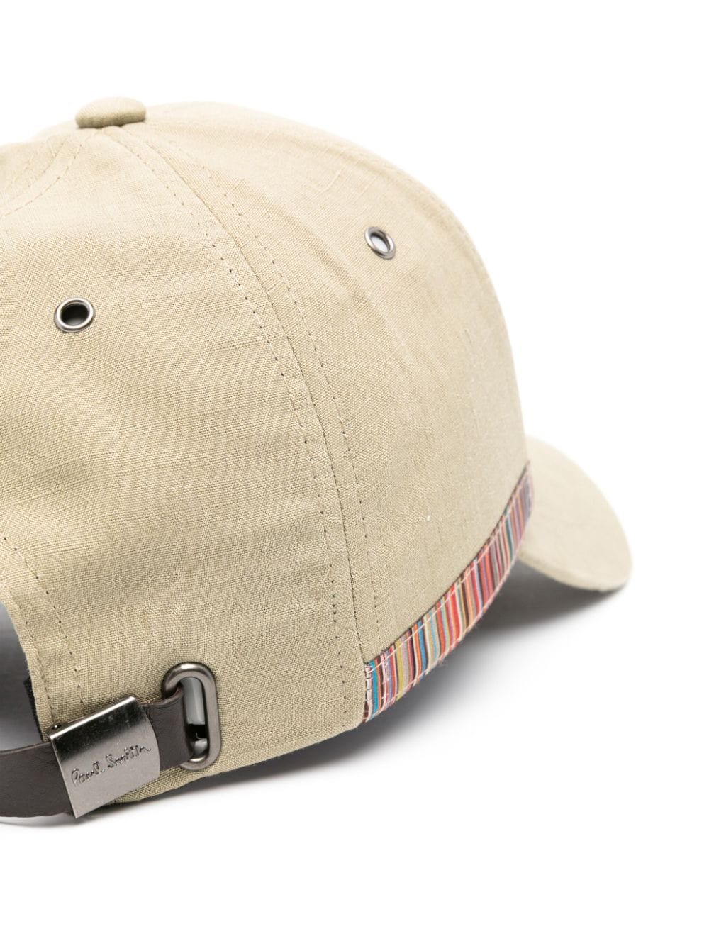 beige lin/lin poplin tekstur kunstner stripemønster til sidelogo-gravert spenne øyeleksjoner stoffdekket knapp på kronen seks panelkonstruksjon rundt krone buet topp bak glidebuckle fasteing