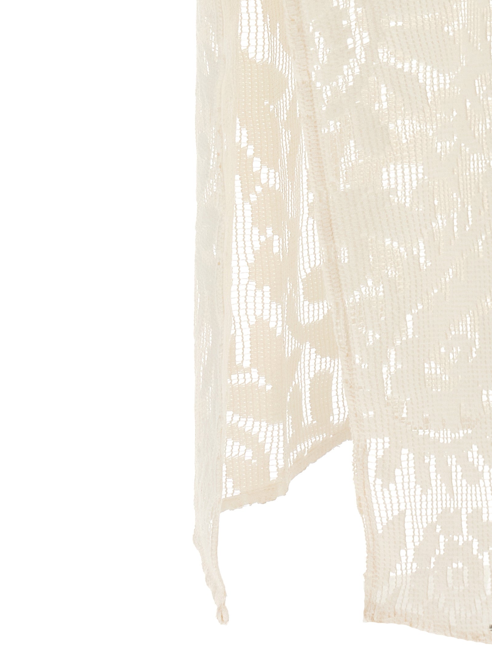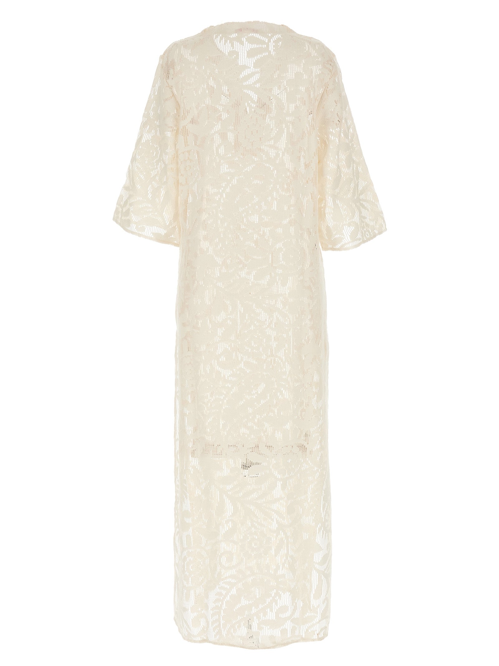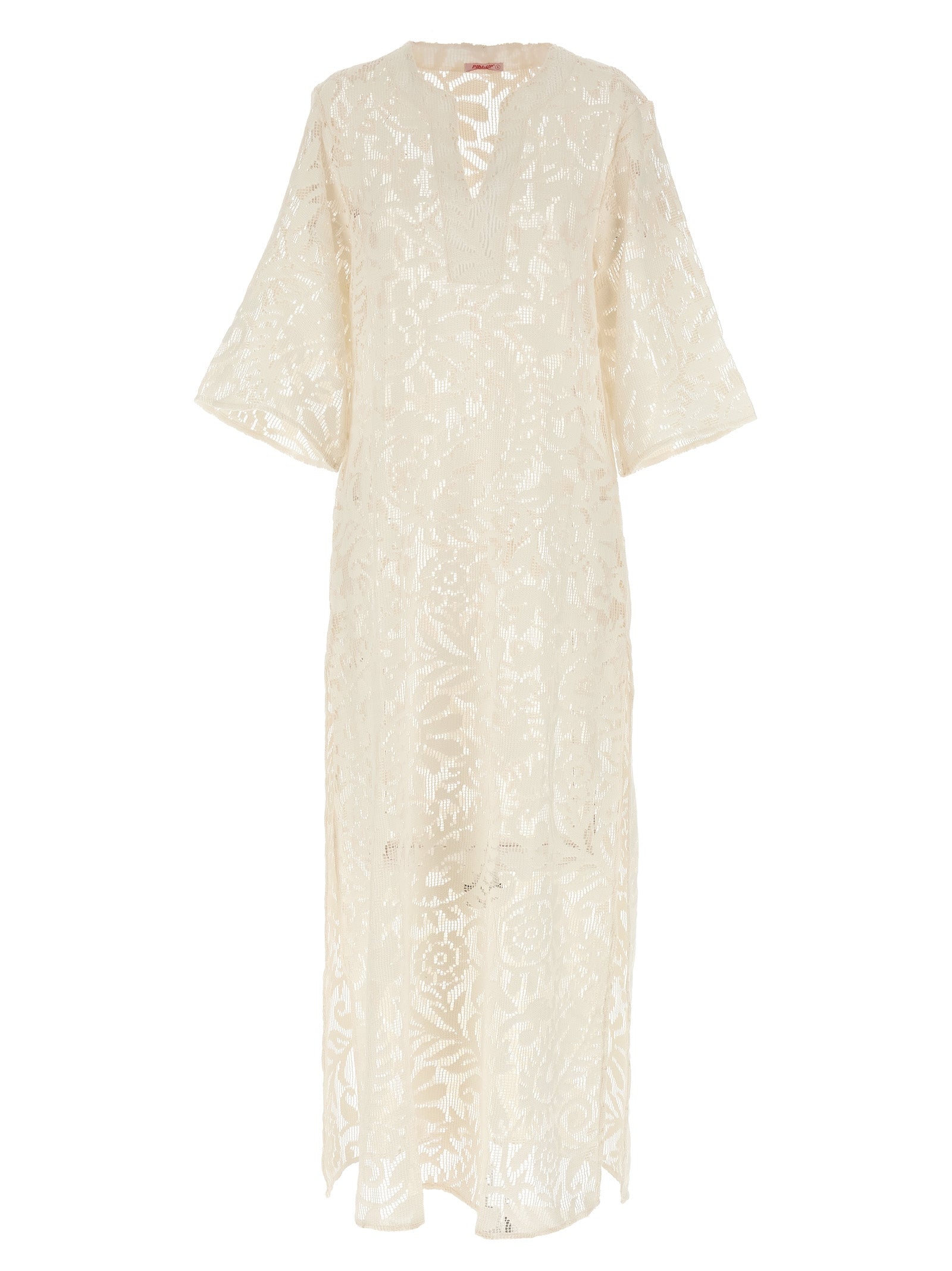 Lang kjole i makramé effekt stoff jeg ser at jeg ikke ser, kaftanmodell, v-hals, 3/4 ermer, sidespalte.