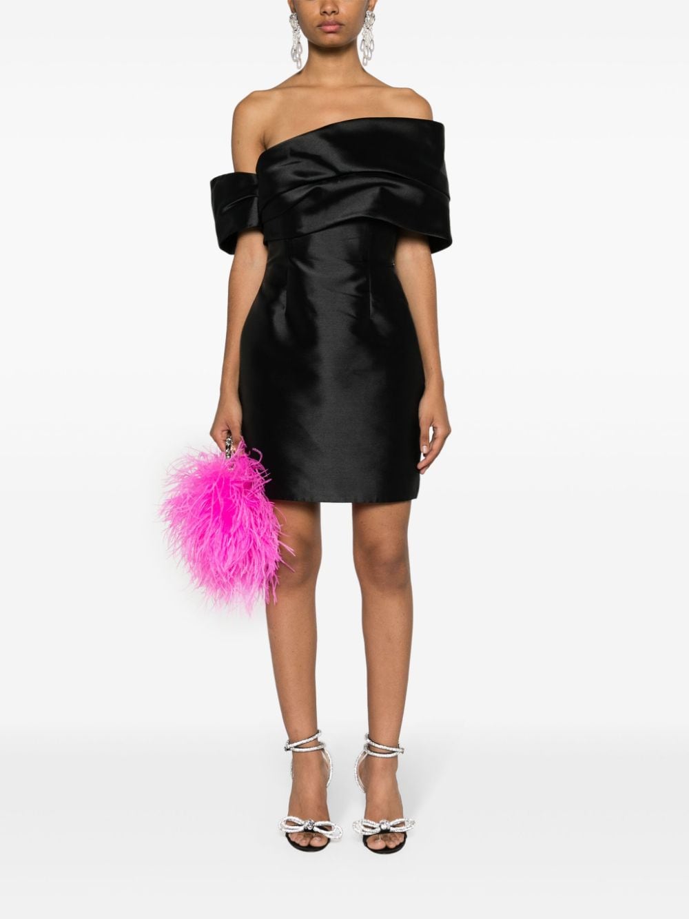 Jet Black Stretch-Design Satin Finish Plissed Panel Detail Dart Detaljering Off-Shoulder Enkel kort erme Montert midje skjult side Zip festing Rett hem Full fôr Lårlengde