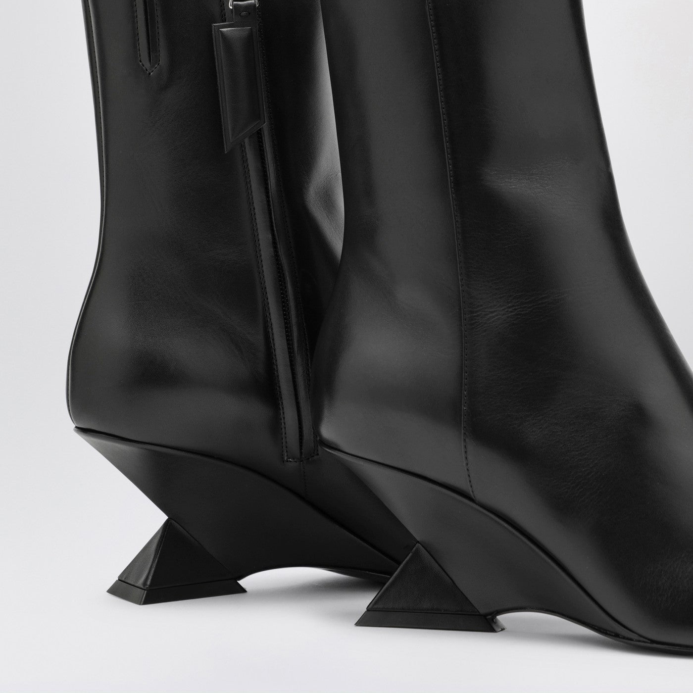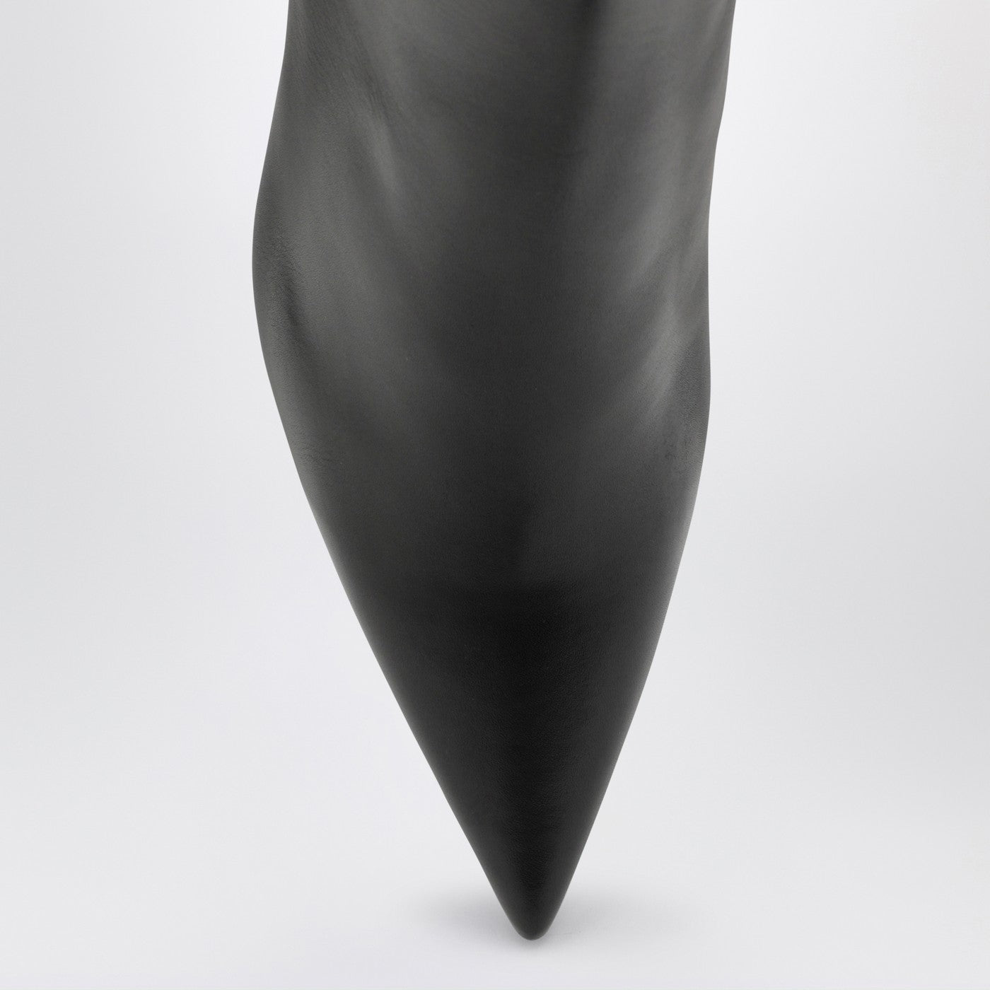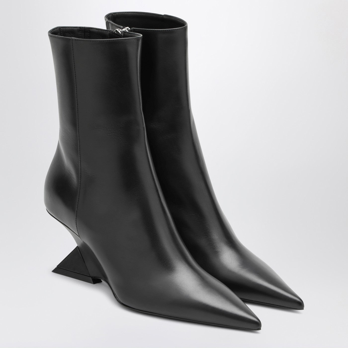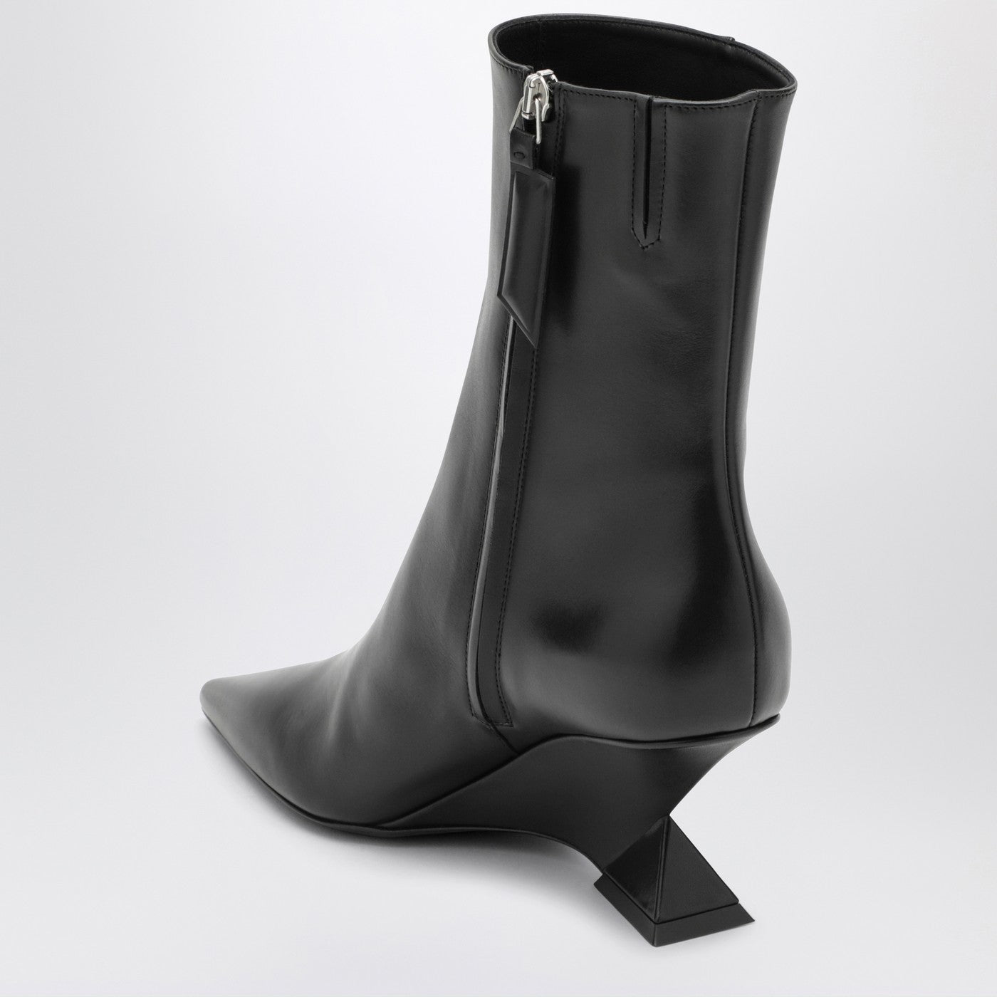 Svart skinnmedium ankelstøvel fra Attico med en spiss tådesign, glidelås på innsiden, pyramidehælen og skinnsesen.