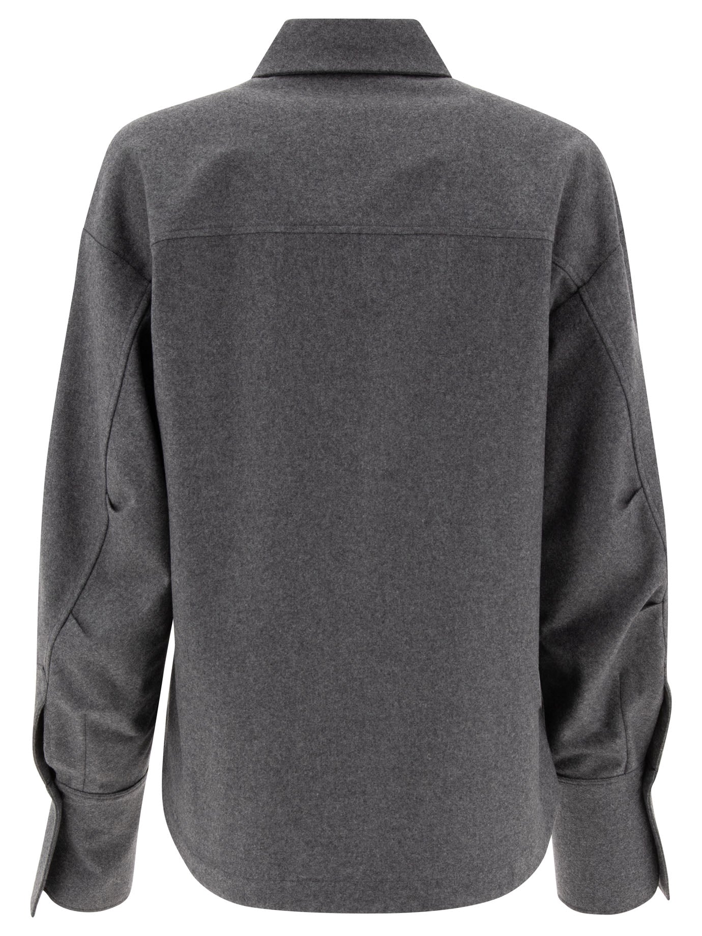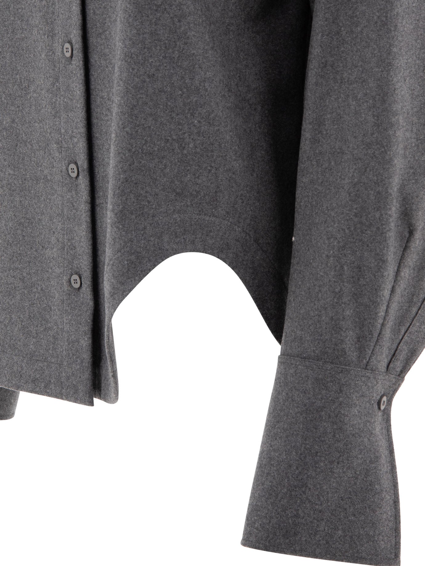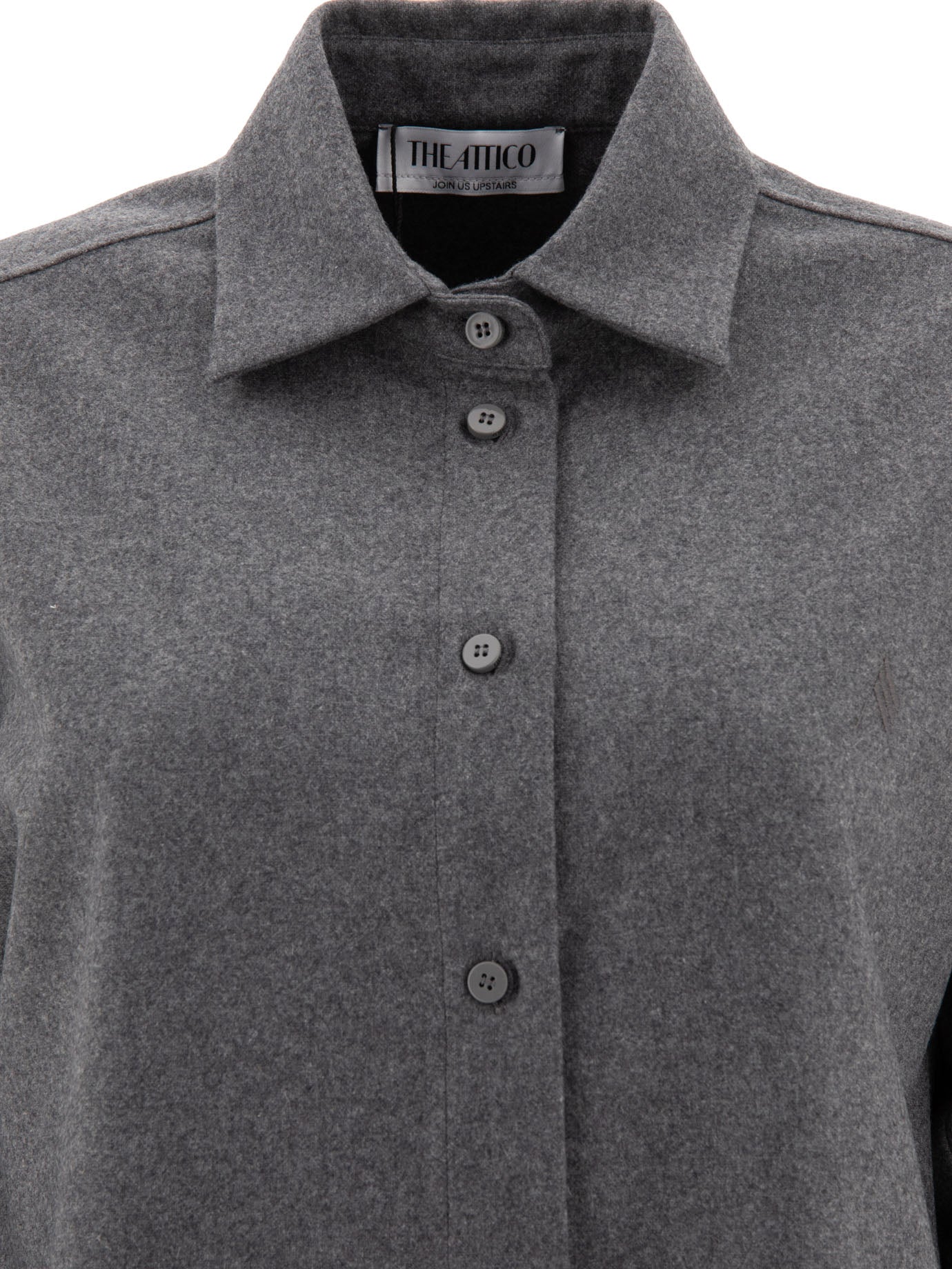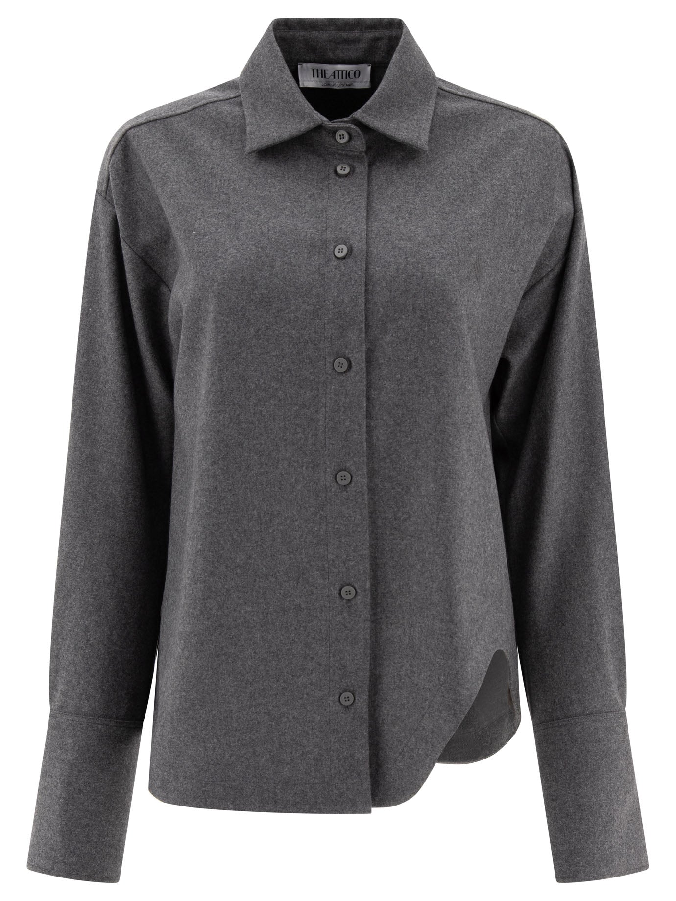 "Eliza" -skjorta fra loftet er det ideelle plagget for den moderne kvinnen som søker den perfekte blandingen av stil og komfort. Denne skjorten er laget av grå melange ullklut, og kan skilte med en sofistikert design forbedret av en formet spalte- og logo -broderi, elementer som gir et eksklusivt preg til ethvert antrekk. Perfekt for enhver anledning, skiller denne skjorten seg ut for sin allsidighet og raffinement. || - Vanlig passform - Klassisk krage - Knapplukking - Asymmetrisk || Par den med et par jeans med høy midje for et uformell-elegant utseende, eller med et blyantskjørt for et mer formelt antrekk. Kompletter det med fastfarget tilbehør og pumper for et snev av eleganse.