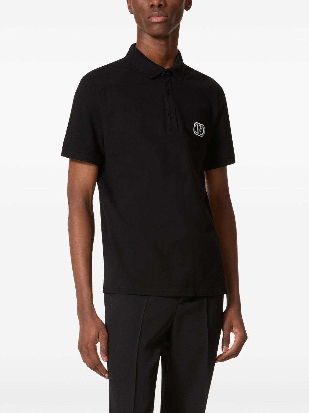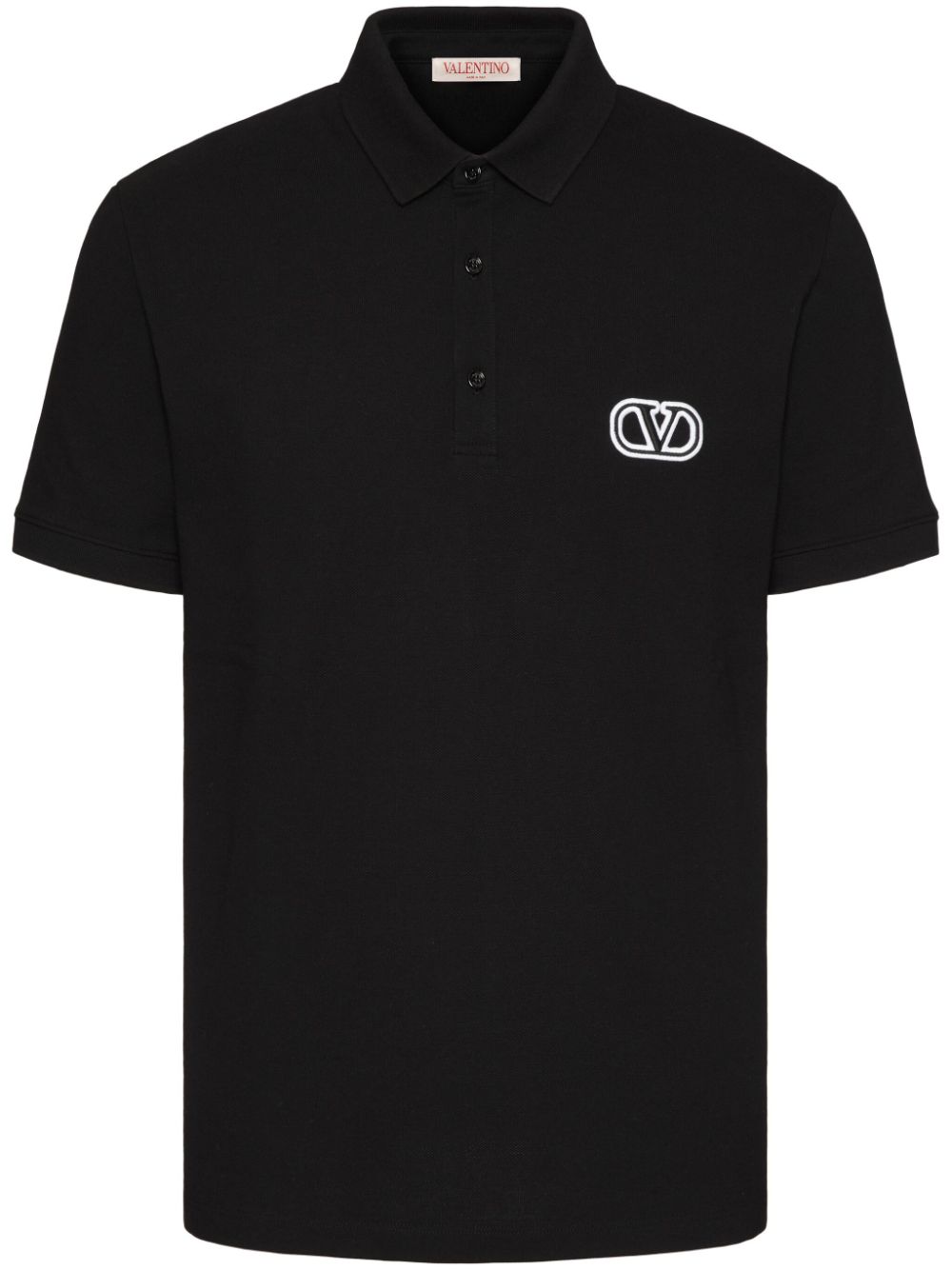 Valentino klar til å bruke svart bomullspiqué veve vlogo signatur logo lapp ved brystet polo krage frontknapp placket korte ermer korte sidespalte rett hem