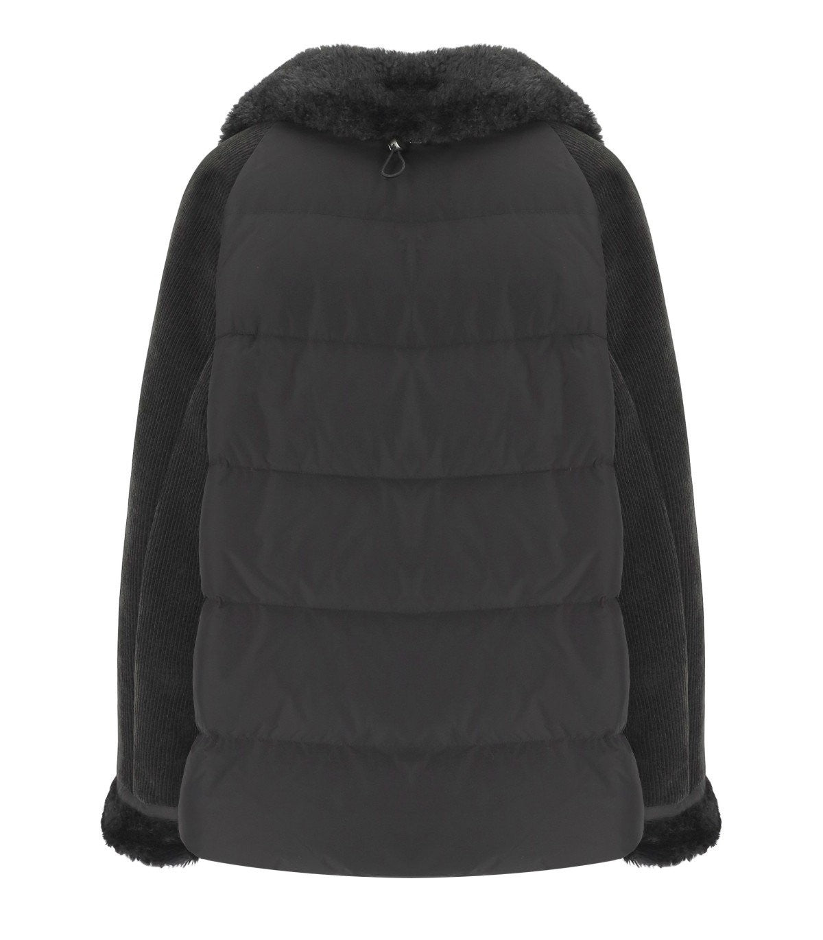 Short Xenia jacket by Duno made externally of corduroy fabric in black. Characterized by a central closure with a double-slider zip, it features a collar and horizontal stitching on the back. Equipped with flap side pockets. Inner part in faux fur. Oversized fit. Outer composition: 100% polyester. Secondary fabric: 100% polyester. Main lining: 100% polyamide. Down filling.