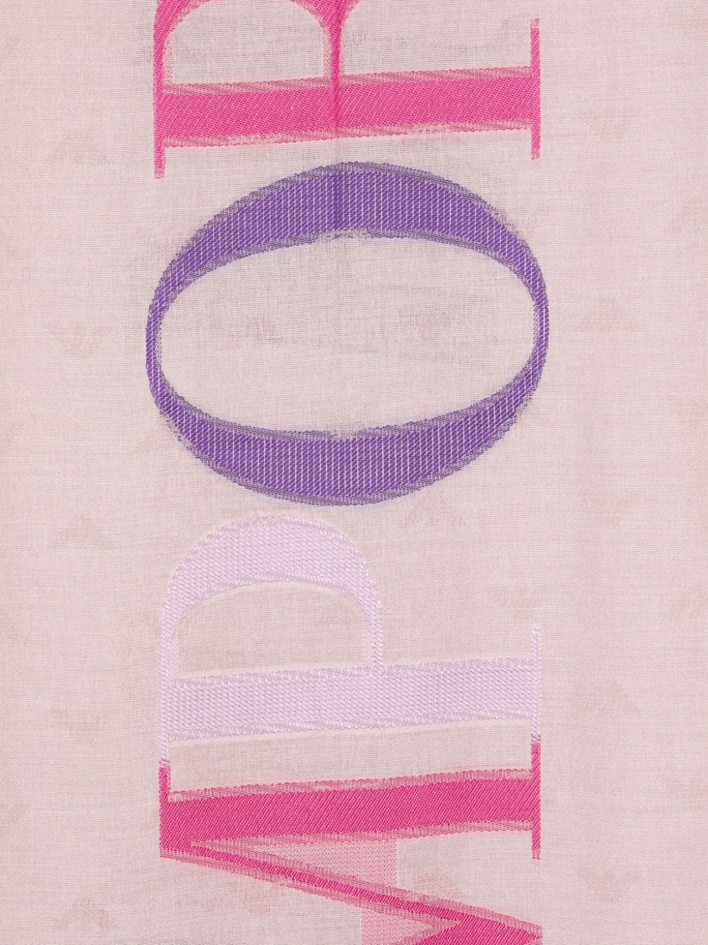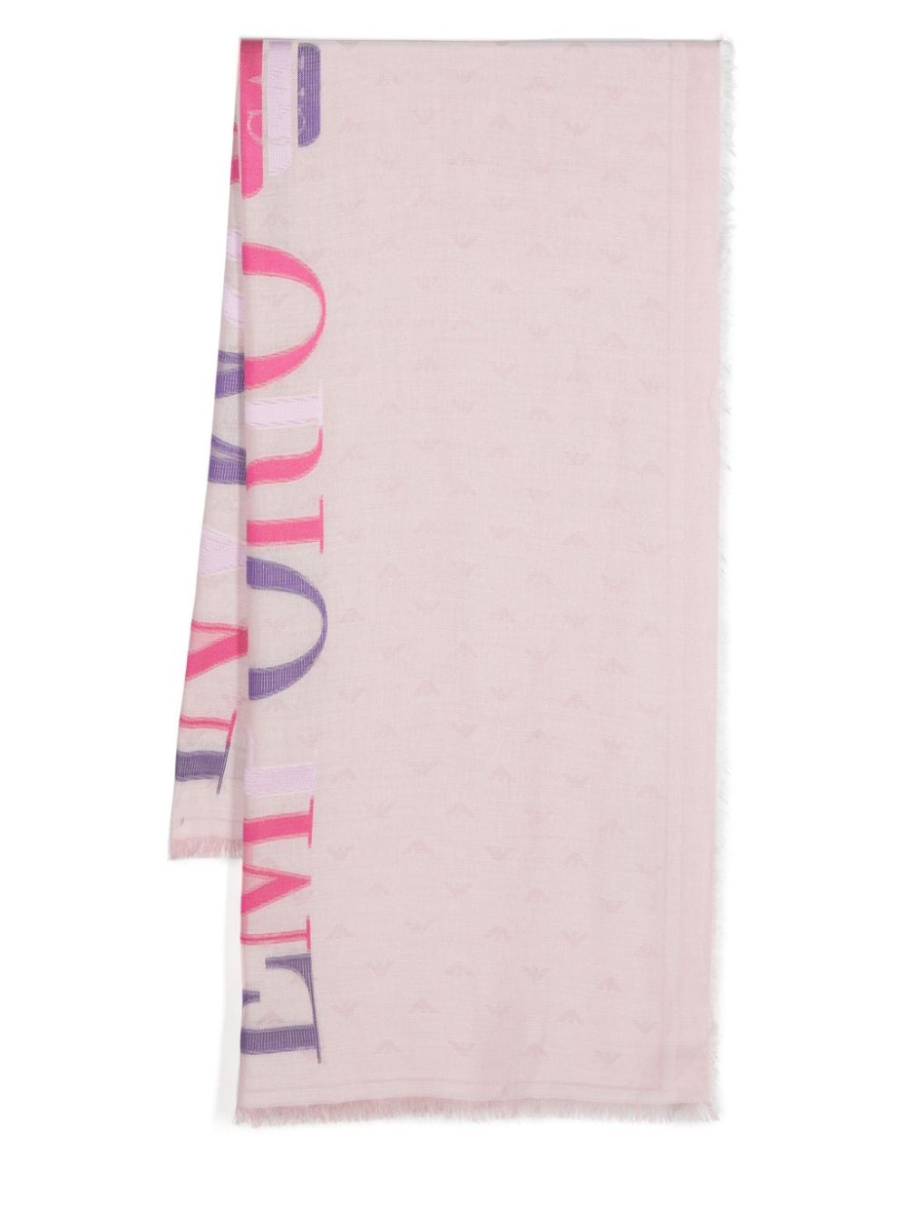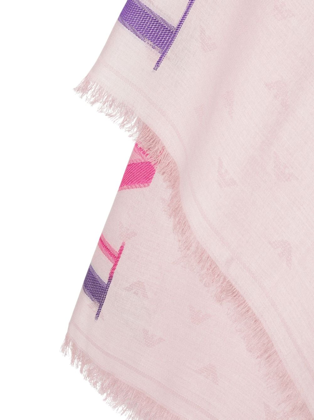 pink/purple textured finish rectangle shape jacquard logo motif embroidered logo to the front fringed edge wraparound style