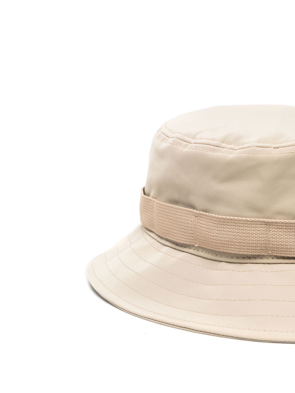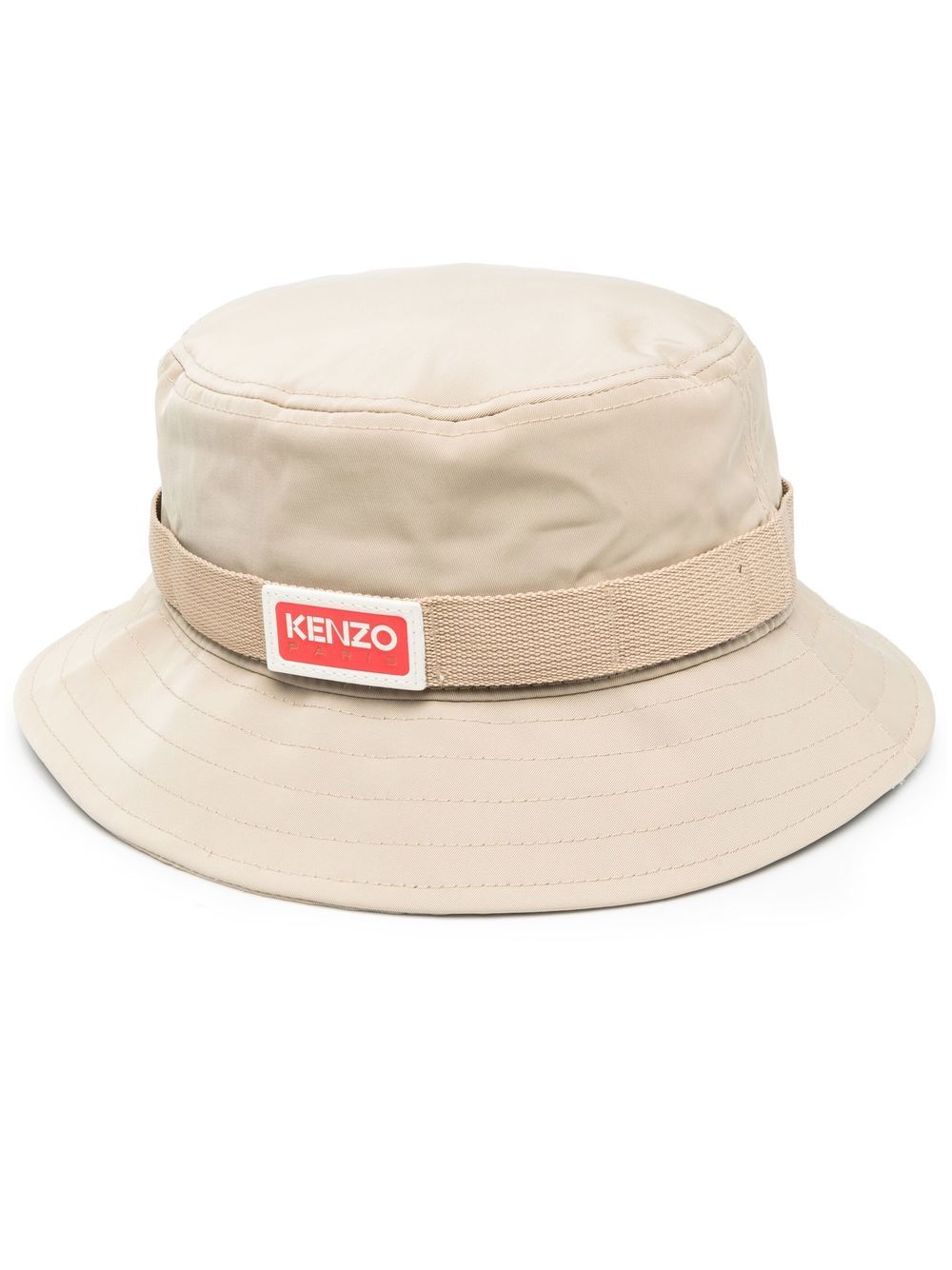 Bawełniany kapelusz kubełkowy z Kenzo z beżą, bawełną, łatką logo do przodu, detale z paskiem, płaski szczyt i zakrzywiony wąski brzegi.