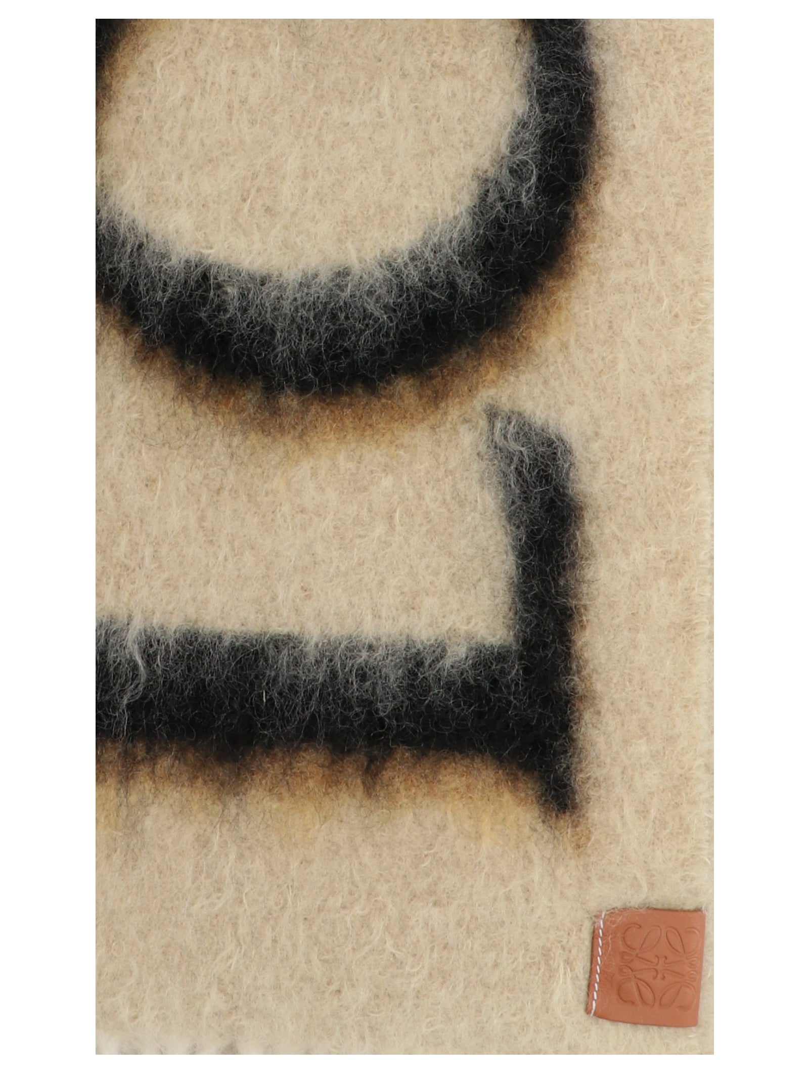 MOHAIR SCALLF z frędzlami na obrzeżach, dwukolorowe logo „Loewe”, skórzana łatka logo „Anagram”.