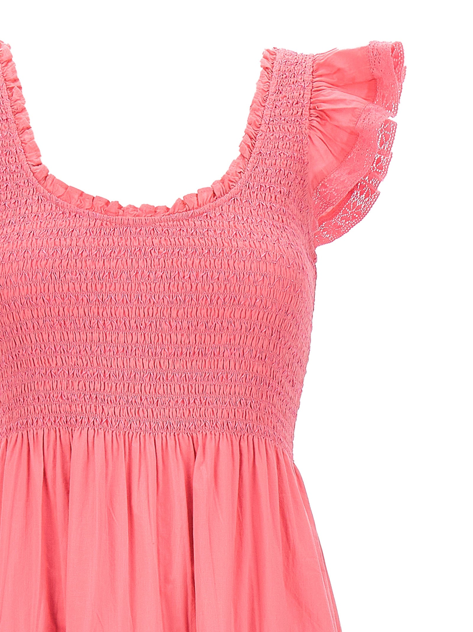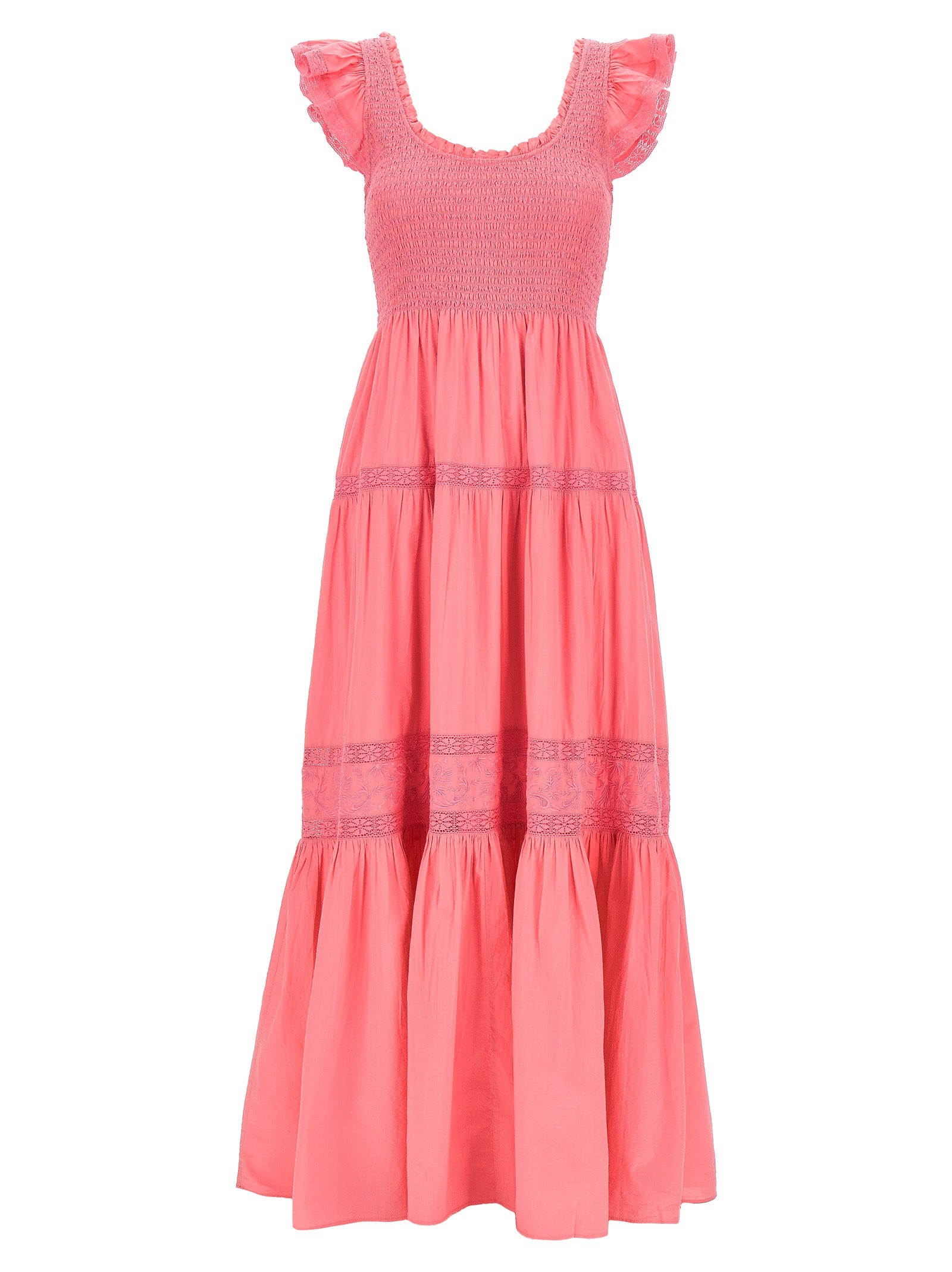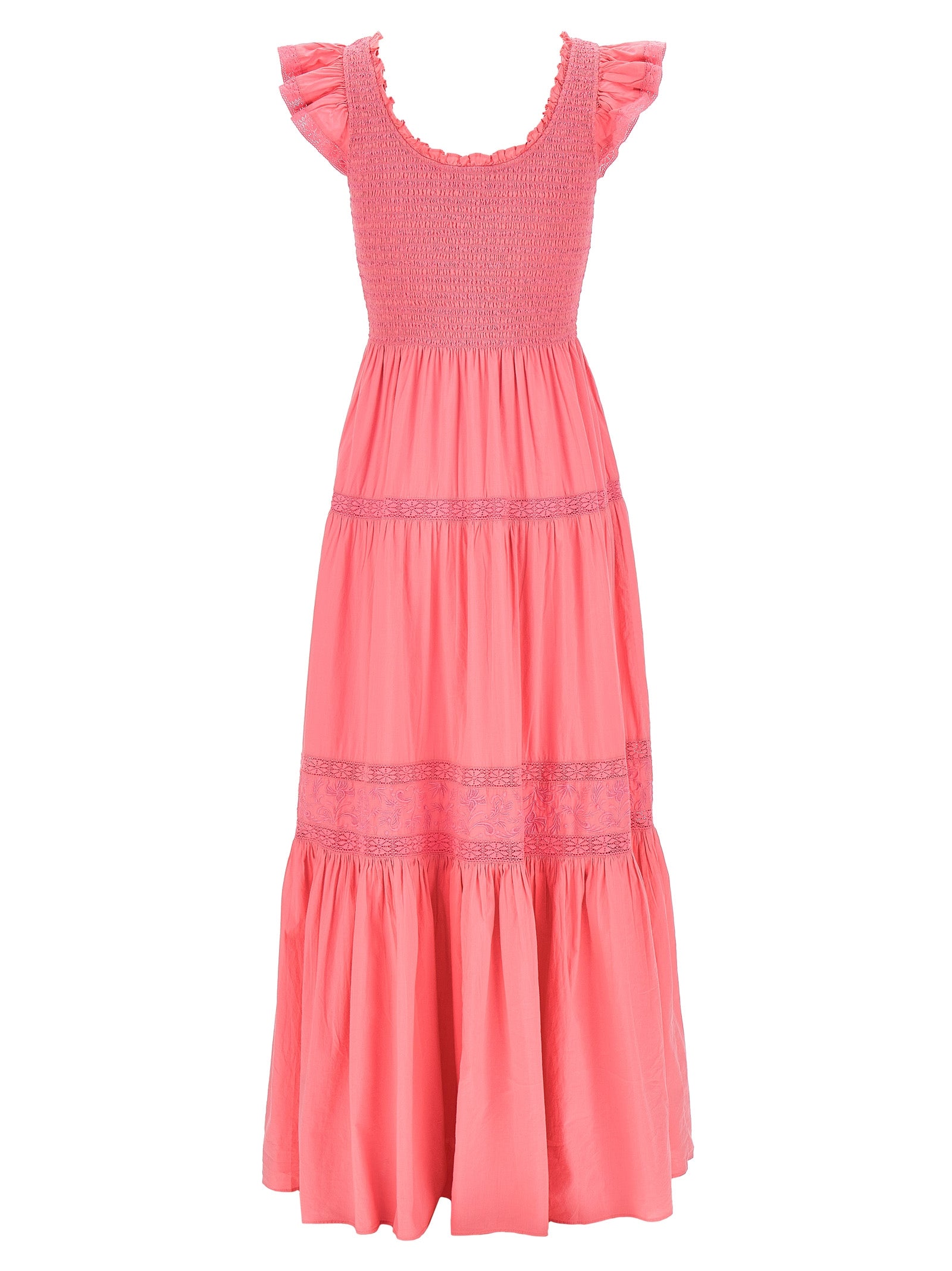Długa bawełniana sukienka Chessie z koronkowymi wkładkami i haftami, krótkie rękawy marszczące, okrągły dekolt i stanik z ściegu.