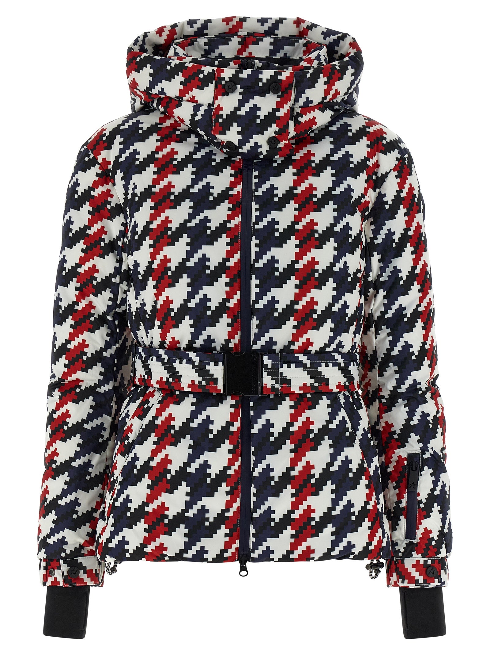 Kurtka narciarska „Candice” z wodoodpornego materiału technicznego, ocieplana puchową kurtką maxi o gęstości wypełnienia 700, z nadrukiem w pepitkę, oddychającą podszewką z siateczki, kształtem klepsydry, regulowanym i odpinanym kapturem pasującym do kasku, stojącym kołnierzem, przednim zapięciem na zamek, kieszeniami, długimi rękawami z regulowanymi elastycznymi mankietami i wiatroszczelnym getrem, wewnętrznym ocieplaczem i sznurkiem na dole. Model wyposażony w technologię RECCO®.