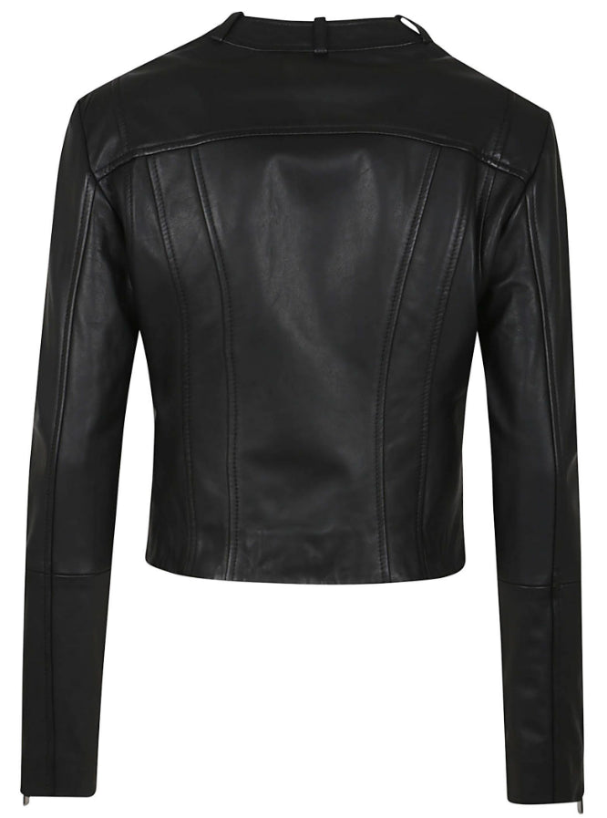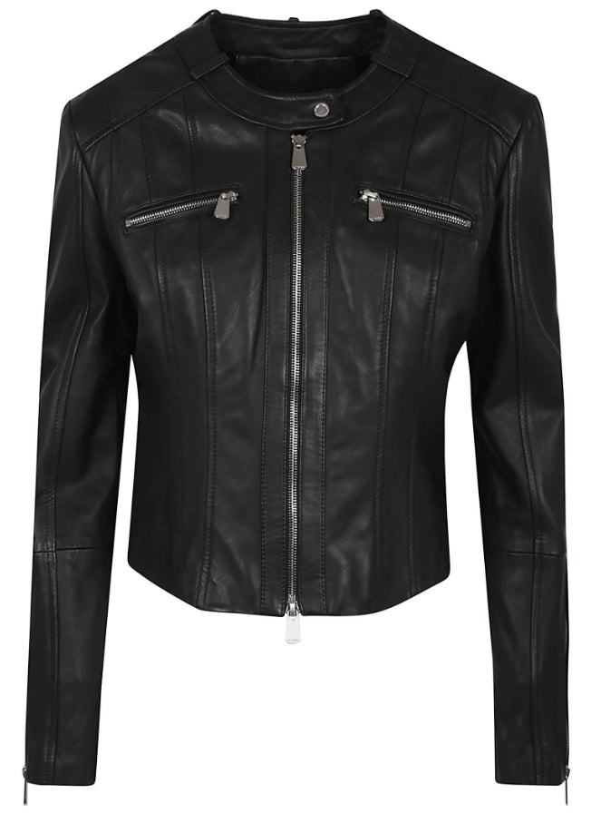 Kurtka motocyklowa w skórze Nappa. Zamknięcie podwójnego zacieśniania z przodu; Okrągły dekolt z pętlami i przełączonymi; W Nappa skóra zamknięta metalowym przyciskiem snapa i kieszeni zamkniętymi z zamkiem z przodu; Szczupła konstrukcja i lekko skrót. Charakteryzuje się klasyczną szczupłą linią i lekko skrótem.