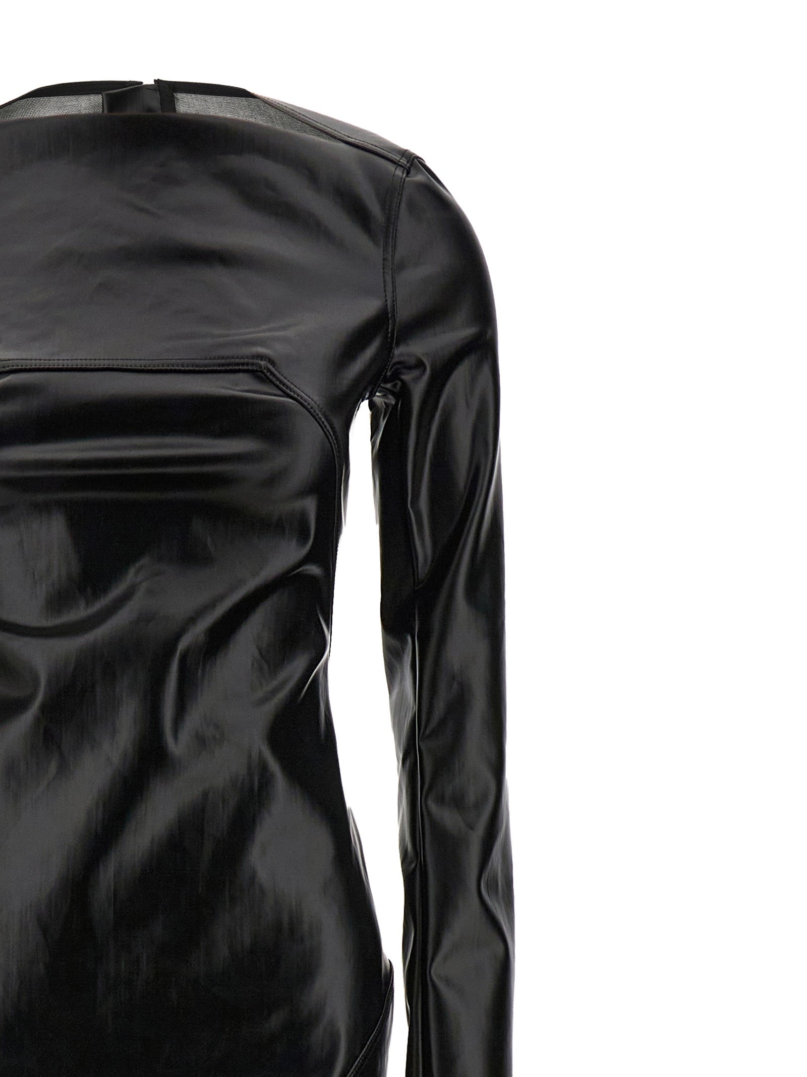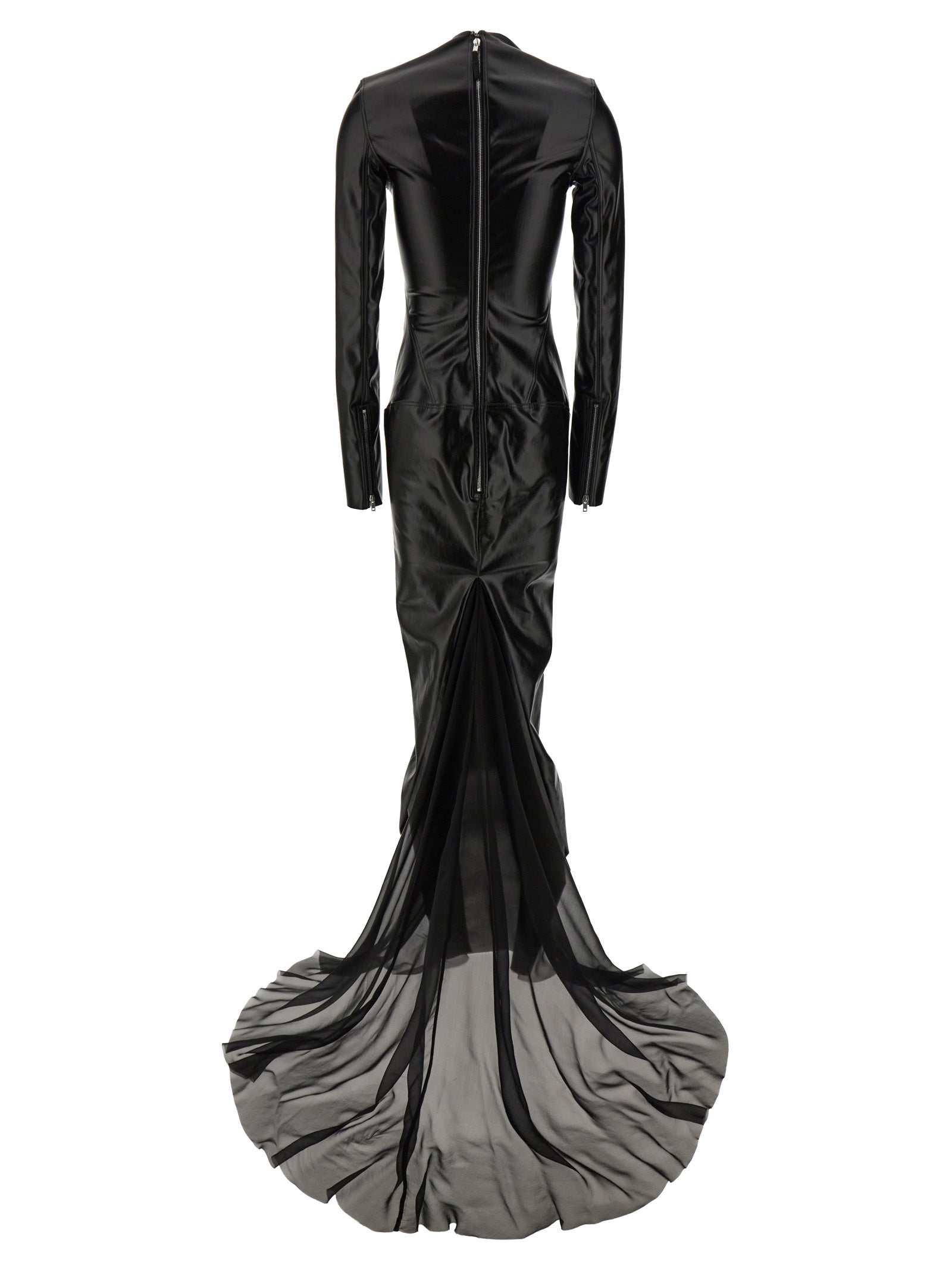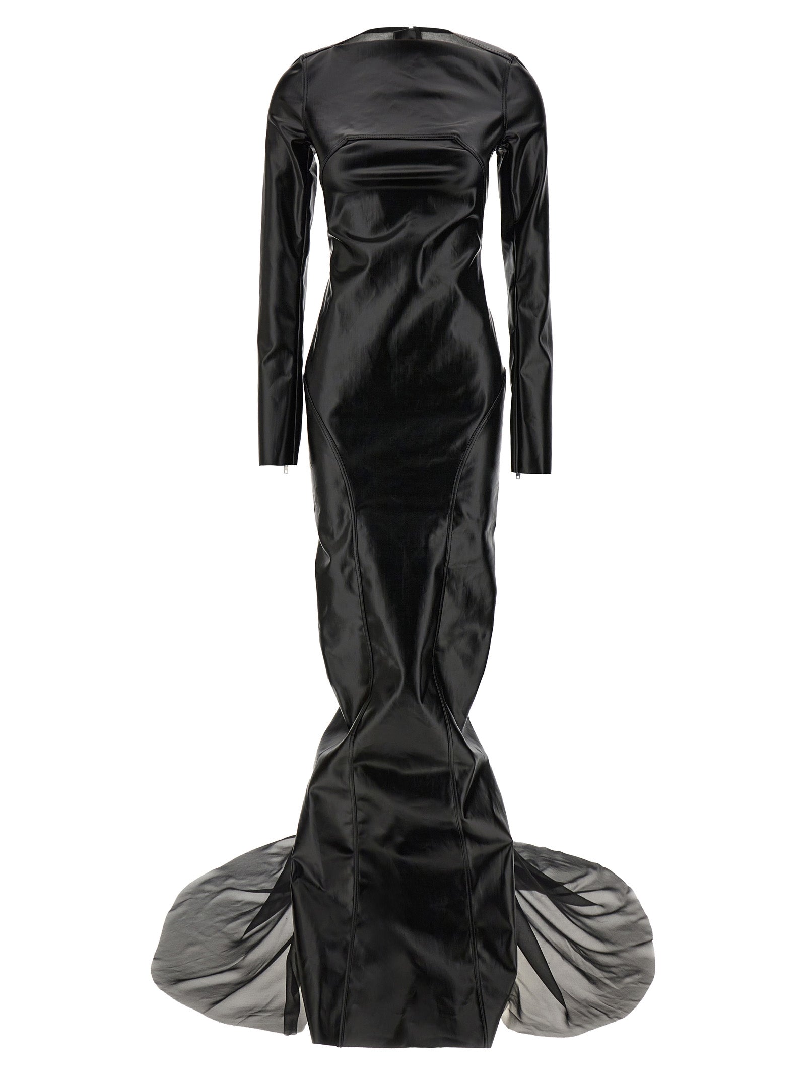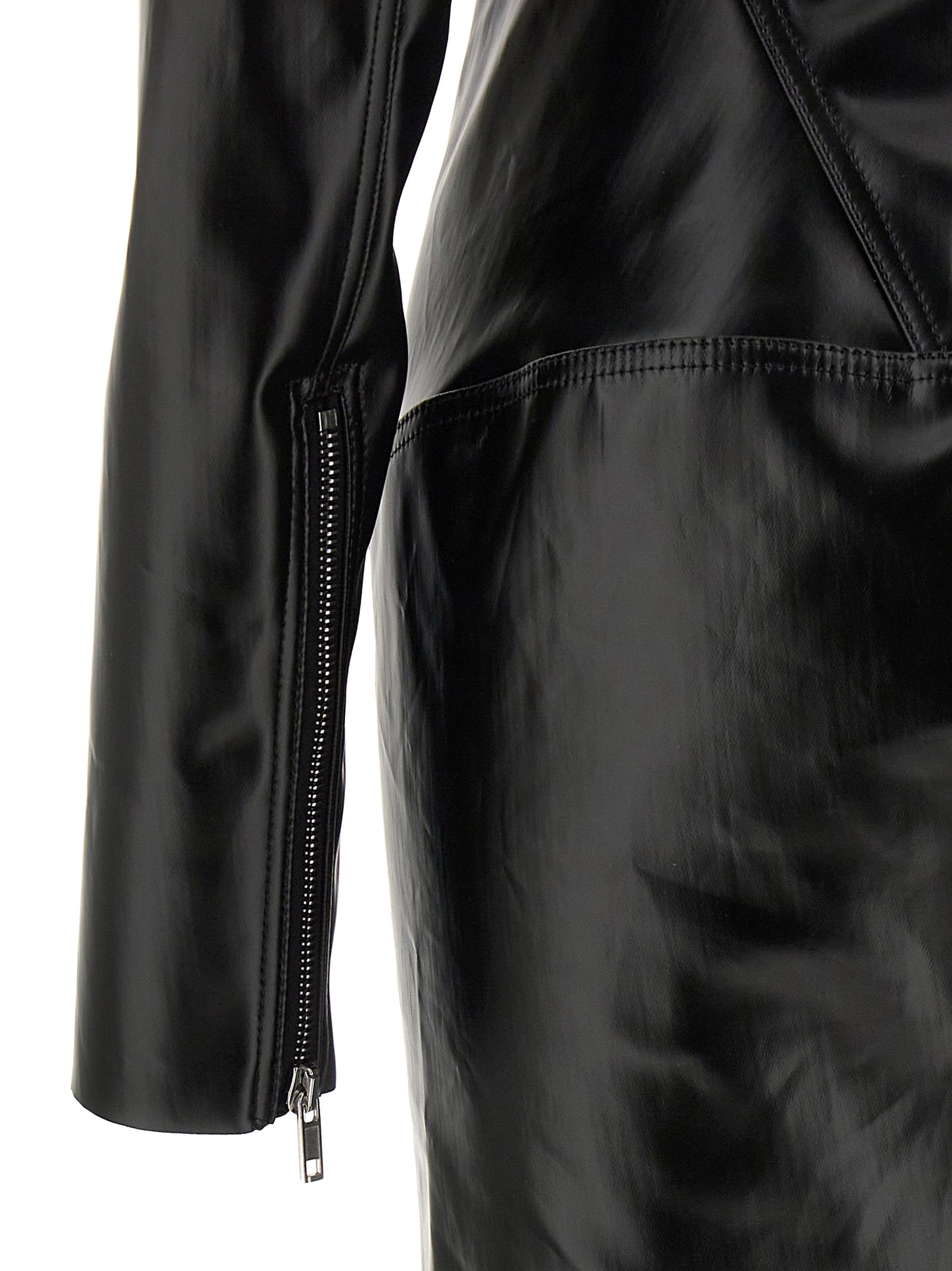 Sukienka „AL Kolumna” w rozciągnięciu dżinsie z gumową powłoką. Extra długi styl, szczupły dopasowanie z długimi rękawami z detalami zamka na nadgarstku, zamykanie zamka z tyłu, szyi łodzi.