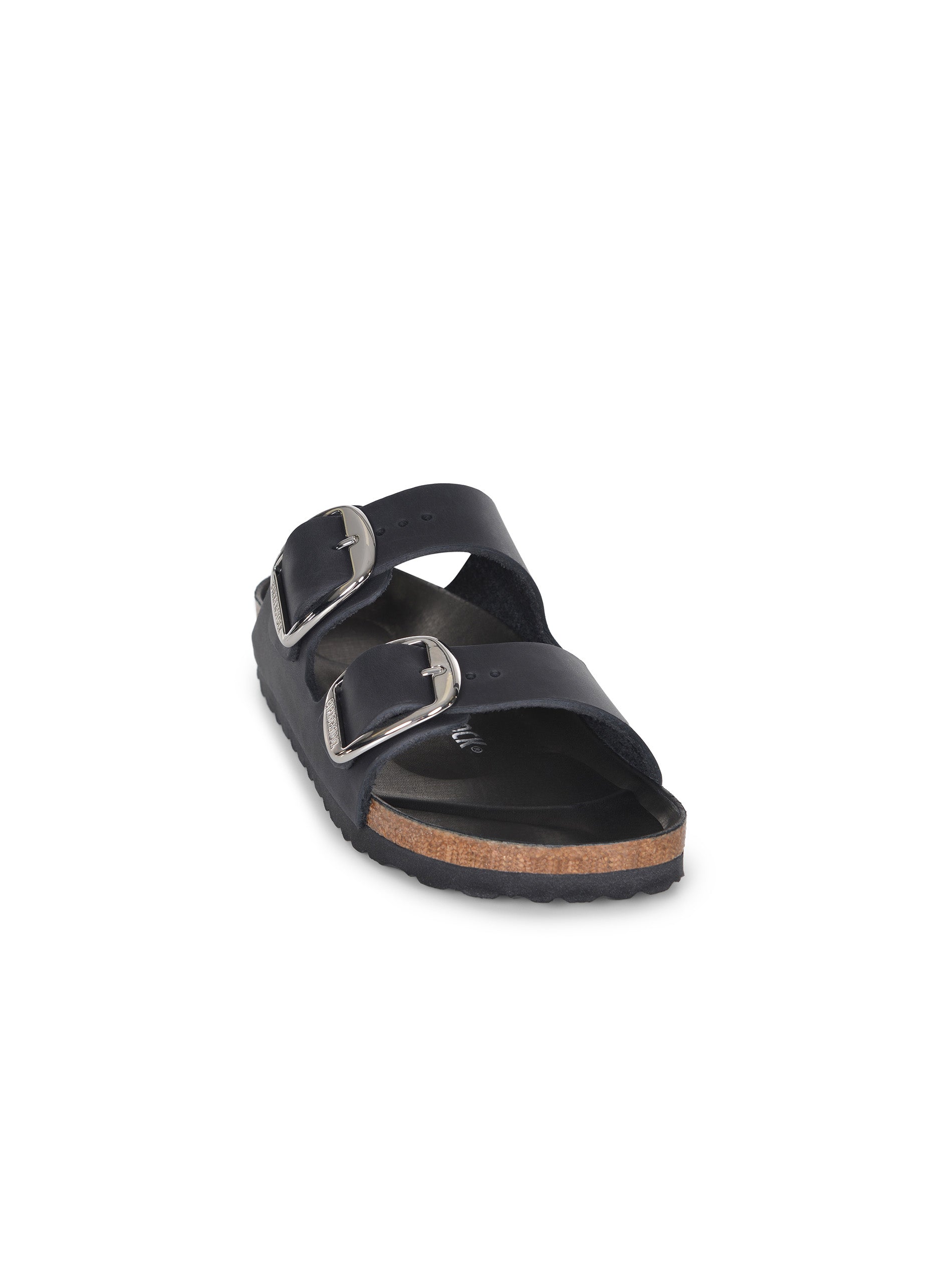 Kapty Birkenstock „Arizona” w czarnej skórze. Szczegóły dwóch pasków ze srebrnym metalowym klamrą szpilkową, indywidualnie regulowane. Czarne anatomiczne wkładki w korku i kradzież. Eva gumowa podeszwa. 100% skóry wykonanej w Niemczech