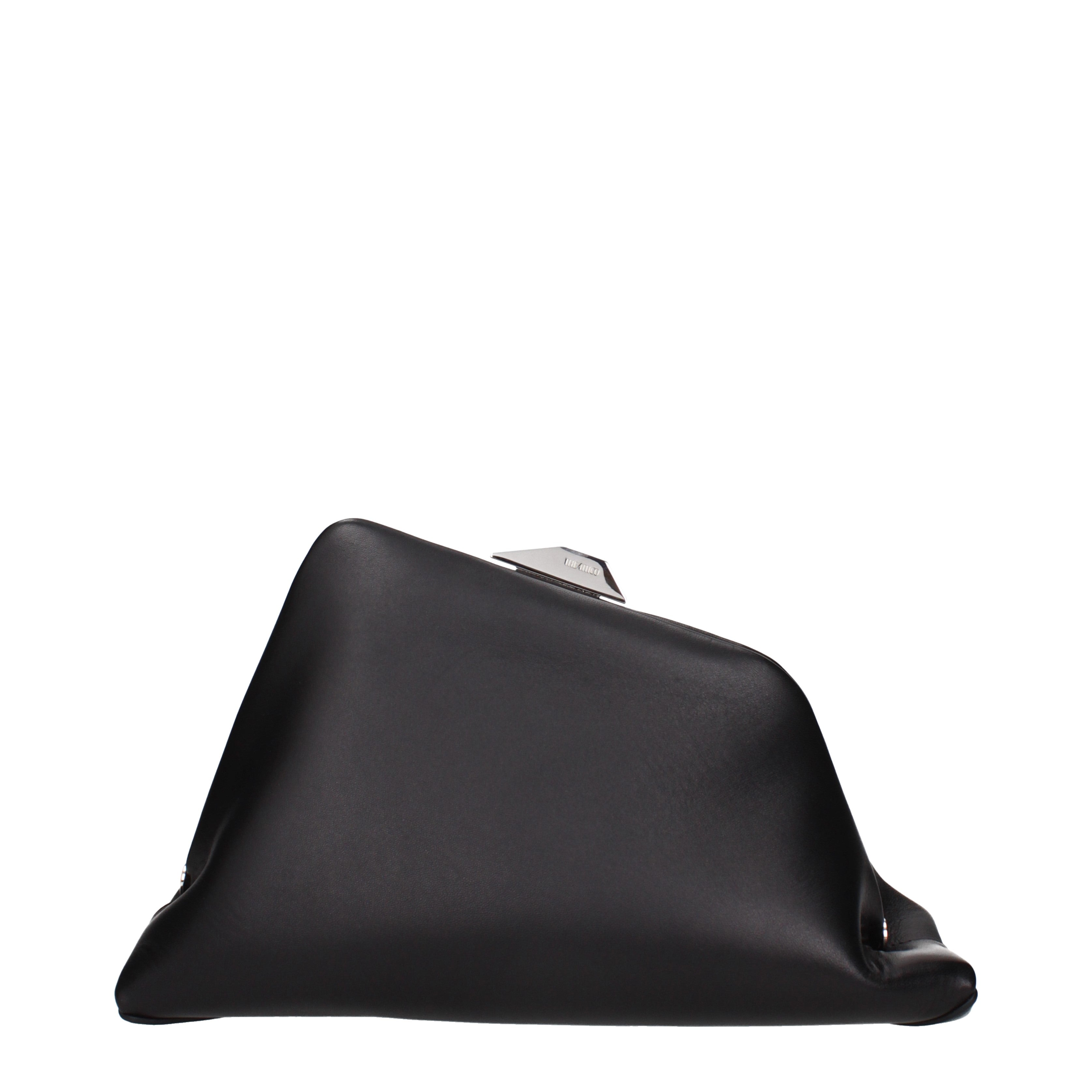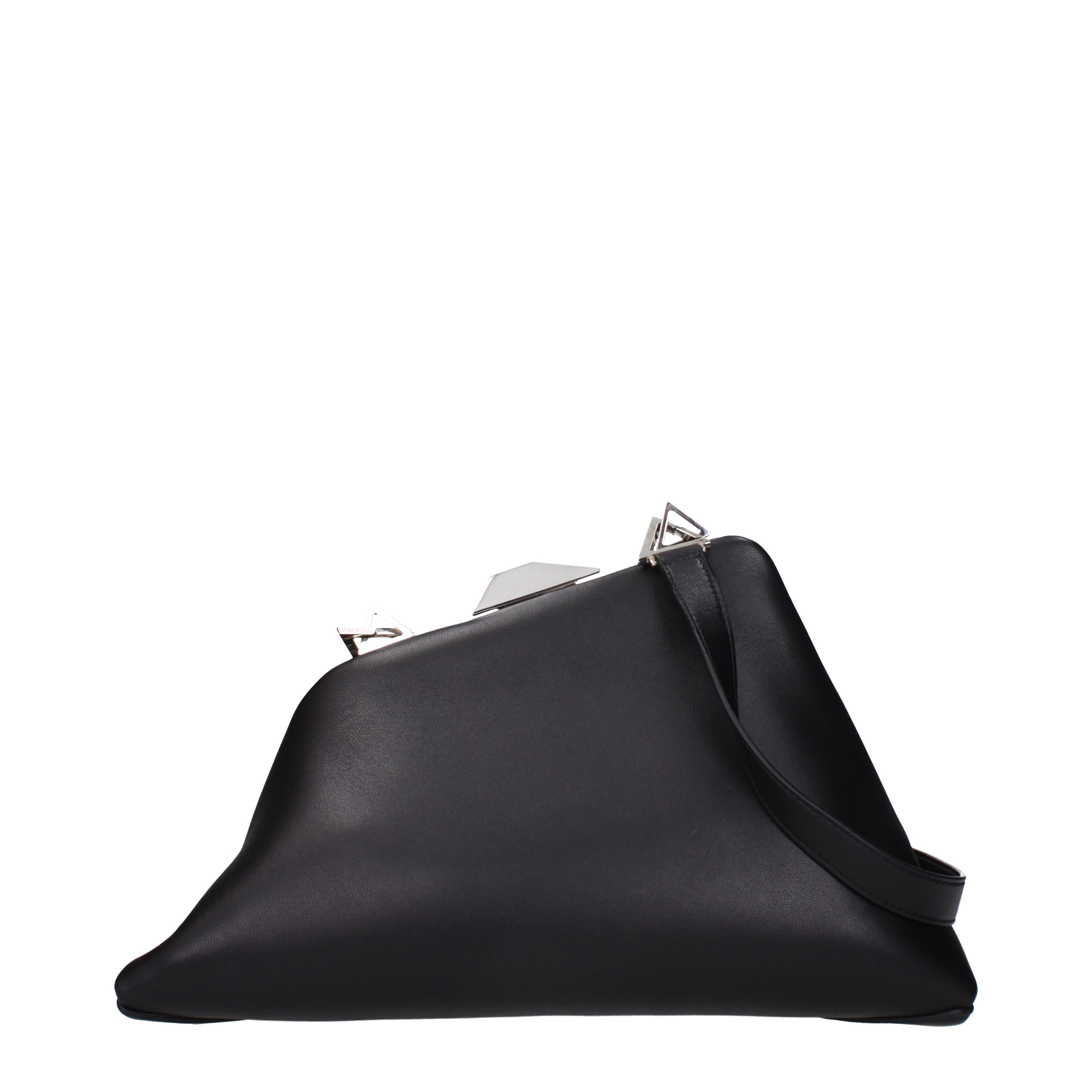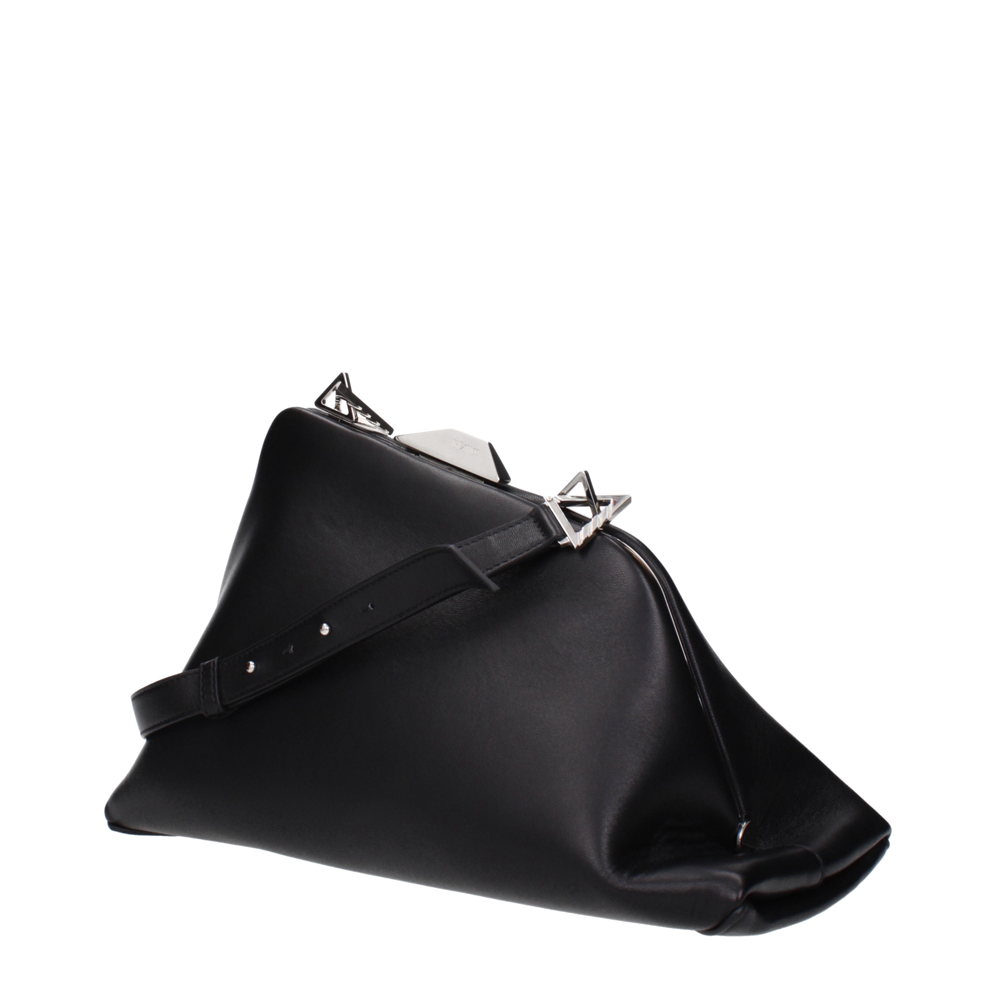The item with MPN AH00049LBT001AA100 and code F83807 in leather of color black belongs to the clutch category by designer The Attico. It features characteristics such as front logo, adjustable handle, removable handle, intentionally scratched areas that may vary, vintage effect.