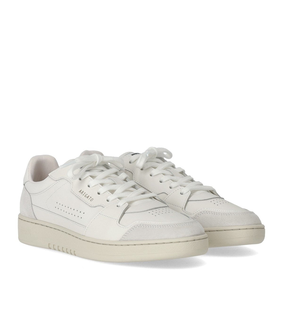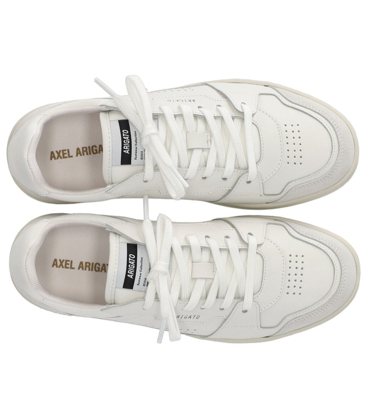 Kroje sneakerowe autorstwa Axela Arigato wykonane z zamszu na biało z szarymi detalami. Charakteryzując się w stylu vintage i nowoczesnym, ma projekt panelu, wykończony perforacjami i wytłoczonym złotym logo. Wyposażony w bawełniane koronki tonowe, podszewkę do tkanin i markowy język. Biała skórzana pięta. Gumowa podeszwa. Wysokość 3 cm.