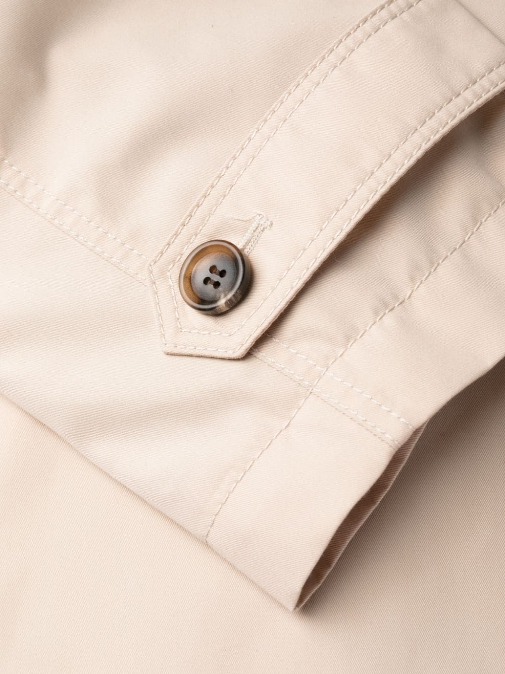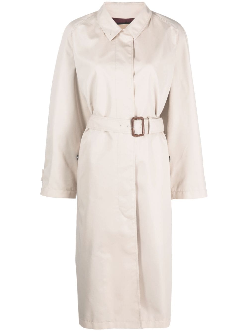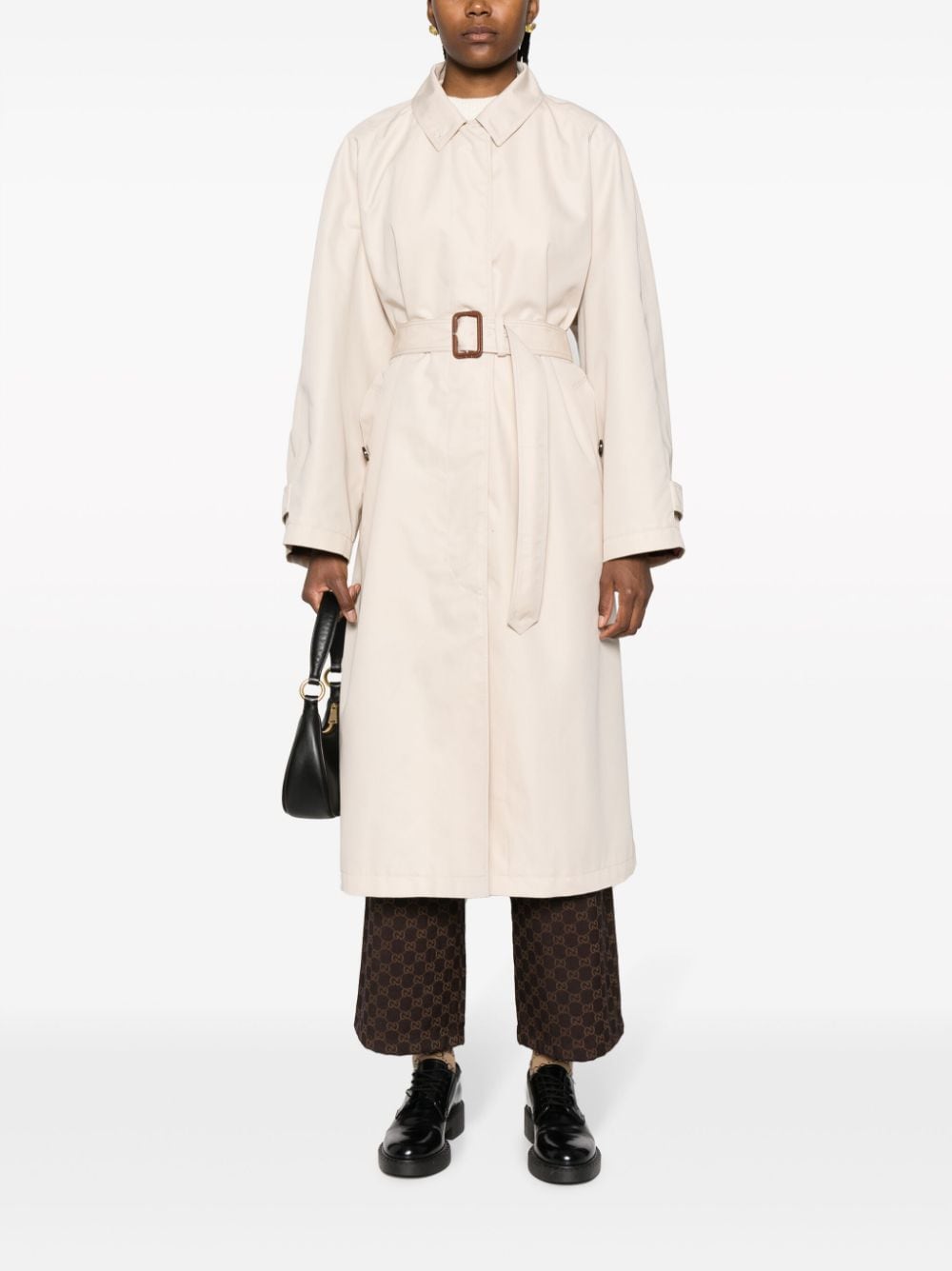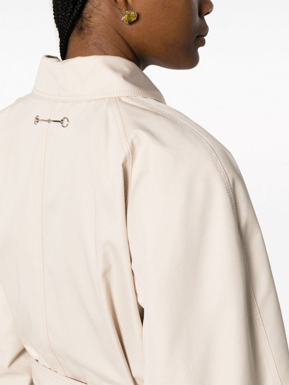Pasowy płaszcz gabardinowy z Gucci z beżem, mieszanką bawełnianą, splotem gabardine, charakterystycznym detalem koni, spiczastego płaskiego kołnierza, ukrytego przedniego zapięcia przycisku, odłączonego paska, długich raglanów, mankietów, dwóch bocznych kieszeni cięcia, średniej długości.