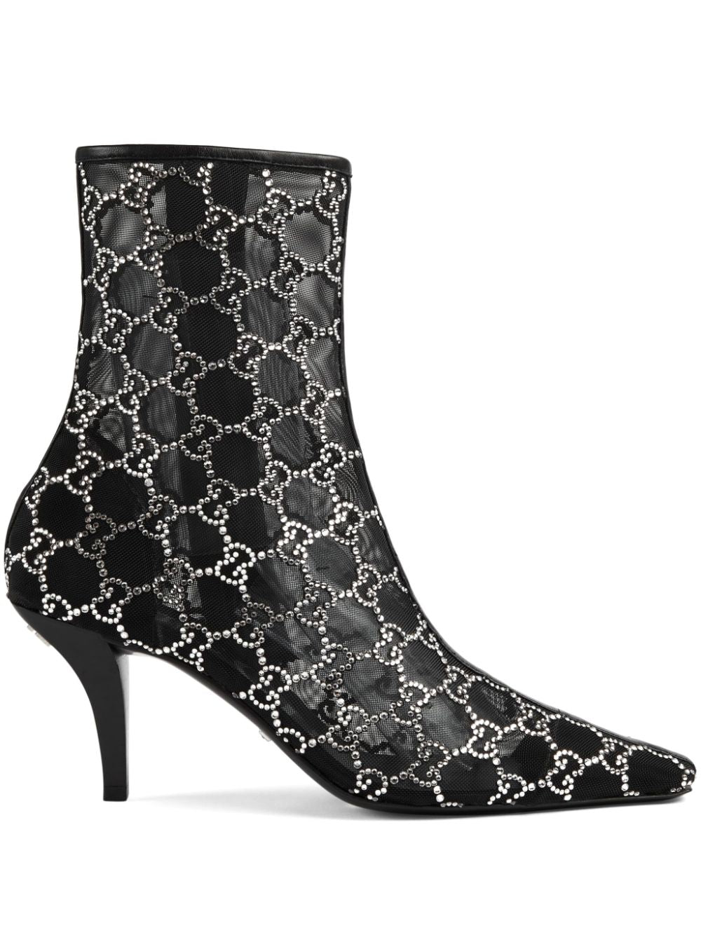 But na środku obcasy GG z Gucci z czarnym, skórzanym, kryształowym, klasycznym płótnem GG, przezroczystym designem, spiczastym palcem, mocowaniem z suwakiem, markową wkładką, wytłoczonym logo do tyłu, skórzanej podeszwy i rzeźbionej pięty.