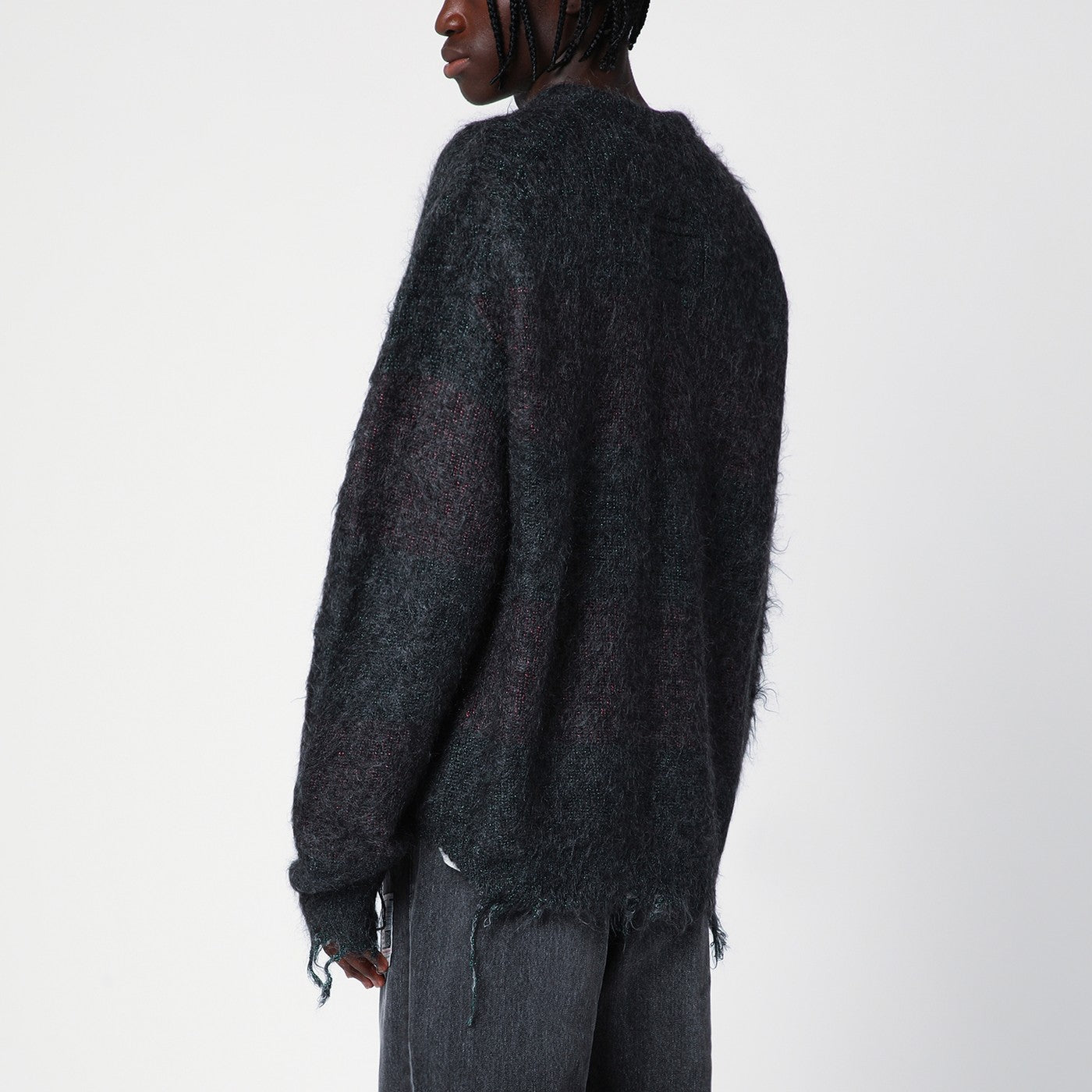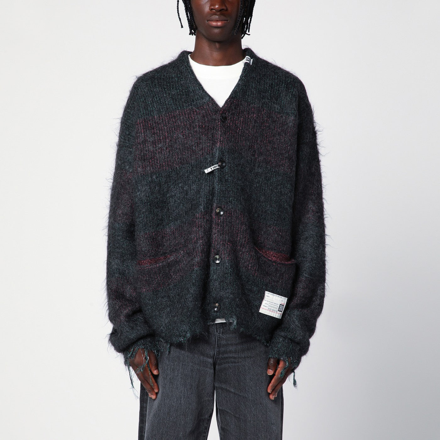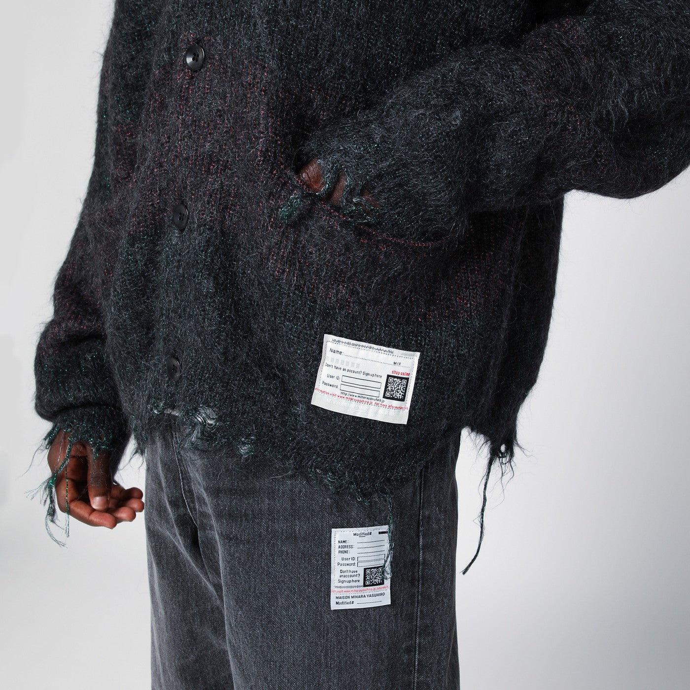 Ciemnoszary kardigan mieszanki Mohaira z Maison Mihara Yasuhiro z przednim guzikiem, długimi rękawami, dekoltem w stylu V, plastrem logo z przodu, dwie przednie kieszenie na przednich krawędziach i strzępione krawędzie.